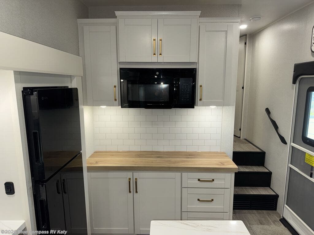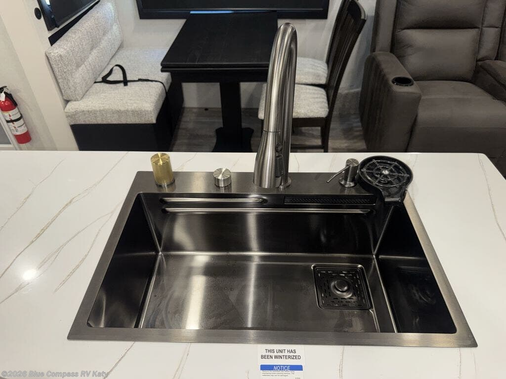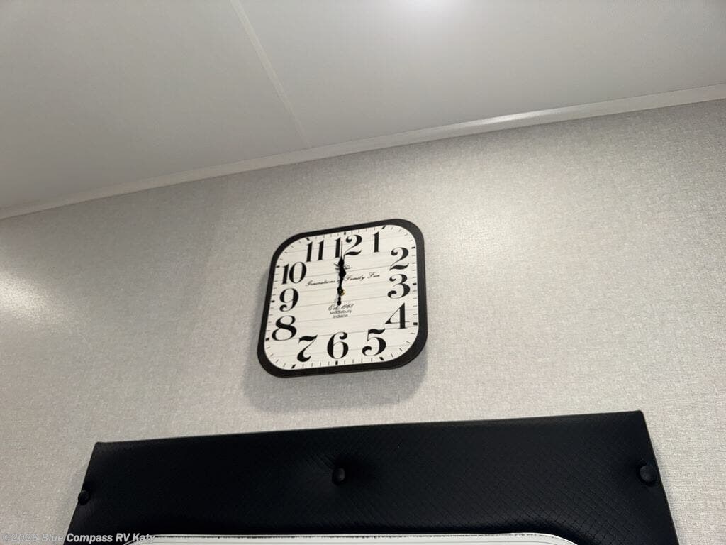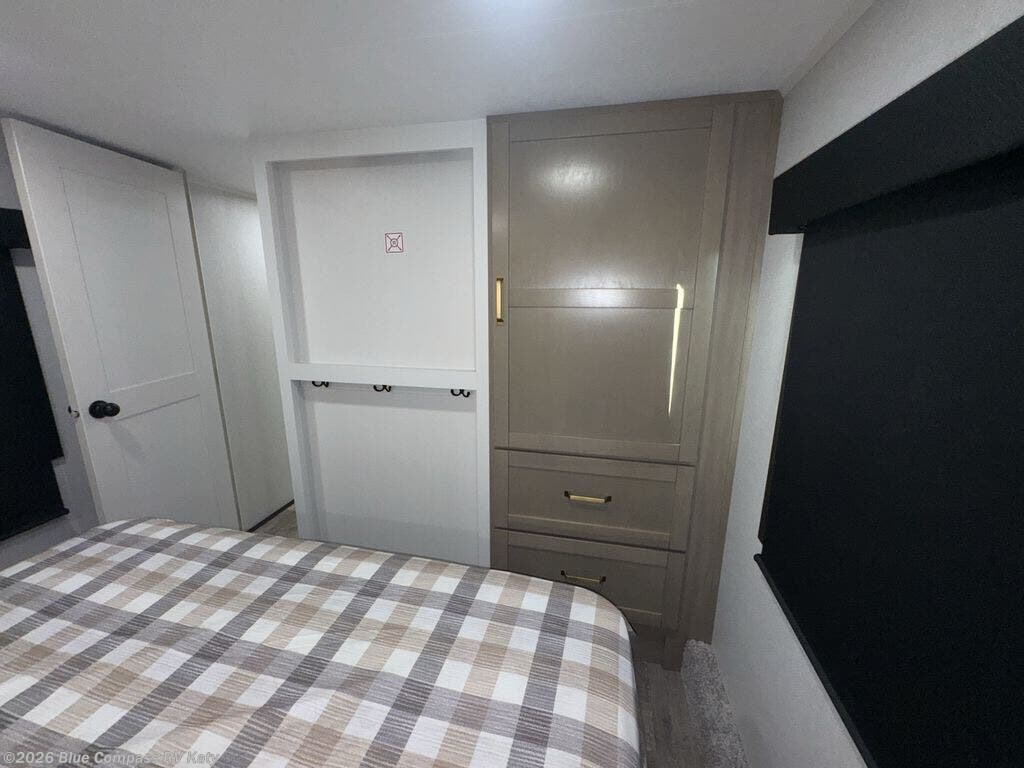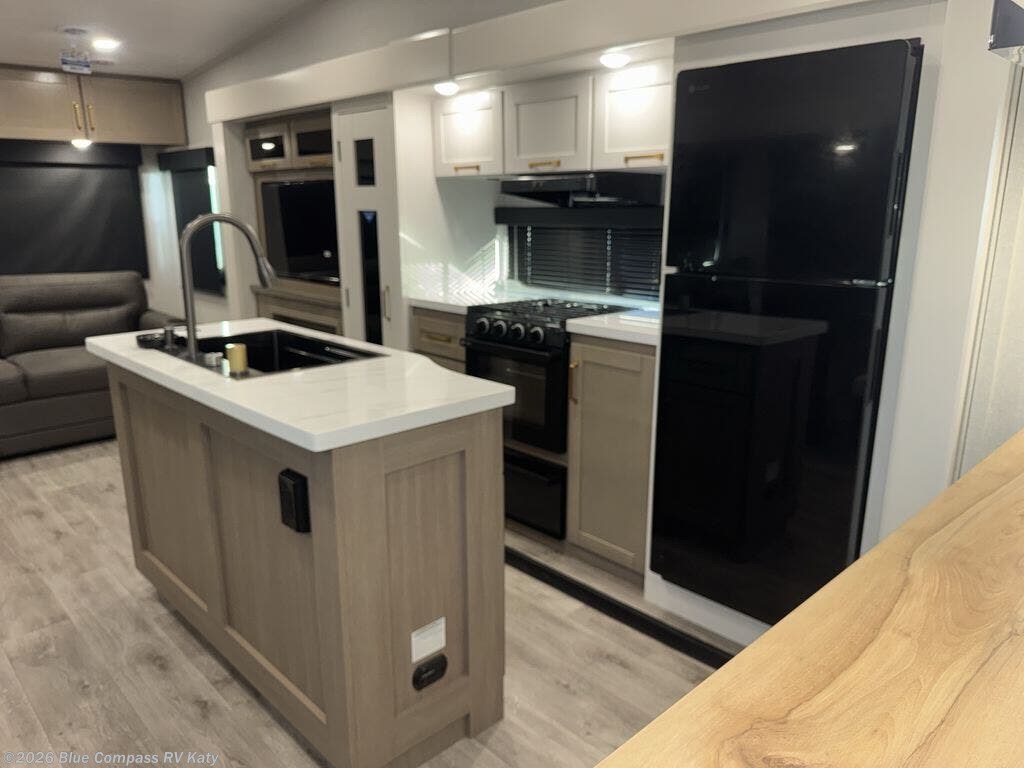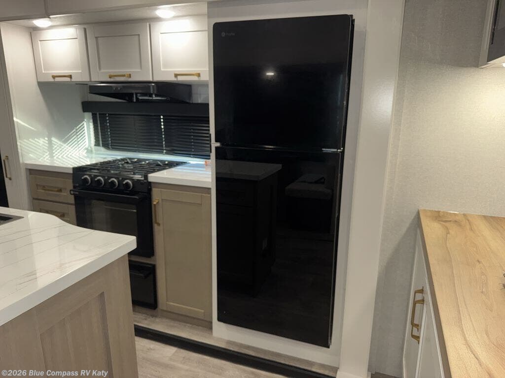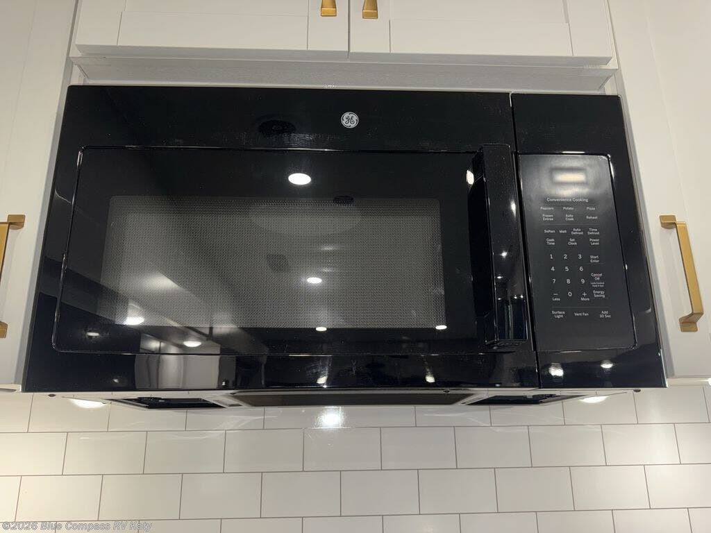 You will love how much interior space you have in this fifth wheel thanks to the dual opposing slides in the combined kitchen and living area! While your crew is relaxing on the theater seat or tri-fold sofa, you can prepare dinner on the GE black and stainless 21" range. There is also an entertainment center and fireplace across from the theater seat for easy viewing, and the table and chairs with a bench will be the perfect place to play a board game at. Head to the front to enjoy the private bedroom with an Olympic queen bed, and the full bath is close by for easy nighttime use!