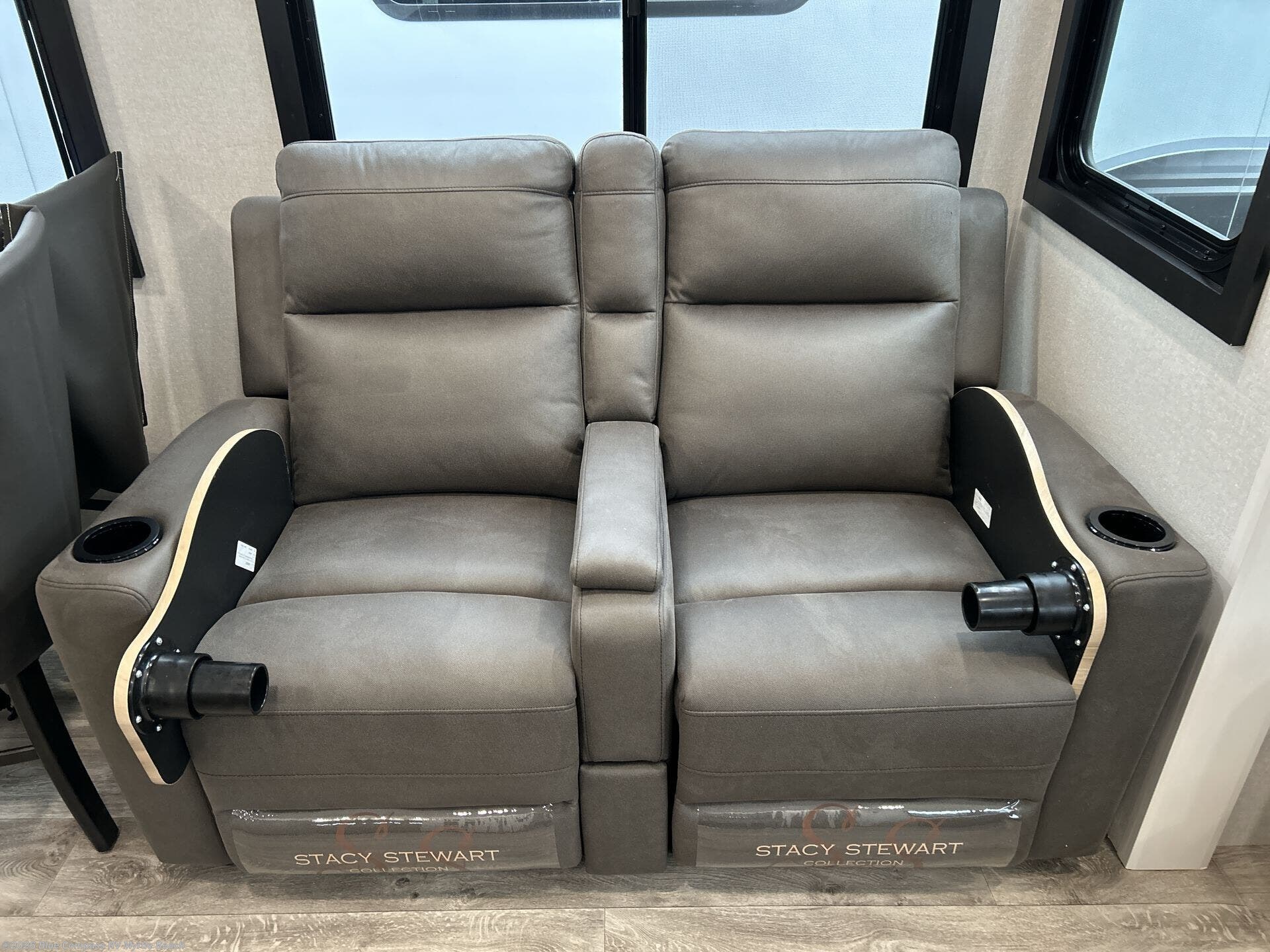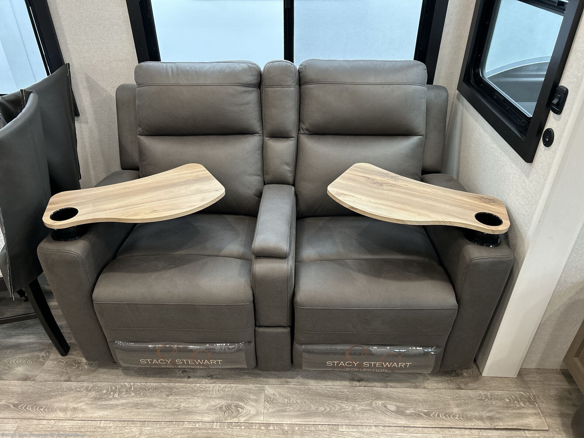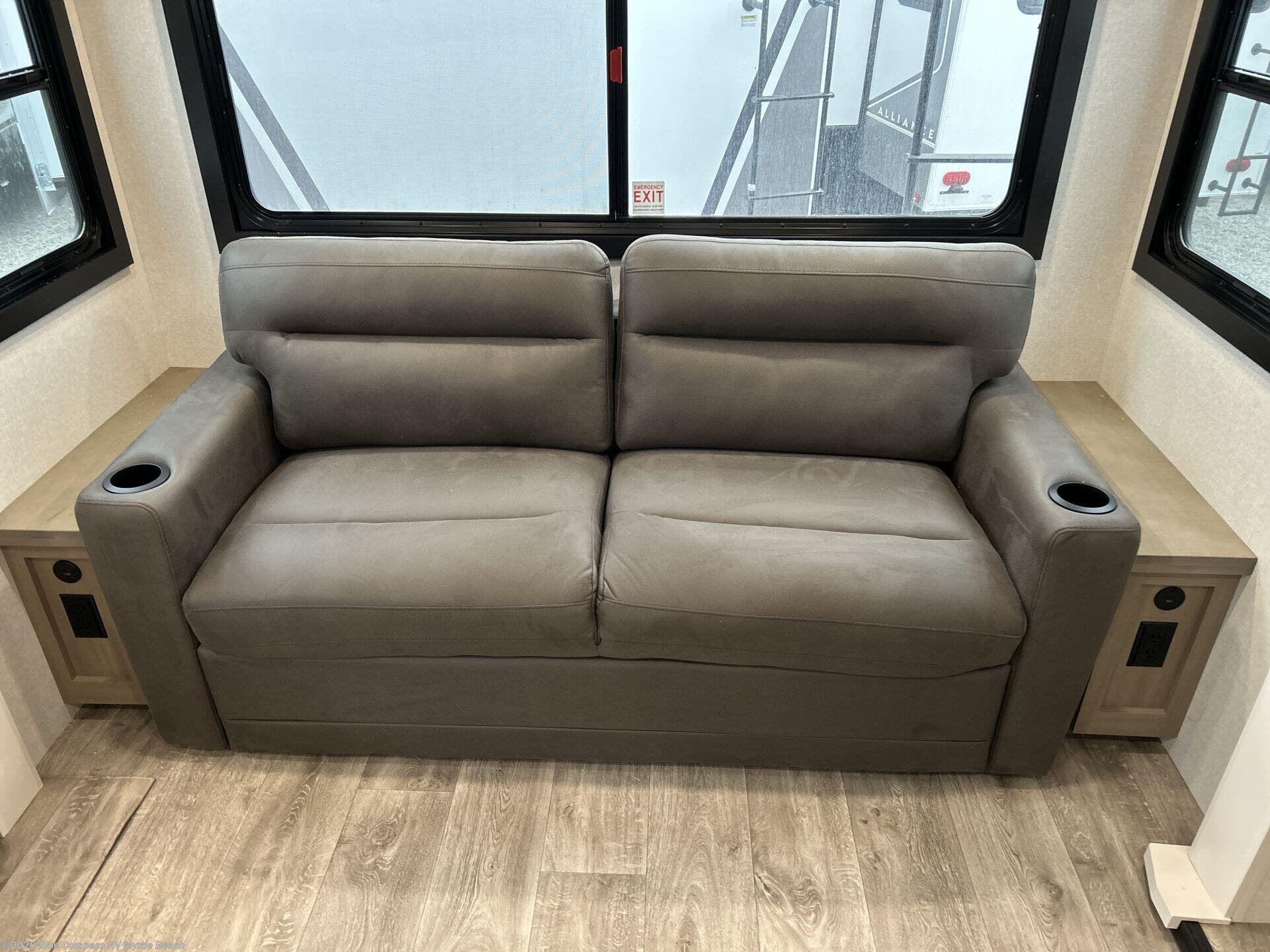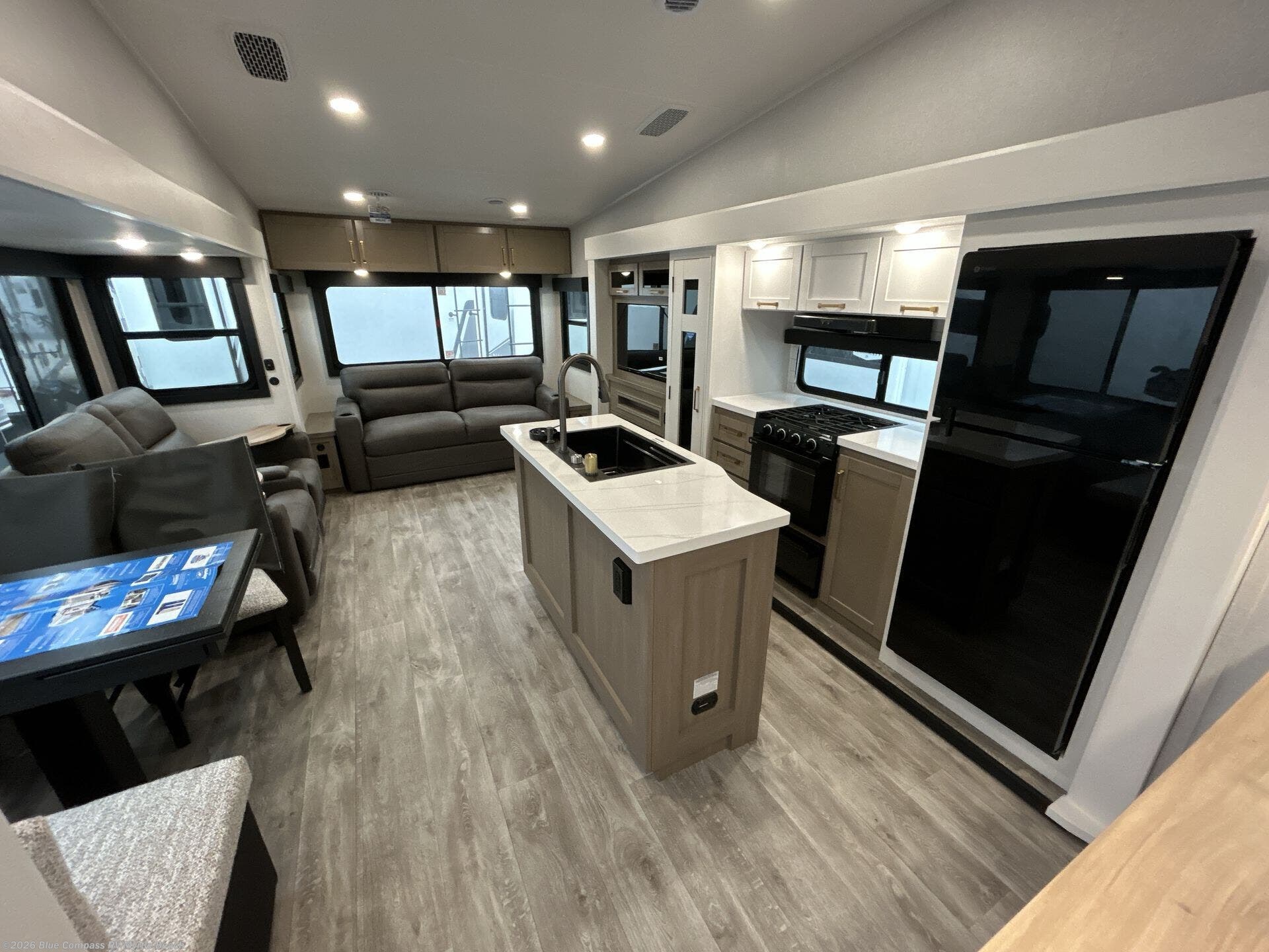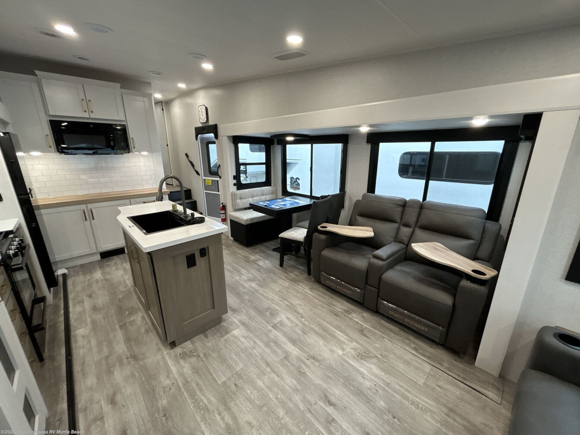 You will love how much interior space you have in this fifth wheel thanks to the dual opposing slides in the combined kitchen and living area! While your crew is relaxing on the theater seat or tri-fold sofa, you can prepare dinner on the GE black and stainless 21" range. There is also an entertainment center and fireplace across from the theater seat for easy viewing, and the table and chairs with a bench will be the perfect place to play a board game at. Head to the front to enjoy the private bedroom with an Olympic queen bed, and the full bath is close by for easy nighttime use!