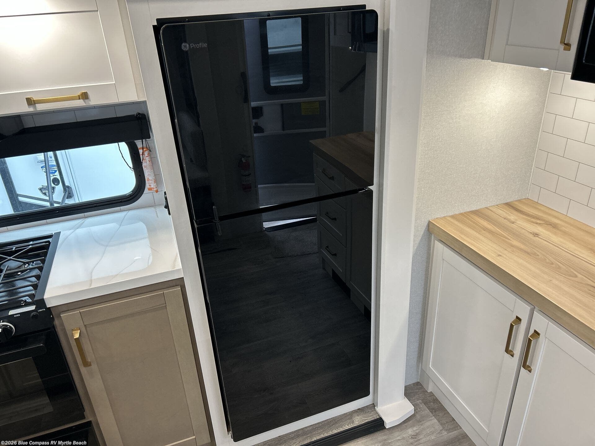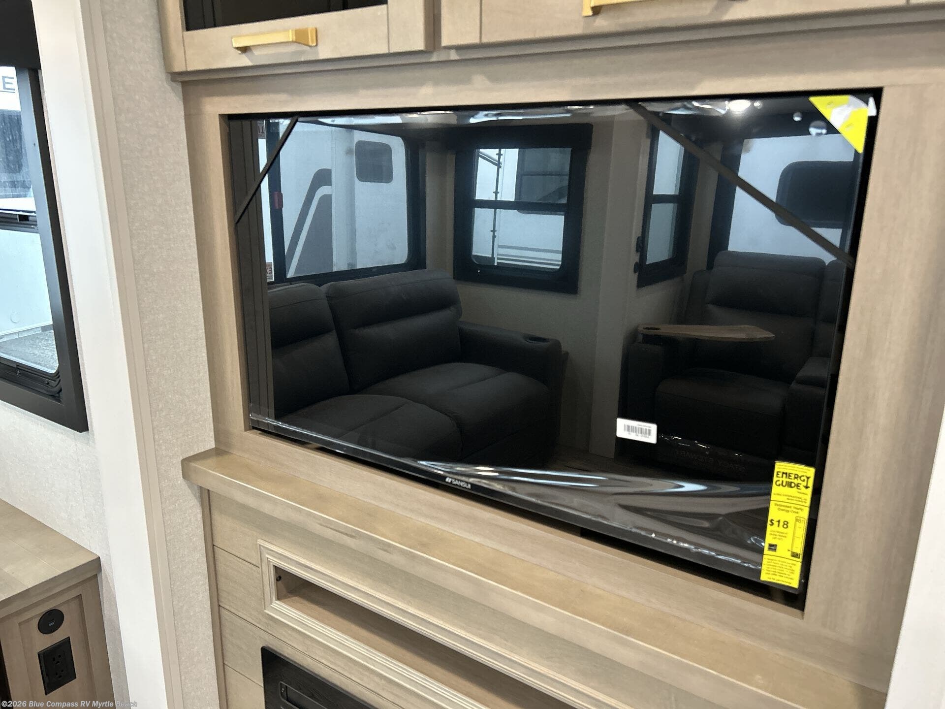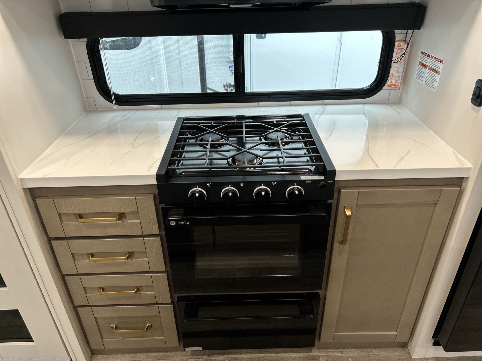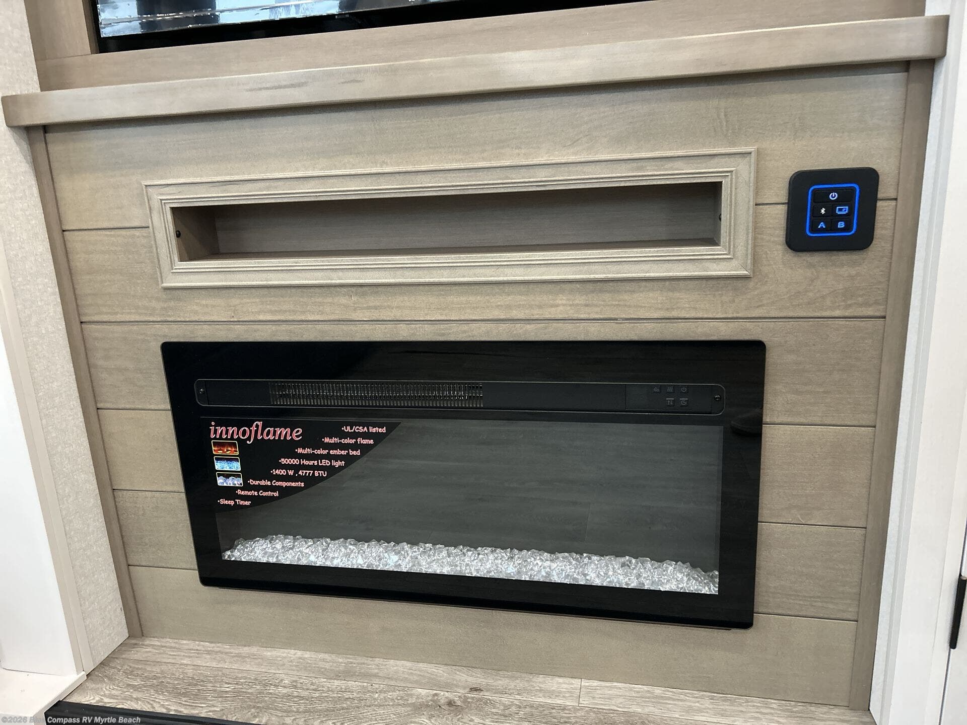 You will love how much interior space you have in this fifth wheel thanks to the dual opposing slides in the combined kitchen and living area! While your crew is relaxing on the theater seat or tri-fold sofa, you can prepare dinner on the GE black and stainless 21" range. There is also an entertainment center and fireplace across from the theater seat for easy viewing, and the table and chairs with a bench will be the perfect place to play a board game at. Head to the front to enjoy the private bedroom with an Olympic queen bed, and the full bath is close by for easy nighttime use!