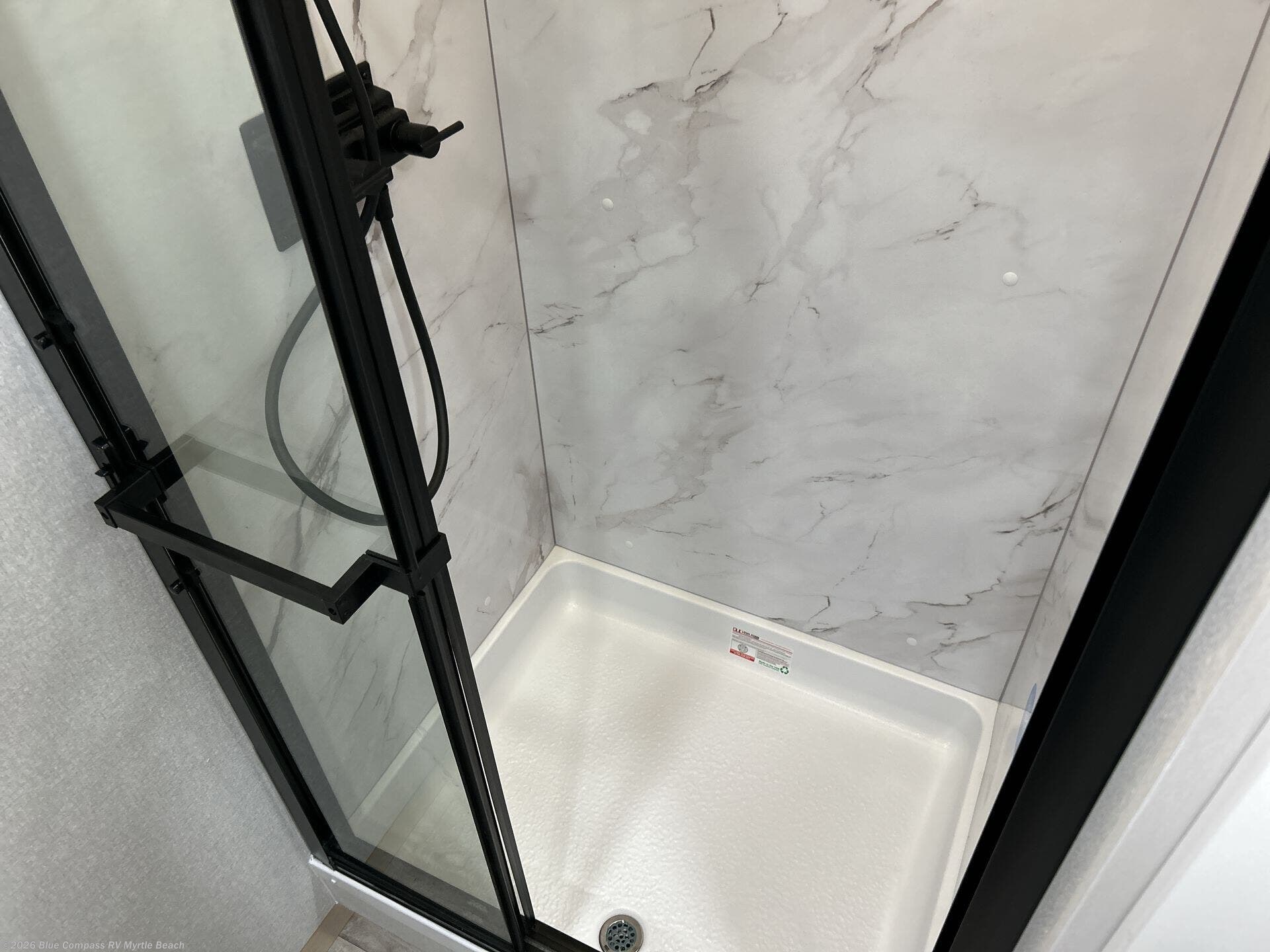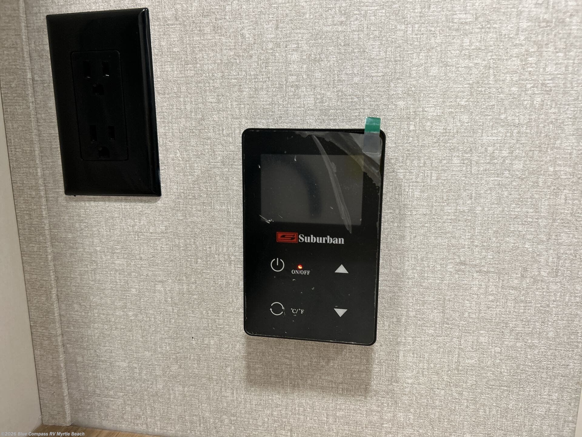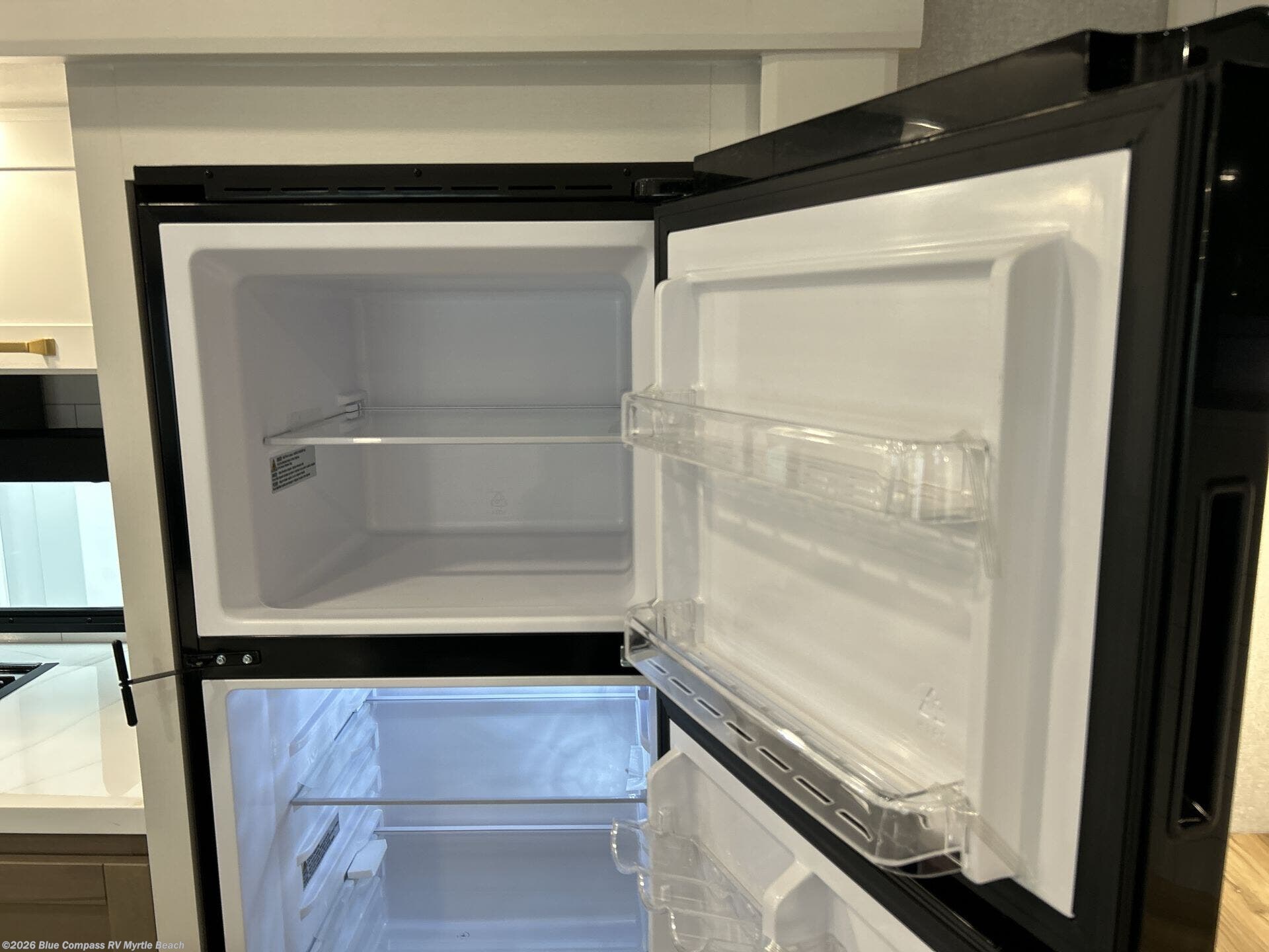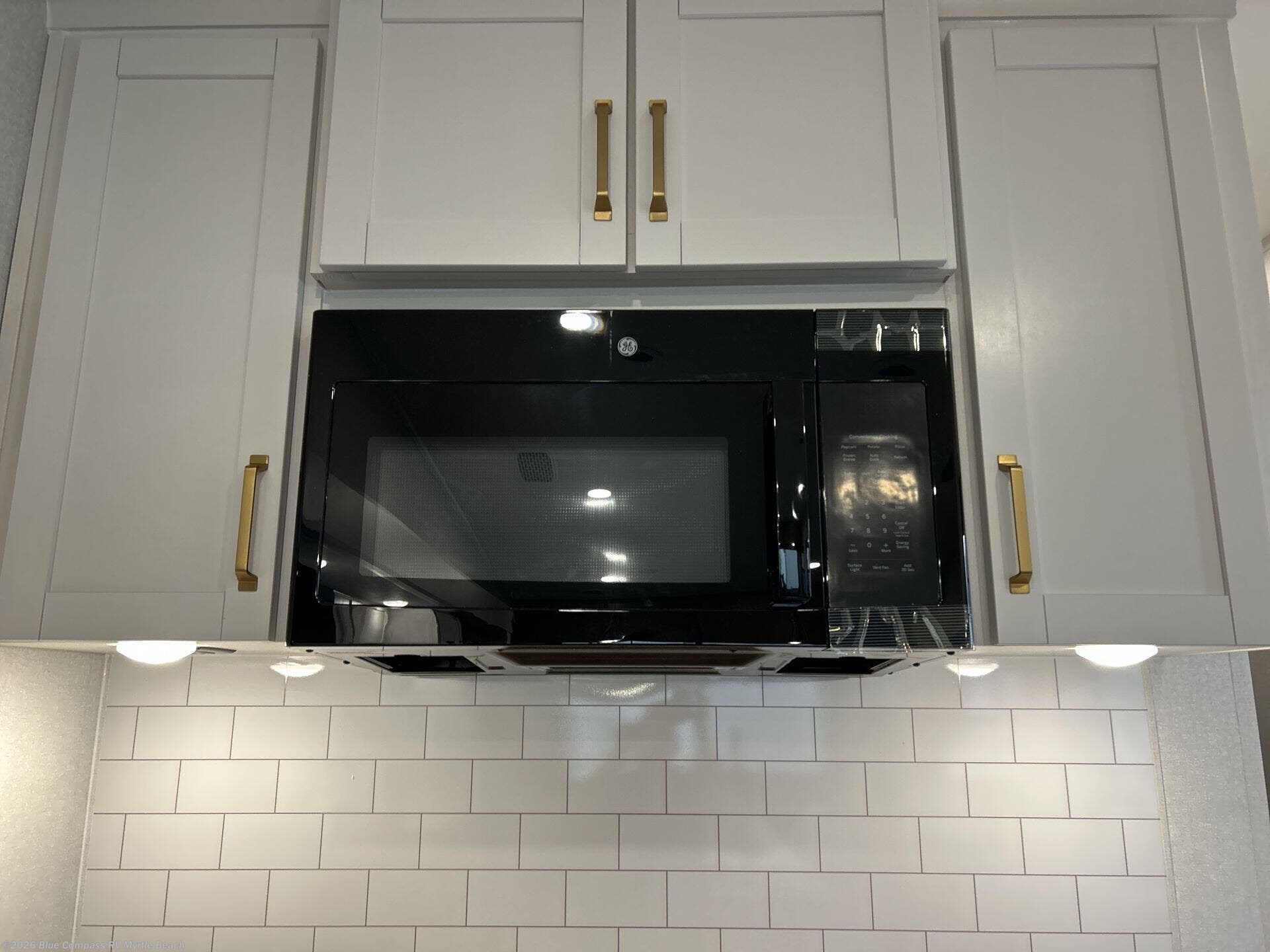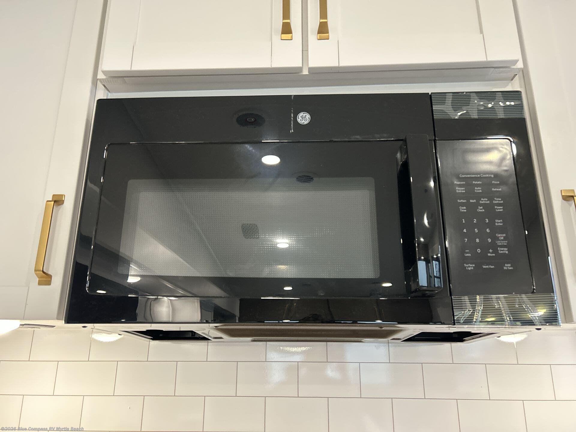 You will love how much interior space you have in this fifth wheel thanks to the dual opposing slides in the combined kitchen and living area! While your crew is relaxing on the theater seat or tri-fold sofa, you can prepare dinner on the GE black and stainless 21" range. There is also an entertainment center and fireplace across from the theater seat for easy viewing, and the table and chairs with a bench will be the perfect place to play a board game at. Head to the front to enjoy the private bedroom with an Olympic queen bed, and the full bath is close by for easy nighttime use!