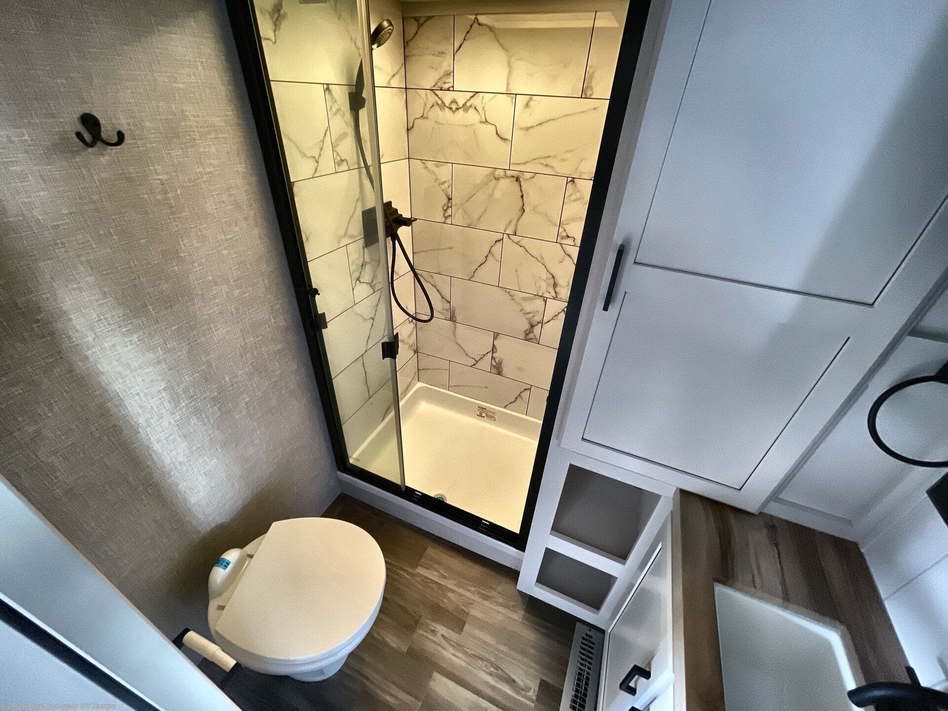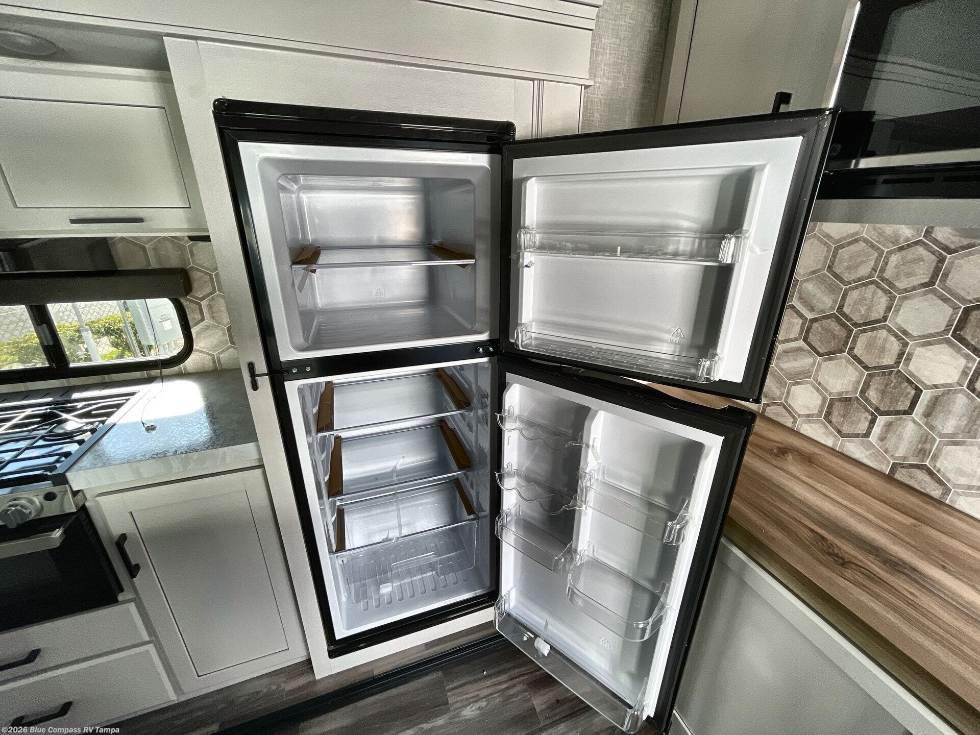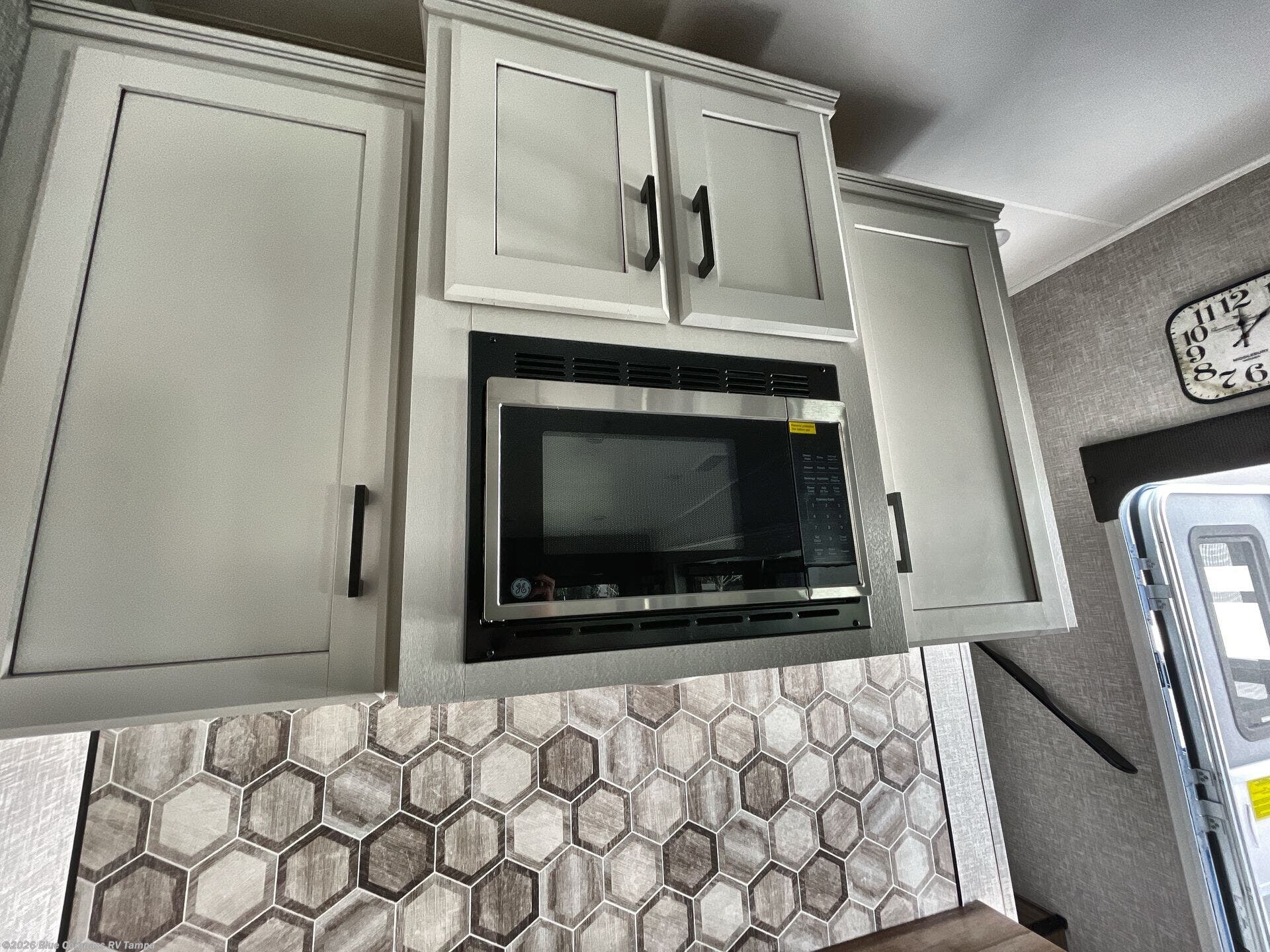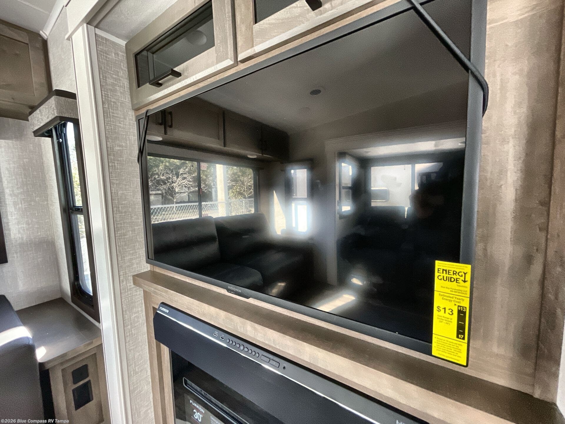 You will love how much interior space you have in this fifth wheel thanks to the dual opposing slides in the combined kitchen and living area! While your crew is relaxing on the theater seat or tri-fold sofa, you can prepare dinner on the GE black and stainless 21" range. There is also an entertainment center and fireplace across from the theater seat for easy viewing, and the table and chairs with a bench will be the perfect place to play a board game at. Head to the front to enjoy the private bedroom with an Olympic queen bed, and the full bath is close by for easy nighttime use!