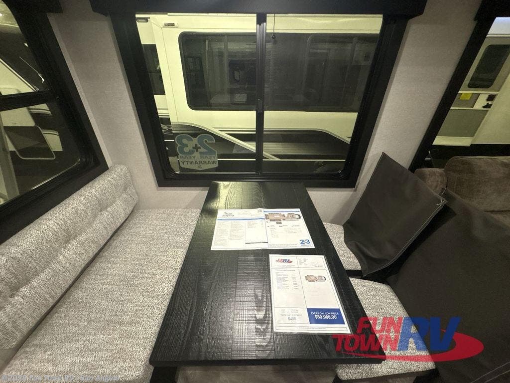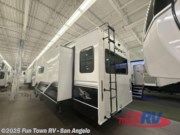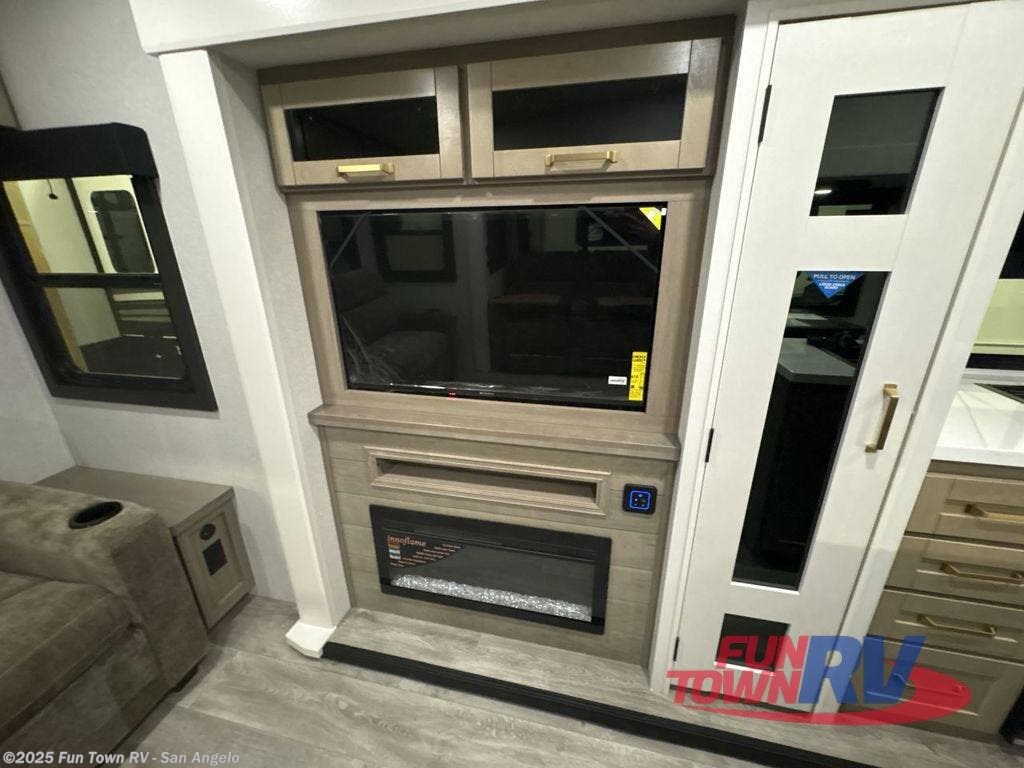 Pack your bags and head off on adventure in this spacious fifth wheel for four! The dual opposing slides in the kitchen and main living area will give your crew more space to relax. Speaking of relaxing, there is a theater seat across from the fireplace and TV plus a tri-fold sofa to make it a movie night. This unit includes a kitchen island with an All-In-One sink for easy cleaning, a hutch with added storage, plus a GE 10 cu. ft. 12V refrigerator. The front master bedroom includes an Olympic queen bed, dual wardrobes plus a third wardrobe within the bedroom slide out, and TV prep if you want the option to watch a show in bed!