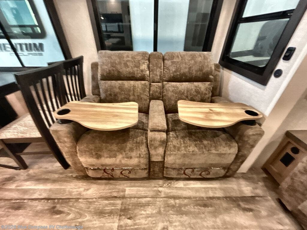 Pack your bags and head off on adventure in this spacious fifth wheel for four! The dual opposing slides in the kitchen and main living area will give your crew more space to relax. Speaking of relaxing, there is a theater seat across from the fireplace and TV plus a tri-fold sofa to make it a movie night. This unit includes a kitchen island with an All-In-One sink for easy cleaning, a hutch with added storage, plus a GE 10 cu. ft. 12V refrigerator. The front master bedroom includes an Olympic queen bed, dual wardrobes plus a third wardrobe within the bedroom slide out, and TV prep if you want the option to watch a show in bed!