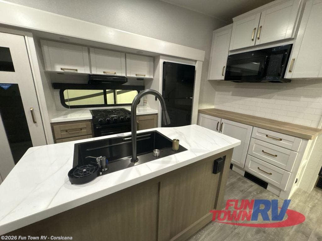 Pack your bags and head off on adventure in this spacious fifth wheel for four! The dual opposing slides in the kitchen and main living area will give your crew more space to relax. Speaking of relaxing, there is a theater seat across from the fireplace and TV plus a tri-fold sofa to make it a movie night. This unit includes a kitchen island with an All-In-One sink for easy cleaning, a hutch with added storage, plus a GE 10 cu. ft. 12V refrigerator. The front master bedroom includes an Olympic queen bed, dual wardrobes plus a third wardrobe within the bedroom slide out, and TV prep if you want the option to watch a show in bed!