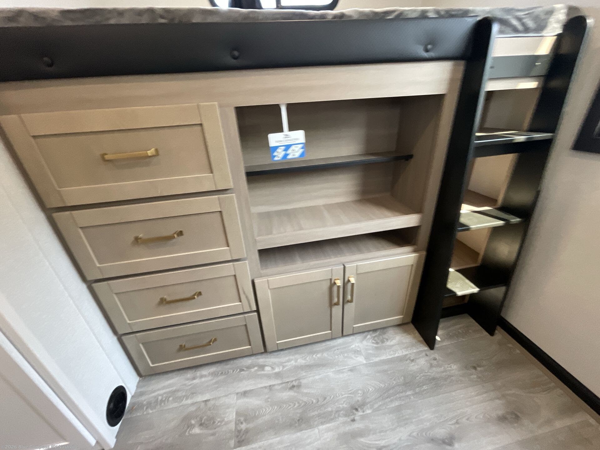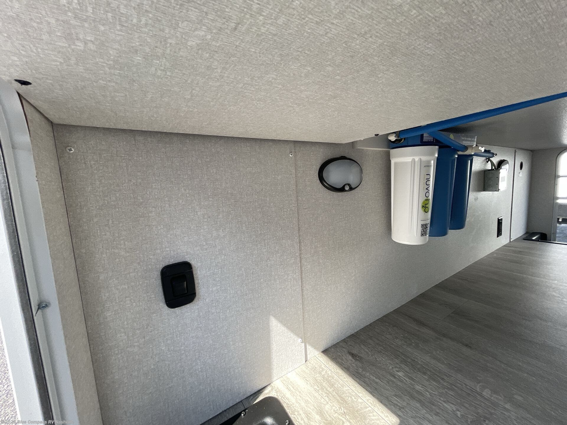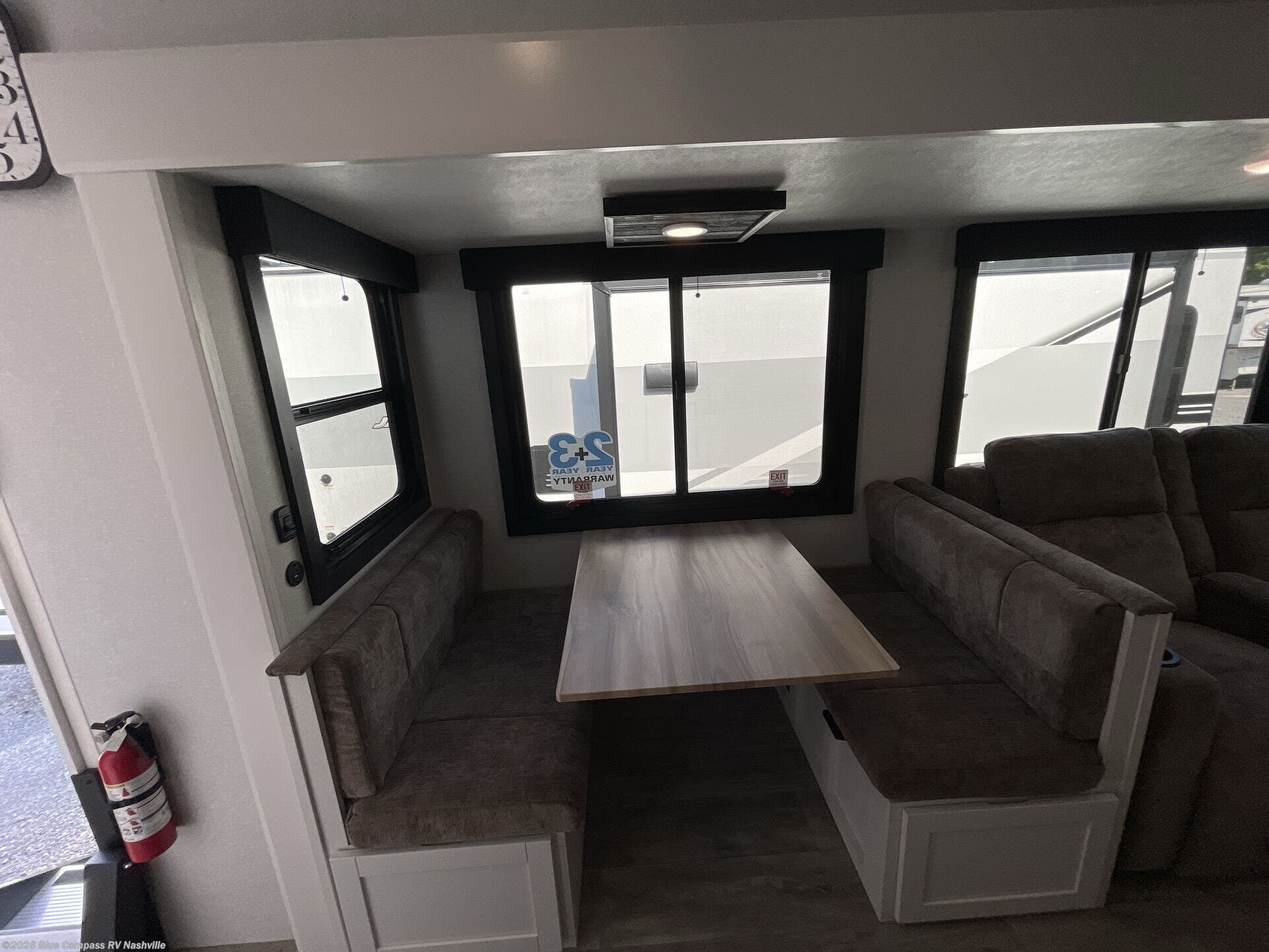 This travel trailer is perfect for your larger group or family! There is a rear private bunkhouse with two bunks, a tri-fold sofa, plus a slide out for more space. You will have the front private bedroom all to yourselves with a queen bed, and any other guests can sleep on the tri-fold sofa and booth dinette! There is also a wardrobe/linen closet with washer and dryer prep if you plan to add a washer and dyer for convenience. The chef can prepare their best meals with the kitchen island and will enjoy having two hutches to store the essentials. They could even cook at the outside kitchen to breathe in some fresh air and enjoy the beautiful scenery!