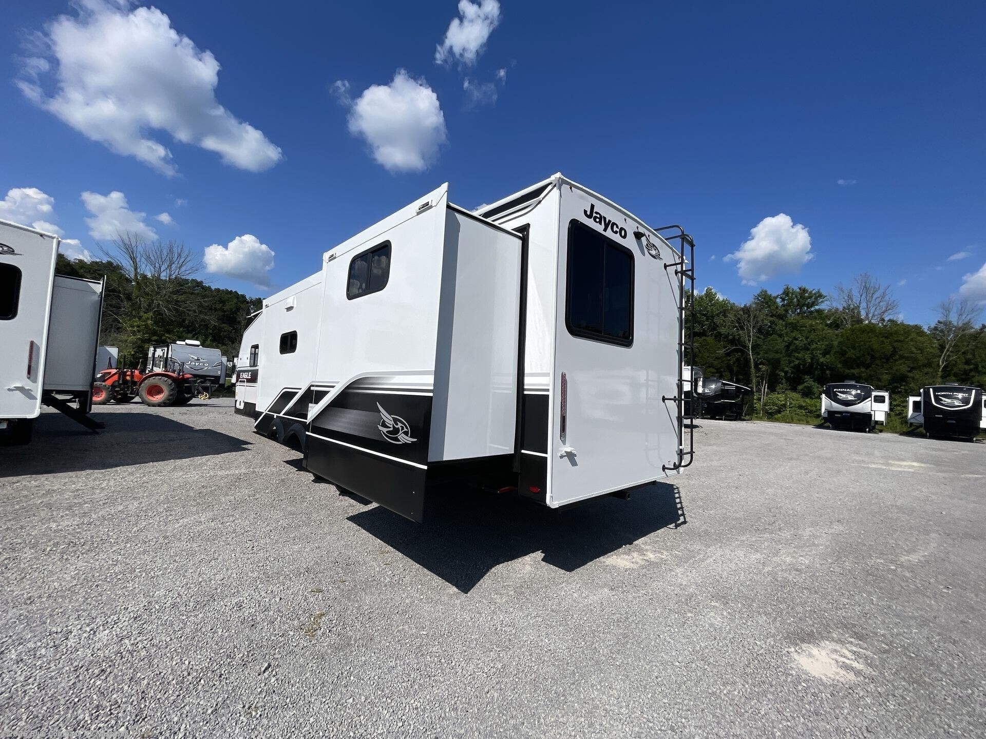 With any Eagle HT fifth wheel or travel trailer by Jayco you will enjoy a smooth drive thanks to the 4 Star Handling Package and MORryde CRE-3000 rubberized suspension. The Customer Value Package includes amenities that are sure to make camping easier than ever, like the 60K on-demand water heater, Keyed-Alike lock system, 15,000 BTU "Whisper Quiet" A/C, and more. Handcrafted door/drawer fronts will make your space feel more like home, along with residential vinyl flooring throughout, GE appliances, and blackout roller shades with reflective side throughout to keep the sun out when you want to sleep in. Each model also includes a NuVo H2O water treatment system with filters included, interior and exterior "Blue Sync" audio connect with MB Quart Sound for your TV and phone, and 100% no floor vents for added comfort and convenience!