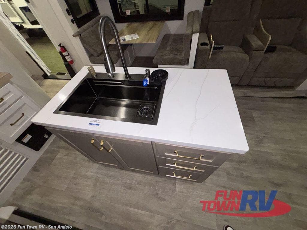 This travel trailer is perfect for your larger group or family! There is a rear private bunkhouse with two bunks, a tri-fold sofa, plus a slide out for more space. You will have the front private bedroom all to yourselves with a queen bed, and any other guests can sleep on the tri-fold sofa and booth dinette! There is also a wardrobe/linen closet with washer and dryer prep if you plan to add a washer and dyer for convenience. The chef can prepare their best meals with the kitchen island and will enjoy having two hutches to store the essentials. They could even cook at the outside kitchen to breathe in some fresh air and enjoy the beautiful scenery!