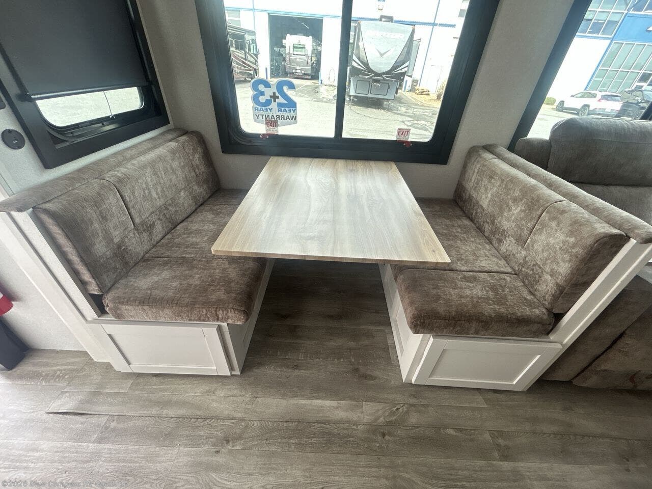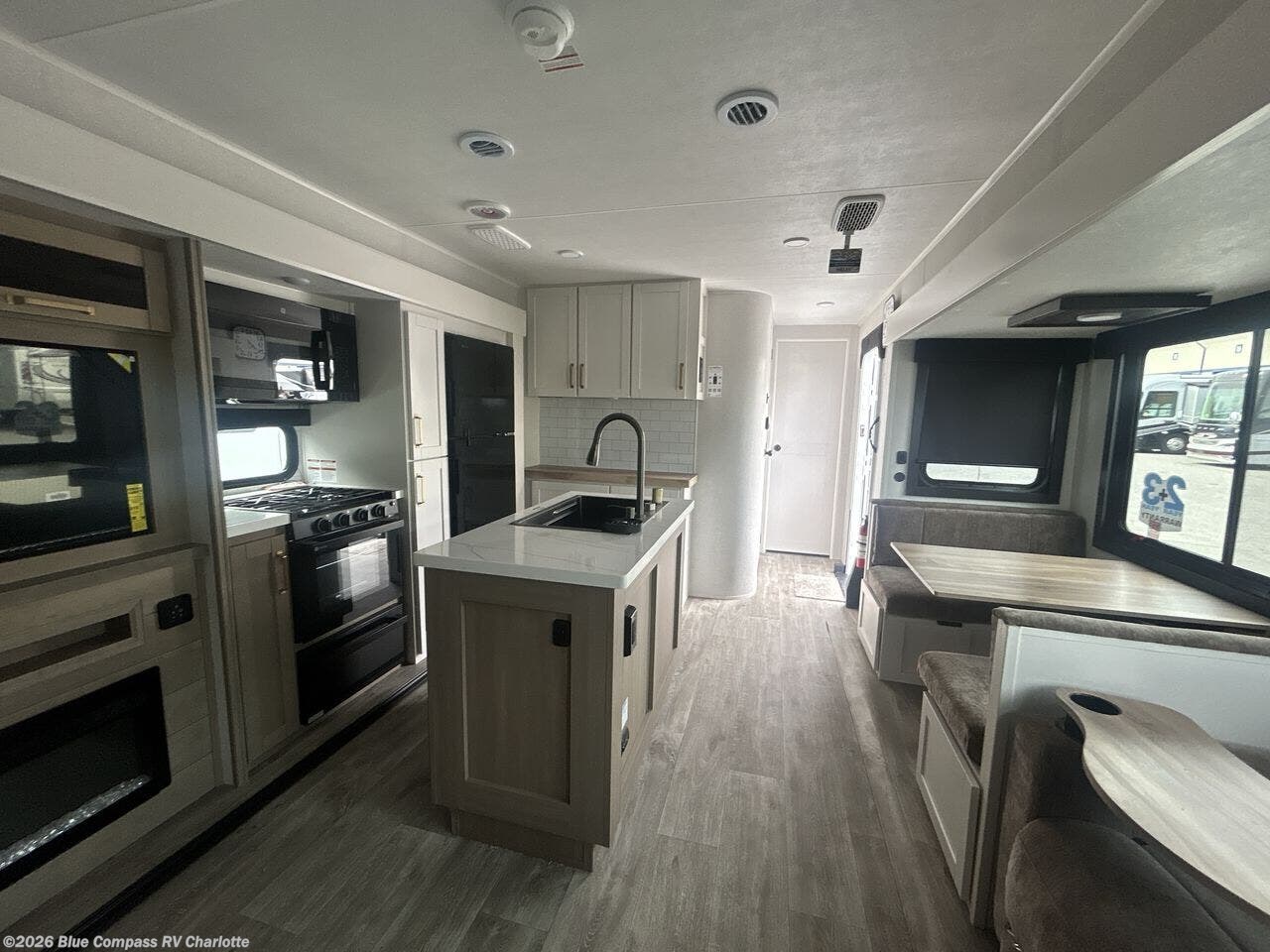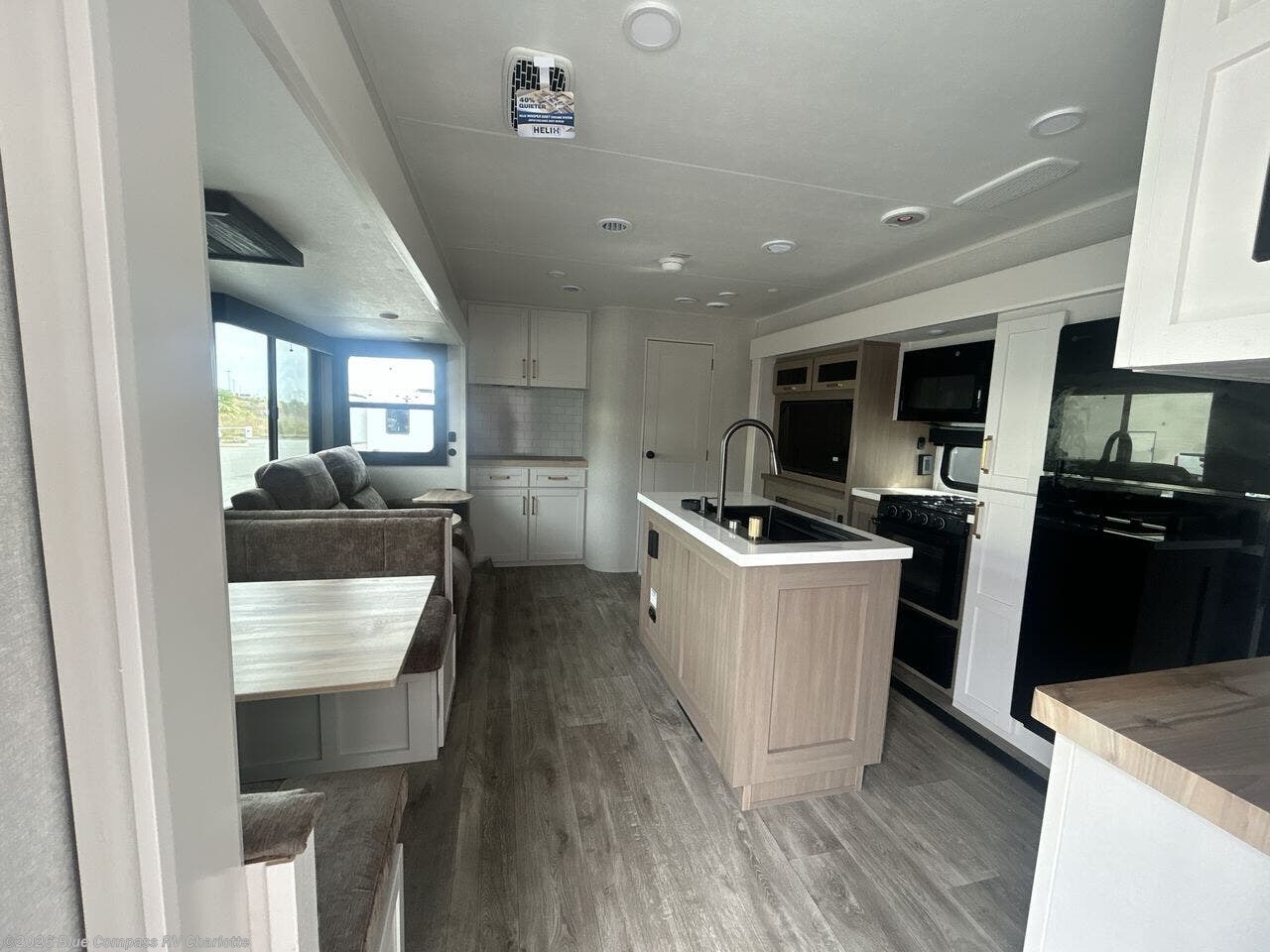 This travel trailer is perfect for your larger group or family! There is a rear private bunkhouse with two bunks, a tri-fold sofa, plus a slide out for more space. You will have the front private bedroom all to yourselves with a queen bed, and any other guests can sleep on the tri-fold sofa and booth dinette! There is also a wardrobe/linen closet with washer and dryer prep if you plan to add a washer and dyer for convenience. The chef can prepare their best meals with the kitchen island and will enjoy having two hutches to store the essentials. They could even cook at the outside kitchen to breathe in some fresh air and enjoy the beautiful scenery!