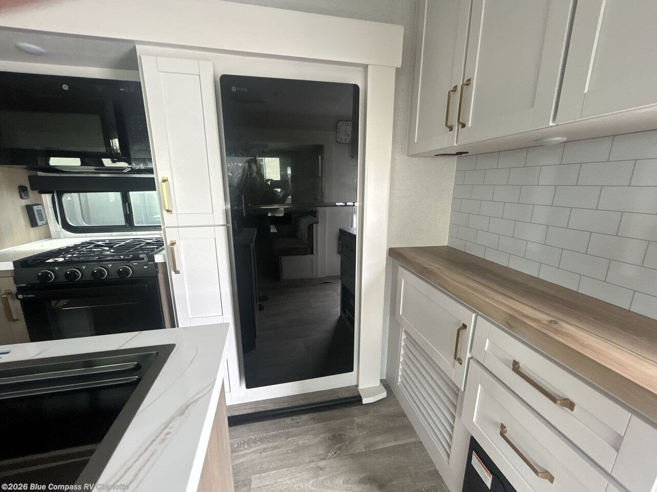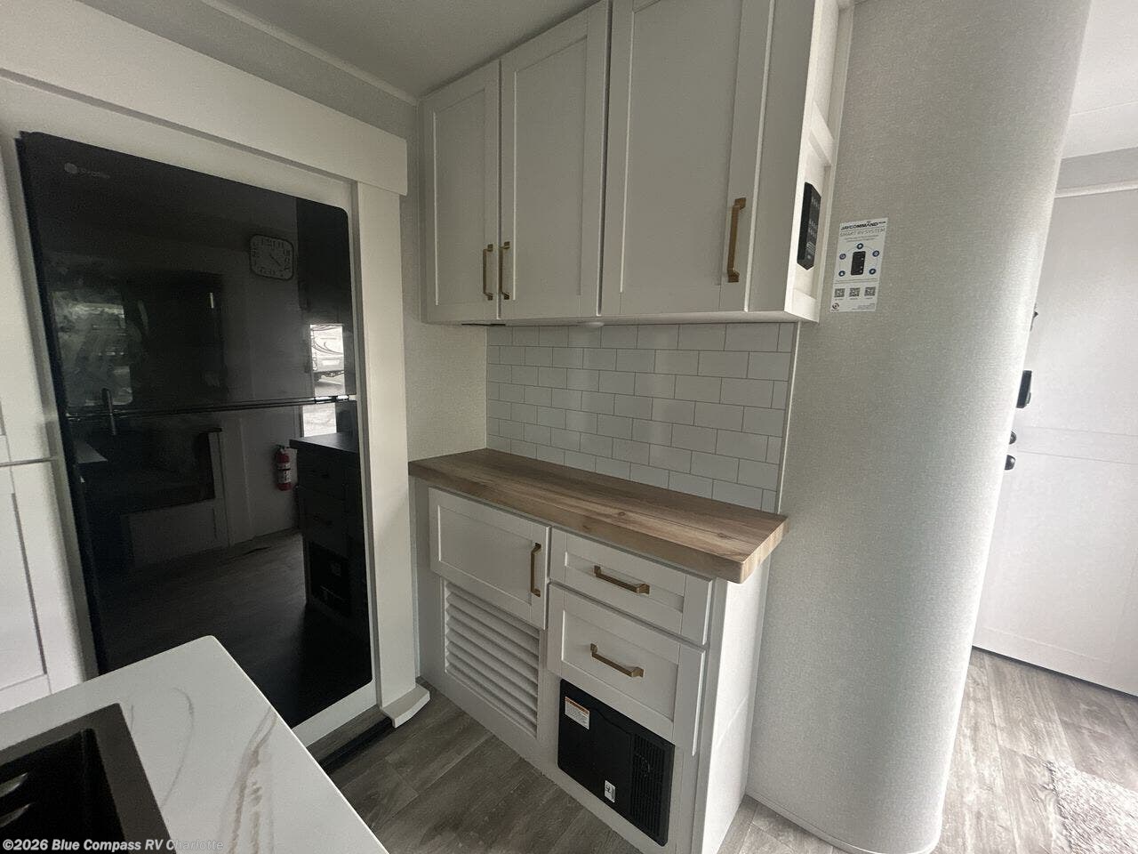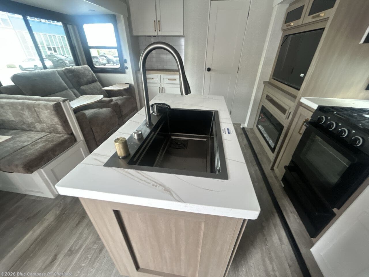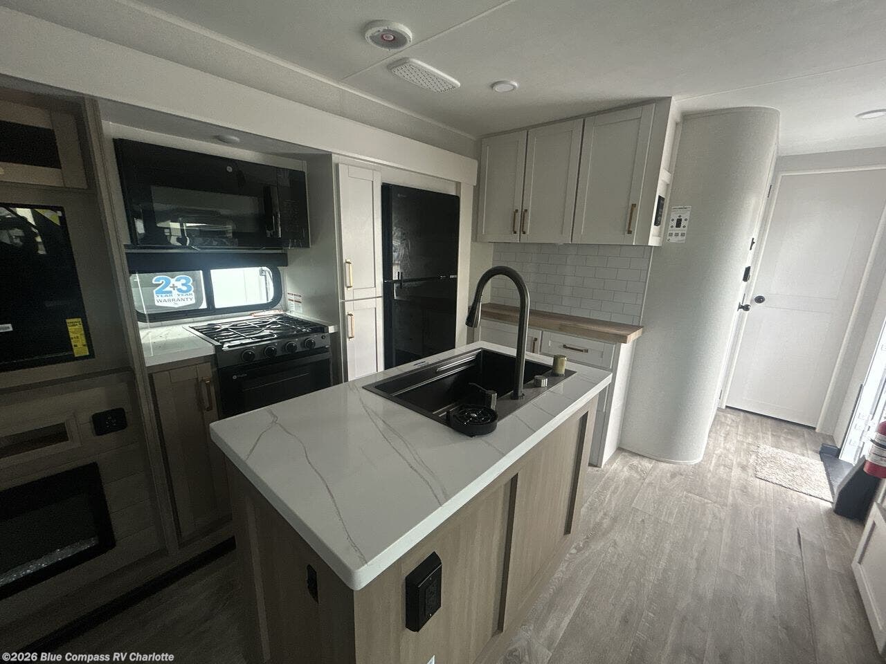 This travel trailer is perfect for your larger group or family! There is a rear private bunkhouse with two bunks, a tri-fold sofa, plus a slide out for more space. You will have the front private bedroom all to yourselves with a queen bed, and any other guests can sleep on the tri-fold sofa and booth dinette! There is also a wardrobe/linen closet with washer and dryer prep if you plan to add a washer and dyer for convenience. The chef can prepare their best meals with the kitchen island and will enjoy having two hutches to store the essentials. They could even cook at the outside kitchen to breathe in some fresh air and enjoy the beautiful scenery!