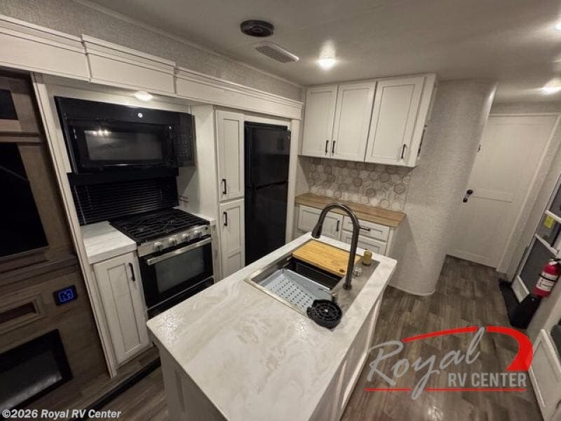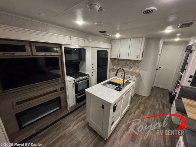 This travel trailer is perfect for your larger group or family! There is a rear private bunkhouse with two bunks, a tri-fold sofa, plus a slide out for more space. You will have the front private bedroom all to yourselves with a queen bed, and any other guests can sleep on the tri-fold sofa and booth dinette! There is also a wardrobe/linen closet with washer and dryer prep if you plan to add a washer and dyer for convenience. The chef can prepare their best meals with the kitchen island and will enjoy having two hutches to store the essentials. They could even cook at the outside kitchen to breathe in some fresh air and enjoy the beautiful scenery!