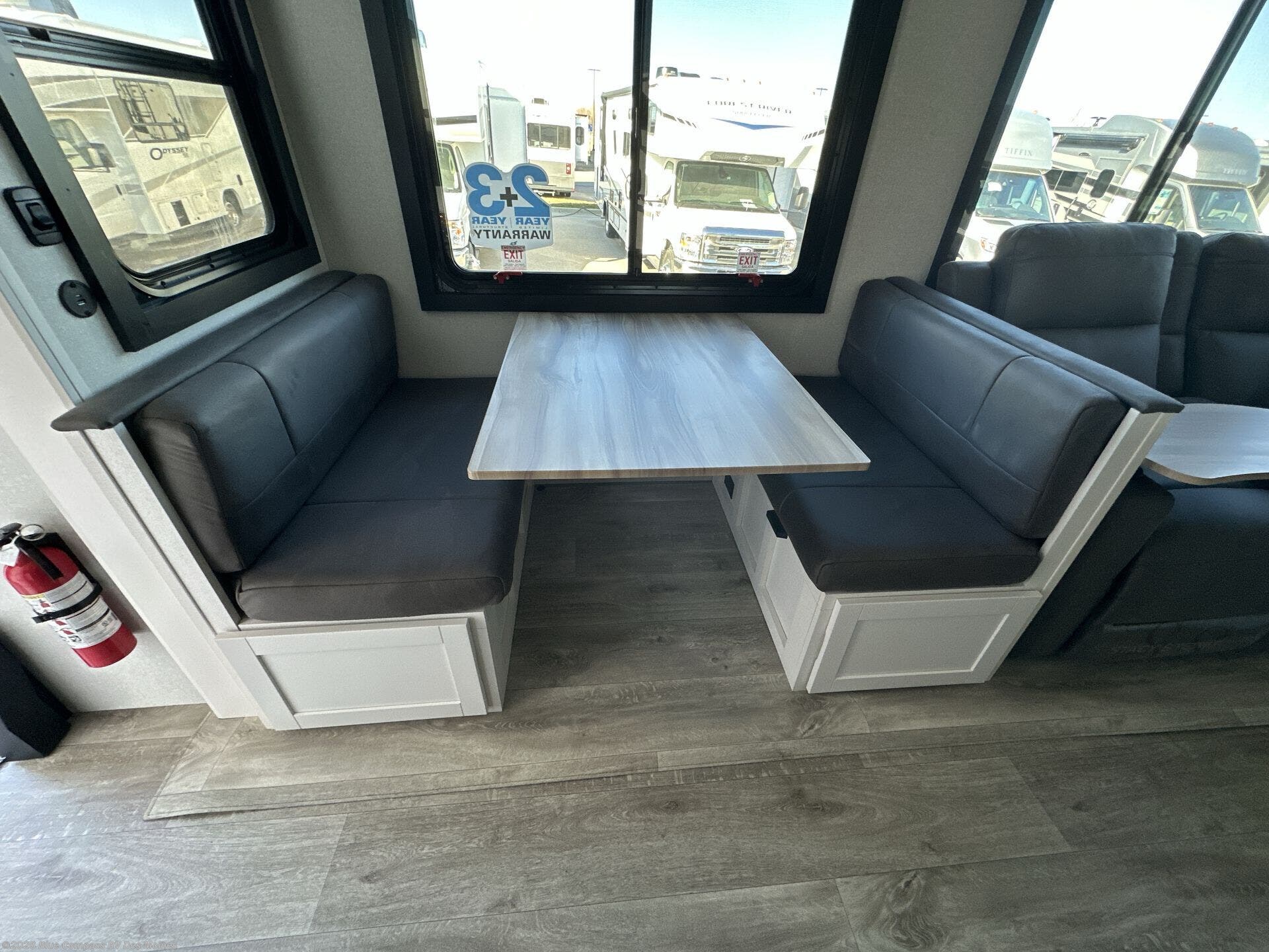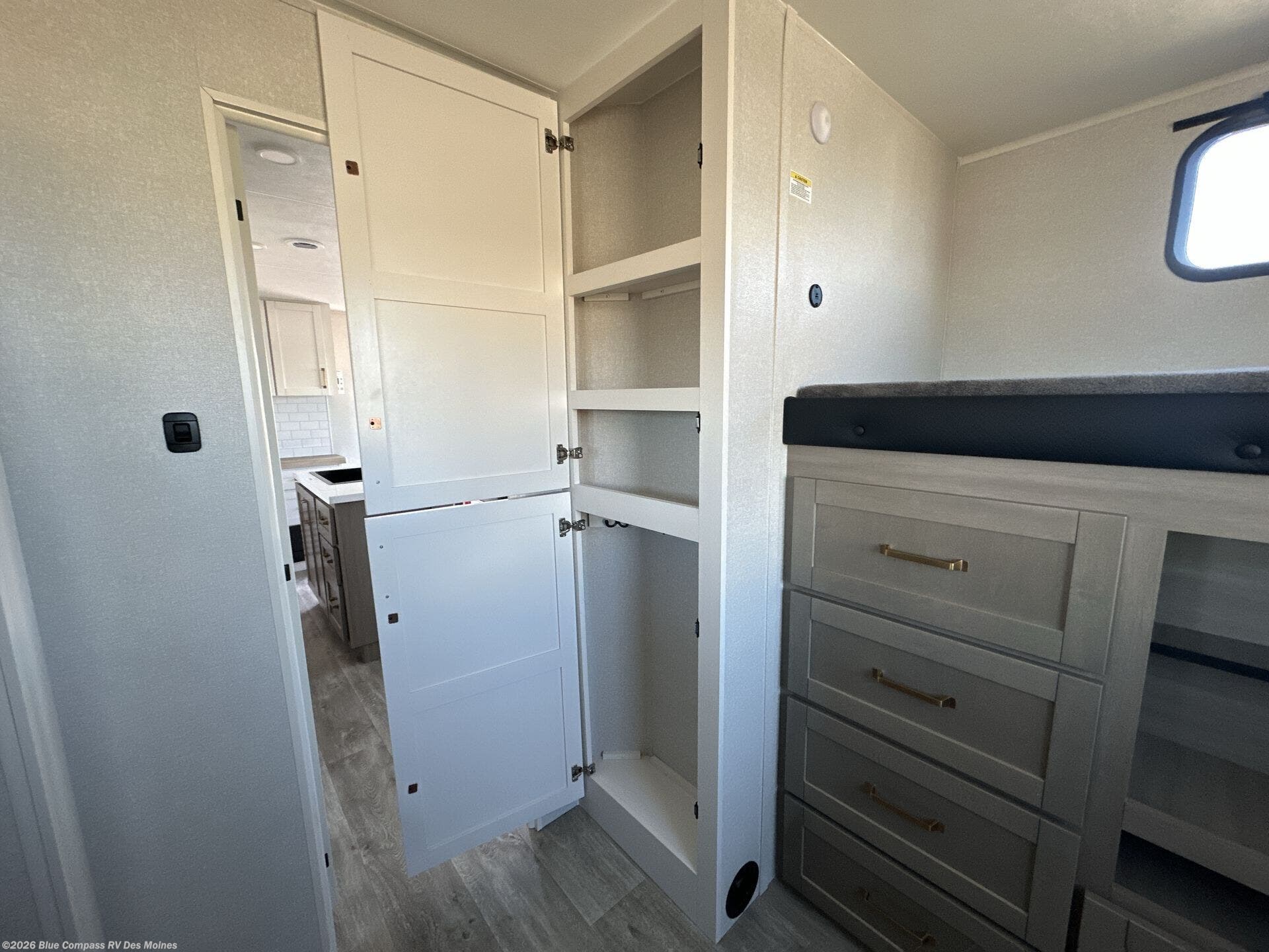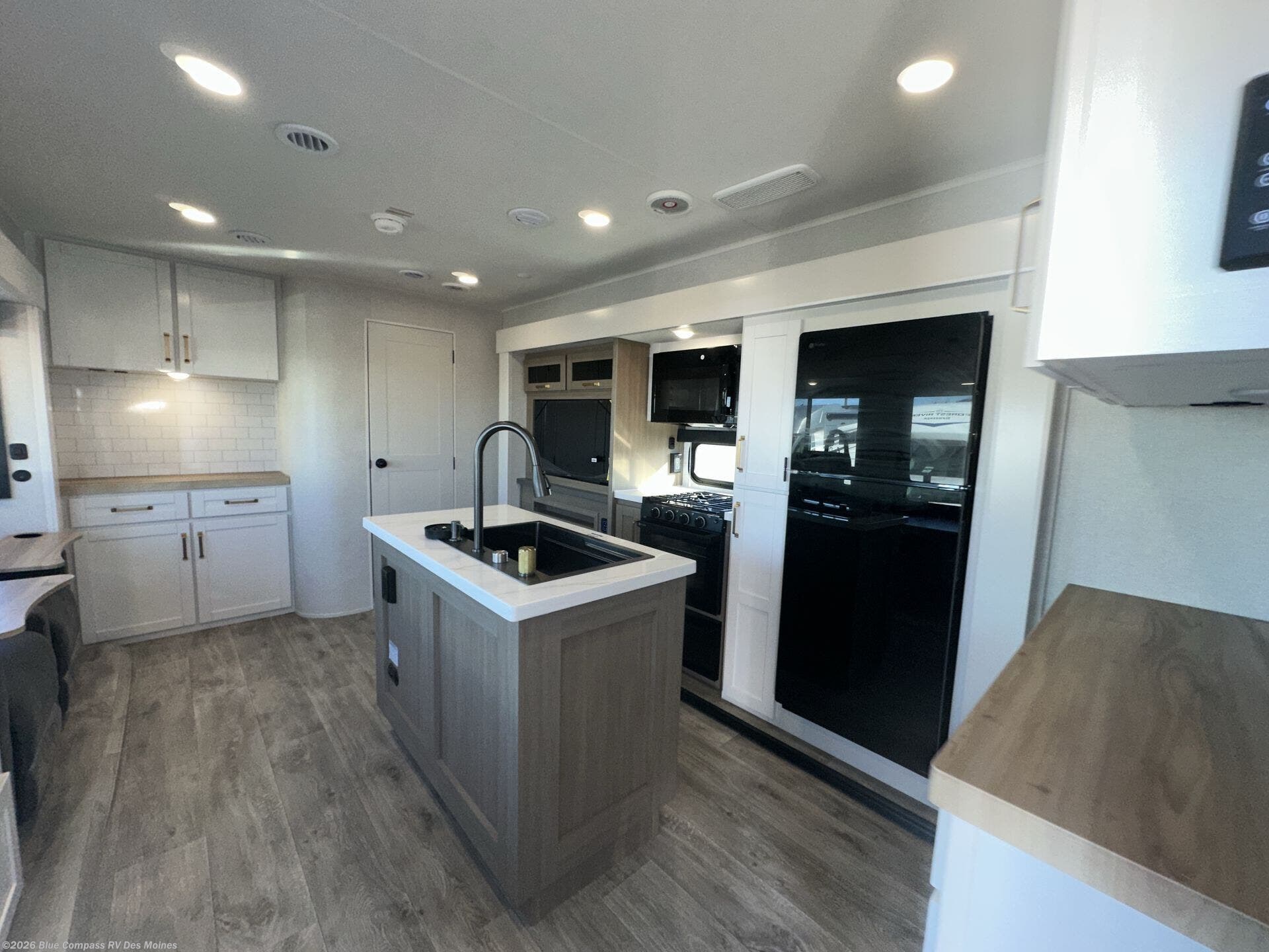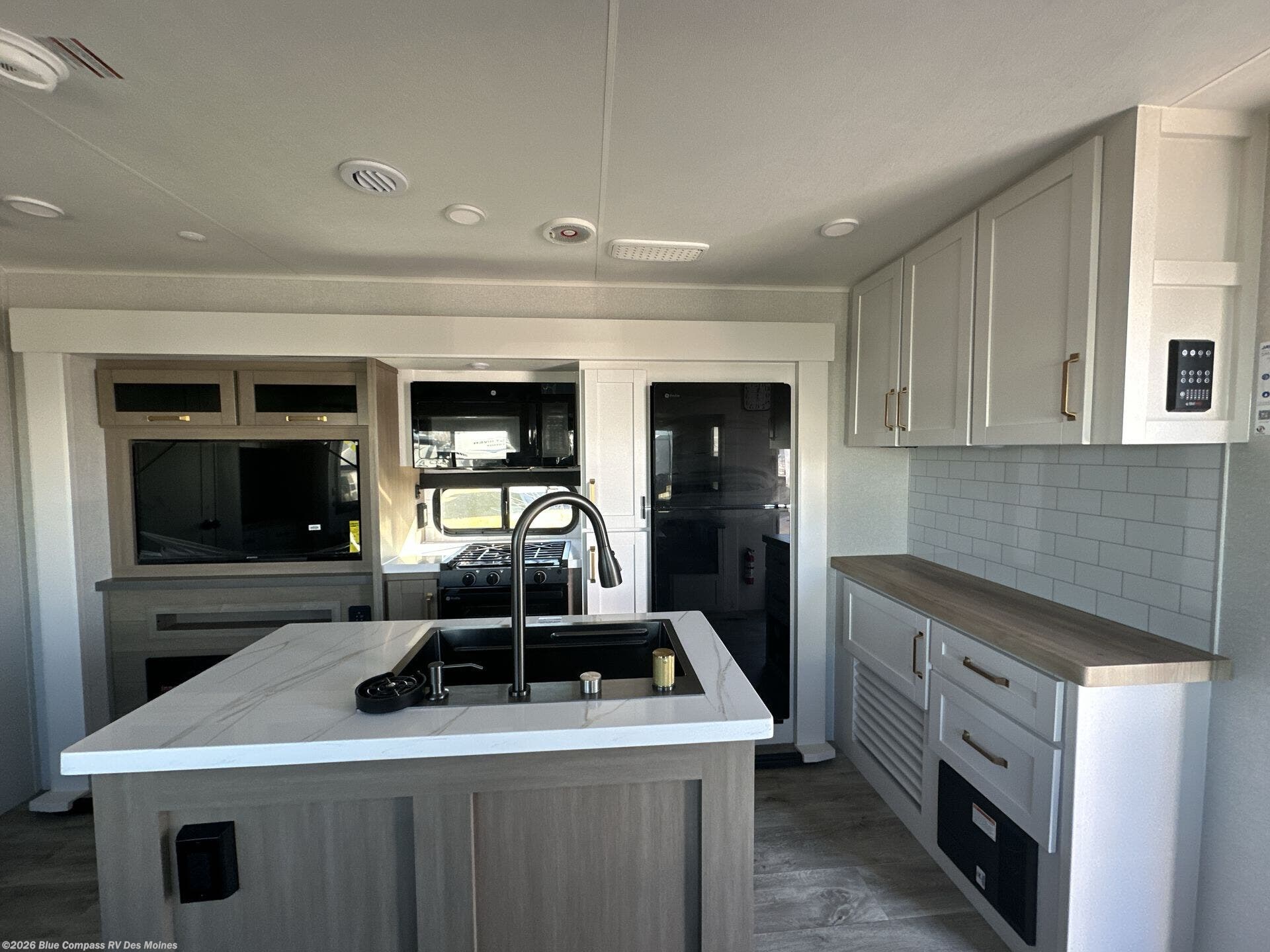 This travel trailer is perfect for your larger group or family! There is a rear private bunkhouse with two bunks, a tri-fold sofa, plus a slide out for more space. You will have the front private bedroom all to yourselves with a queen bed, and any other guests can sleep on the tri-fold sofa and booth dinette! There is also a wardrobe/linen closet with washer and dryer prep if you plan to add a washer and dyer for convenience. The chef can prepare their best meals with the kitchen island and will enjoy having two hutches to store the essentials. They could even cook at the outside kitchen to breathe in some fresh air and enjoy the beautiful scenery!