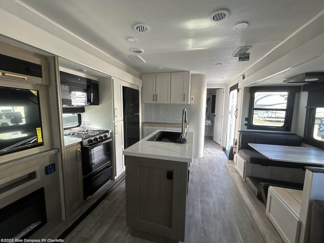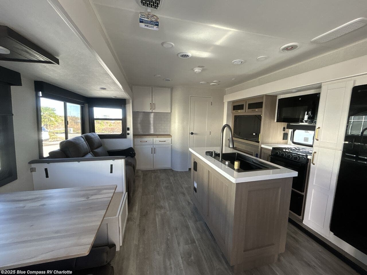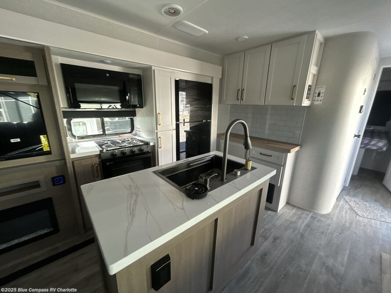 This travel trailer is perfect for your larger group or family! There is a rear private bunkhouse with two bunks, a tri-fold sofa, plus a slide out for more space. You will have the front private bedroom all to yourselves with a queen bed, and any other guests can sleep on the tri-fold sofa and booth dinette! There is also a wardrobe/linen closet with washer and dryer prep if you plan to add a washer and dyer for convenience. The chef can prepare their best meals with the kitchen island and will enjoy having two hutches to store the essentials. They could even cook at the outside kitchen to breathe in some fresh air and enjoy the beautiful scenery!