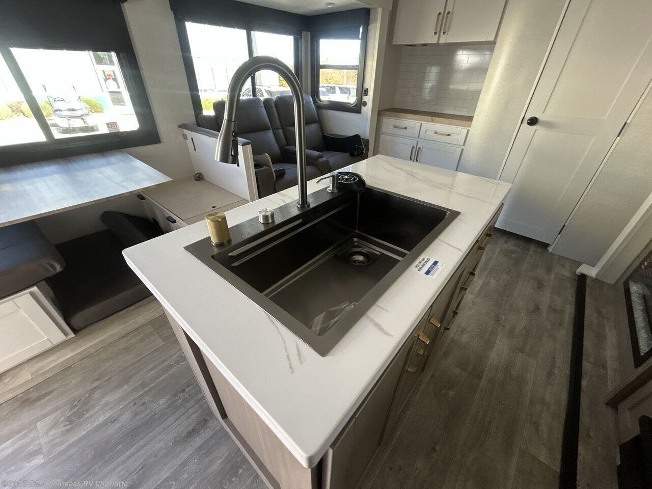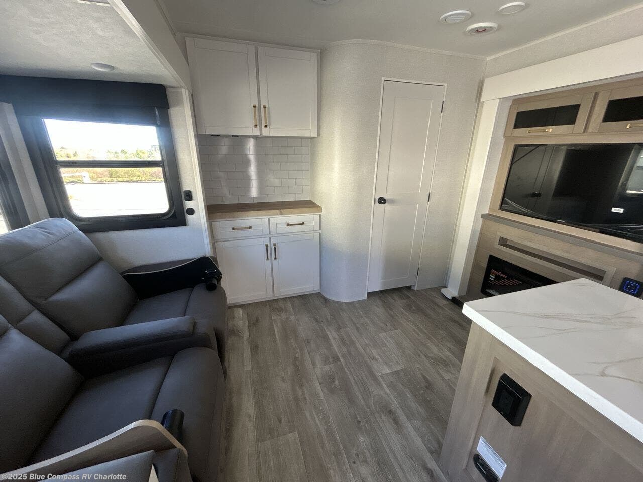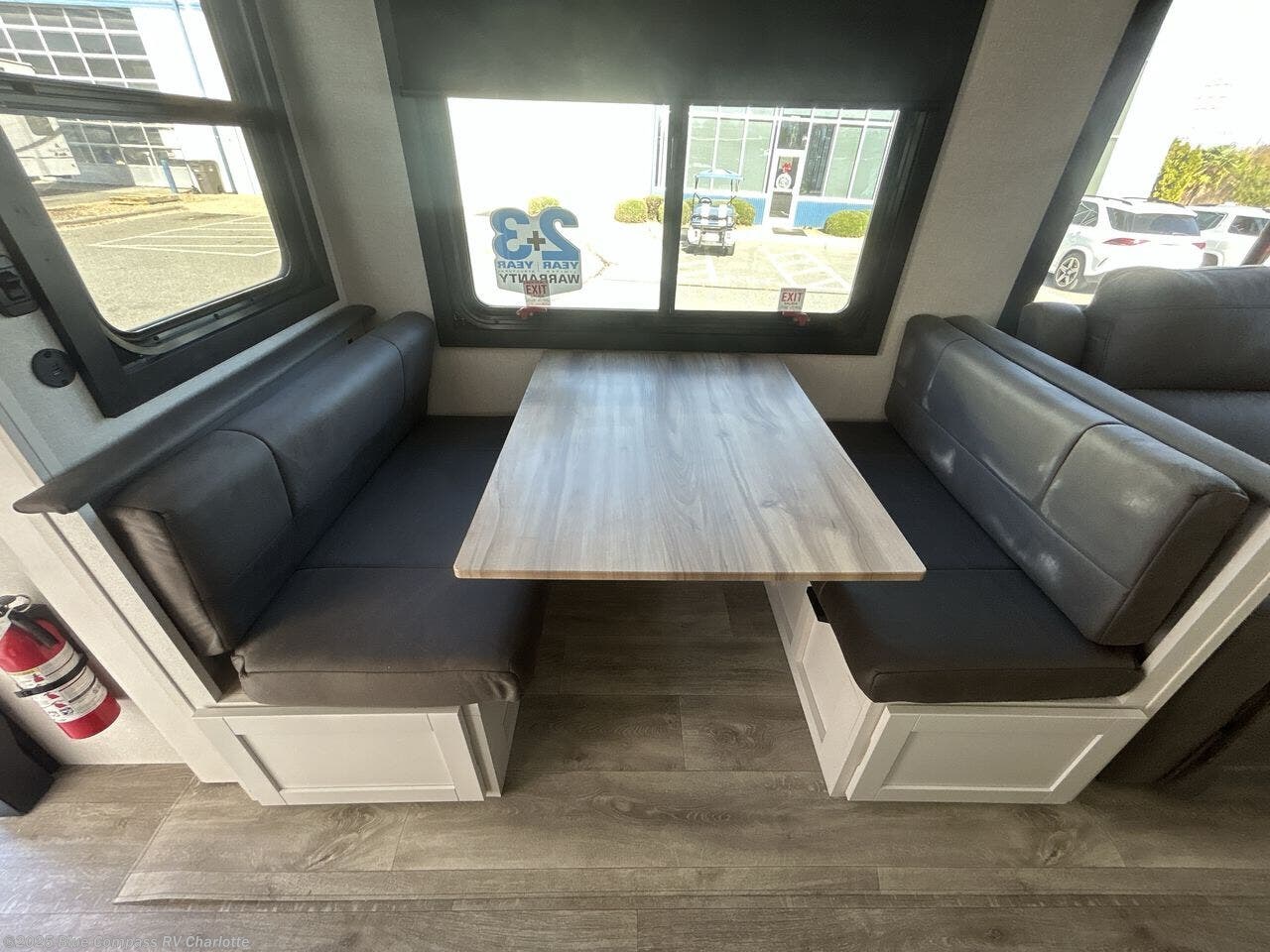 This travel trailer is perfect for your larger group or family! There is a rear private bunkhouse with two bunks, a tri-fold sofa, plus a slide out for more space. You will have the front private bedroom all to yourselves with a queen bed, and any other guests can sleep on the tri-fold sofa and booth dinette! There is also a wardrobe/linen closet with washer and dryer prep if you plan to add a washer and dyer for convenience. The chef can prepare their best meals with the kitchen island and will enjoy having two hutches to store the essentials. They could even cook at the outside kitchen to breathe in some fresh air and enjoy the beautiful scenery!