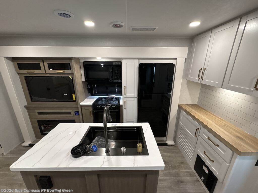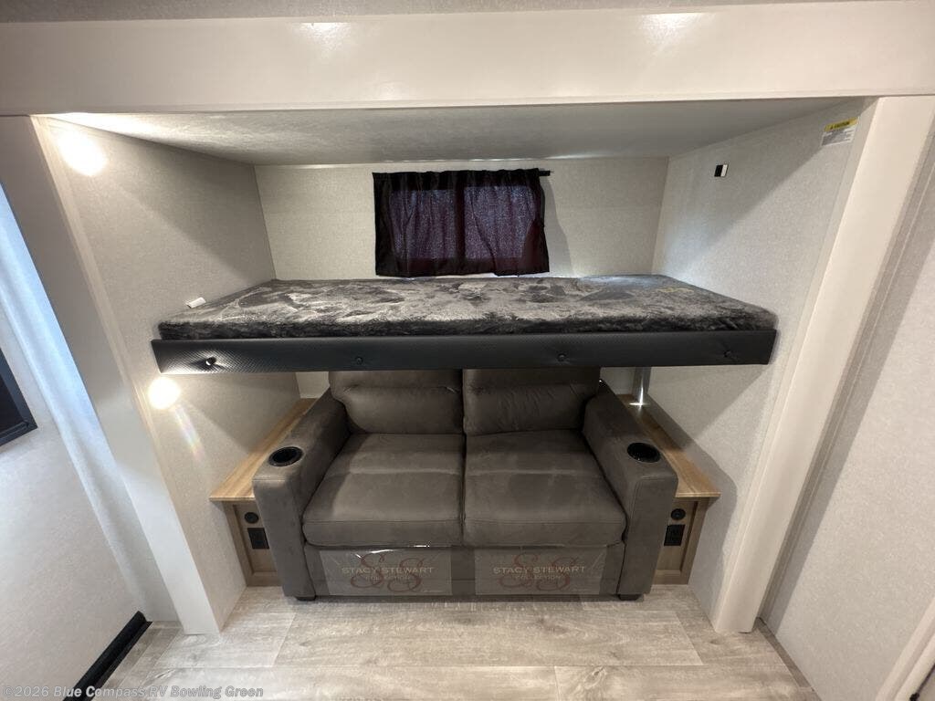 This travel trailer is perfect for your larger group or family! There is a rear private bunkhouse with two bunks, a tri-fold sofa, plus a slide out for more space. You will have the front private bedroom all to yourselves with a queen bed, and any other guests can sleep on the tri-fold sofa and booth dinette! There is also a wardrobe/linen closet with washer and dryer prep if you plan to add a washer and dyer for convenience. The chef can prepare their best meals with the kitchen island and will enjoy having two hutches to store the essentials. They could even cook at the outside kitchen to breathe in some fresh air and enjoy the beautiful scenery!
