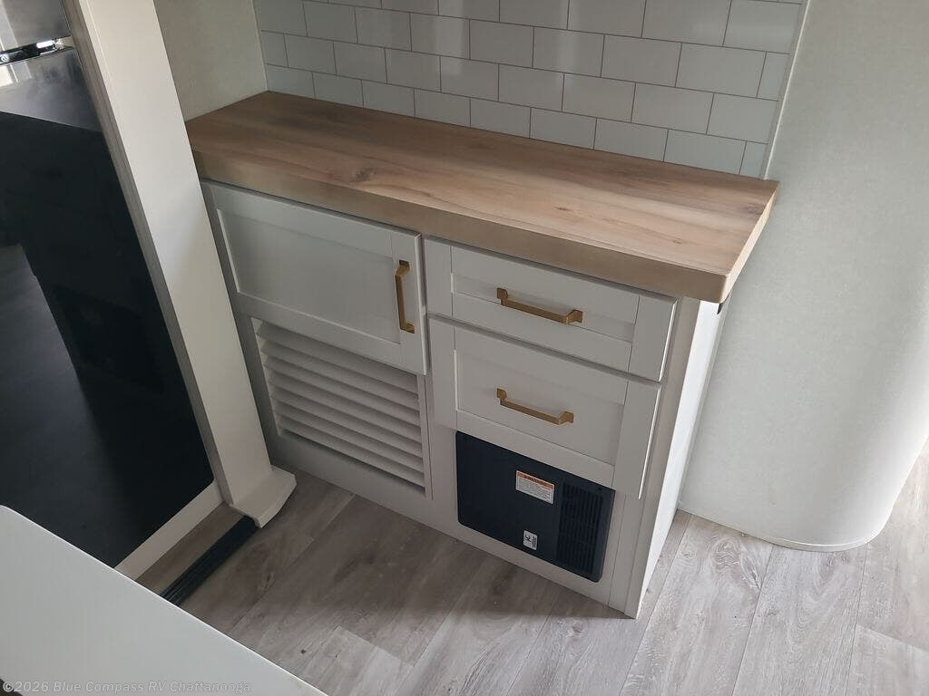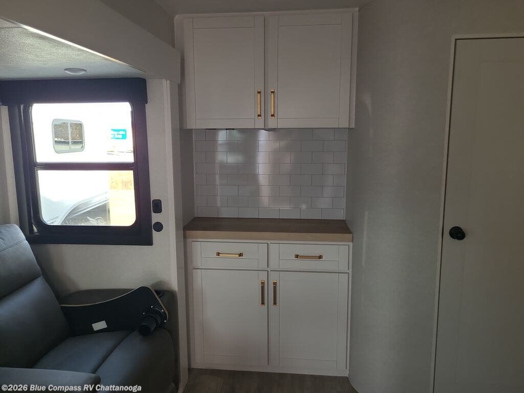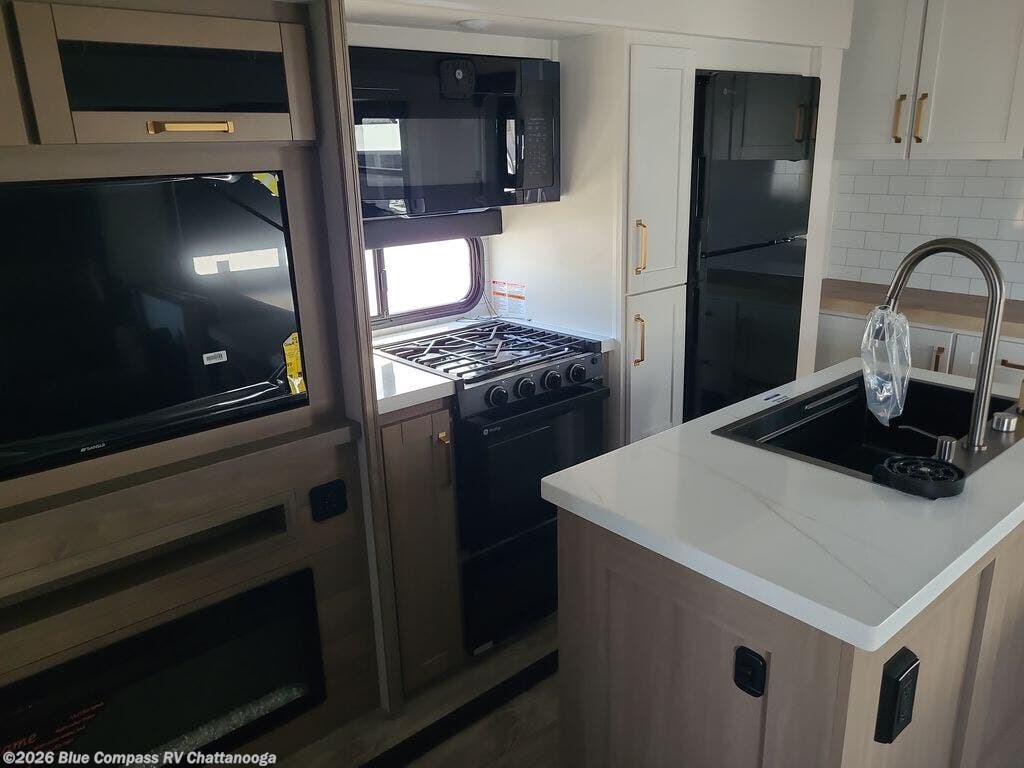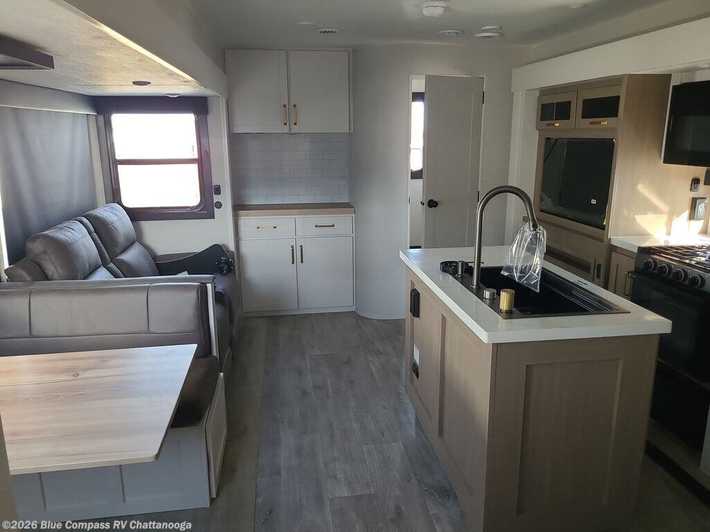 This travel trailer is perfect for your larger group or family! There is a rear private bunkhouse with two bunks, a tri-fold sofa, plus a slide out for more space. You will have the front private bedroom all to yourselves with a queen bed, and any other guests can sleep on the tri-fold sofa and booth dinette! There is also a wardrobe/linen closet with washer and dryer prep if you plan to add a washer and dyer for convenience. The chef can prepare their best meals with the kitchen island and will enjoy having two hutches to store the essentials. They could even cook at the outside kitchen to breathe in some fresh air and enjoy the beautiful scenery!