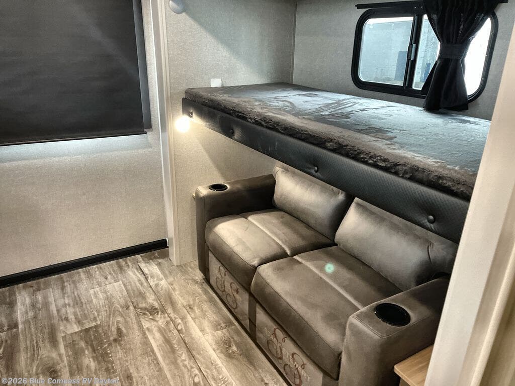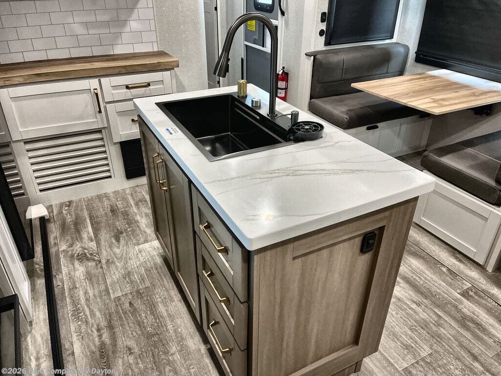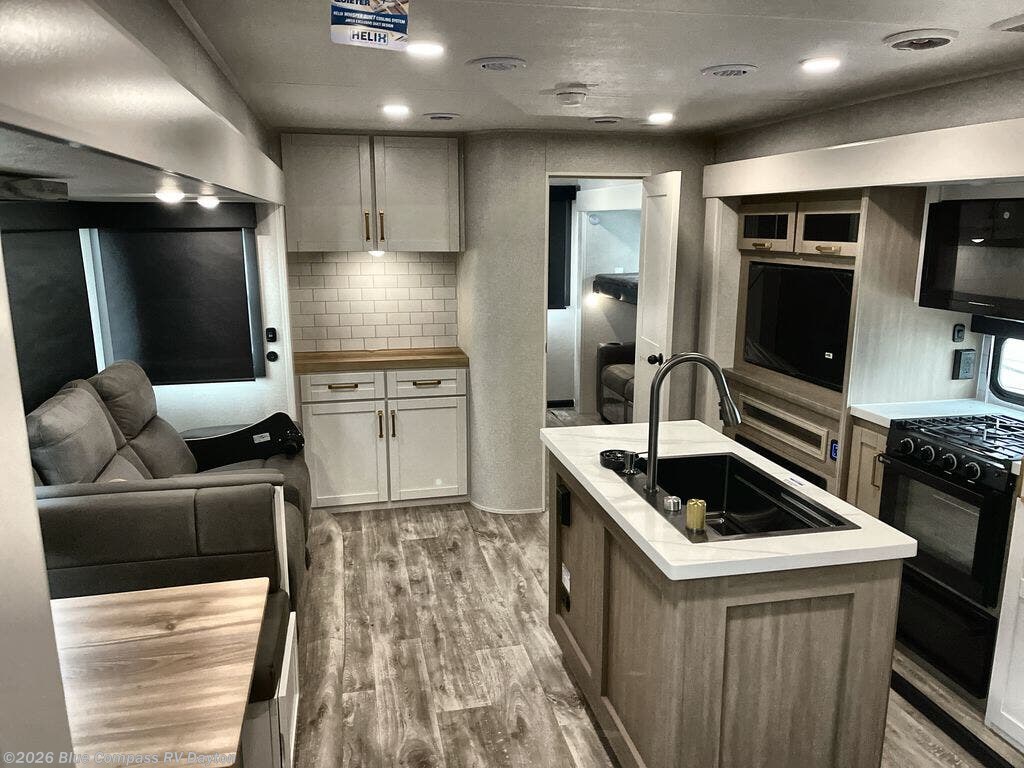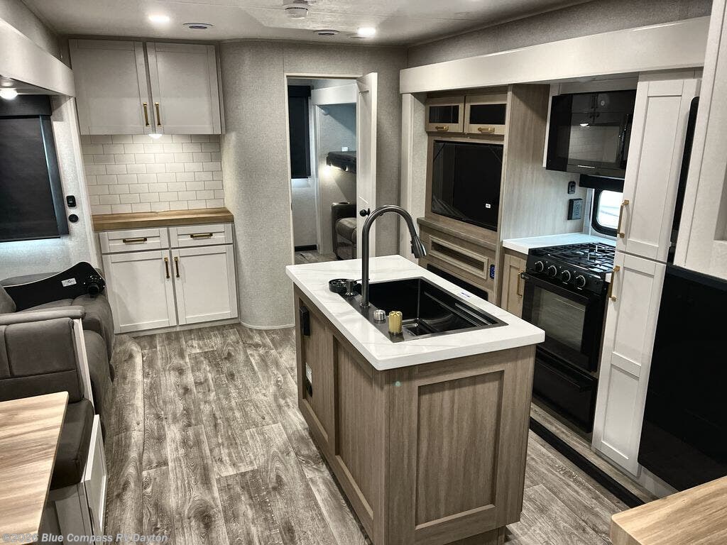 This travel trailer is perfect for your larger group or family! There is a rear private bunkhouse with two bunks, a tri-fold sofa, plus a slide out for more space. You will have the front private bedroom all to yourselves with a queen bed, and any other guests can sleep on the tri-fold sofa and booth dinette! There is also a wardrobe/linen closet with washer and dryer prep if you plan to add a washer and dyer for convenience. The chef can prepare their best meals with the kitchen island and will enjoy having two hutches to store the essentials. They could even cook at the outside kitchen to breathe in some fresh air and enjoy the beautiful scenery!