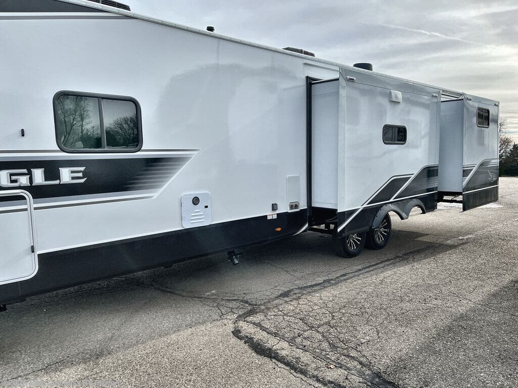 With any Eagle HT fifth wheel or travel trailer by Jayco you will enjoy a smooth drive thanks to the 4 Star Handling Package and MORryde CRE-3000 rubberized suspension. The Customer Value Package includes amenities that are sure to make camping easier than ever, like the 60K on-demand water heater, Keyed-Alike lock system, 15,000 BTU "Whisper Quiet" A/C, and more. Handcrafted door/drawer fronts will make your space feel more like home, along with residential vinyl flooring throughout, GE appliances, and blackout roller shades with reflective side throughout to keep the sun out when you want to sleep in. Each model also includes a NuVo H2O water treatment system with filters included, interior and exterior "Blue Sync" audio connect with MB Quart Sound for your TV and phone, and 100% no floor vents for added comfort and convenience!