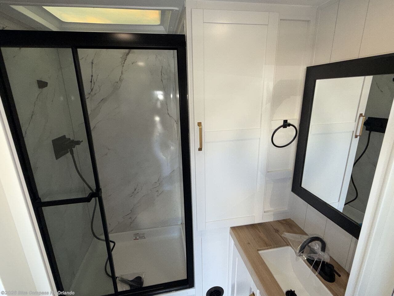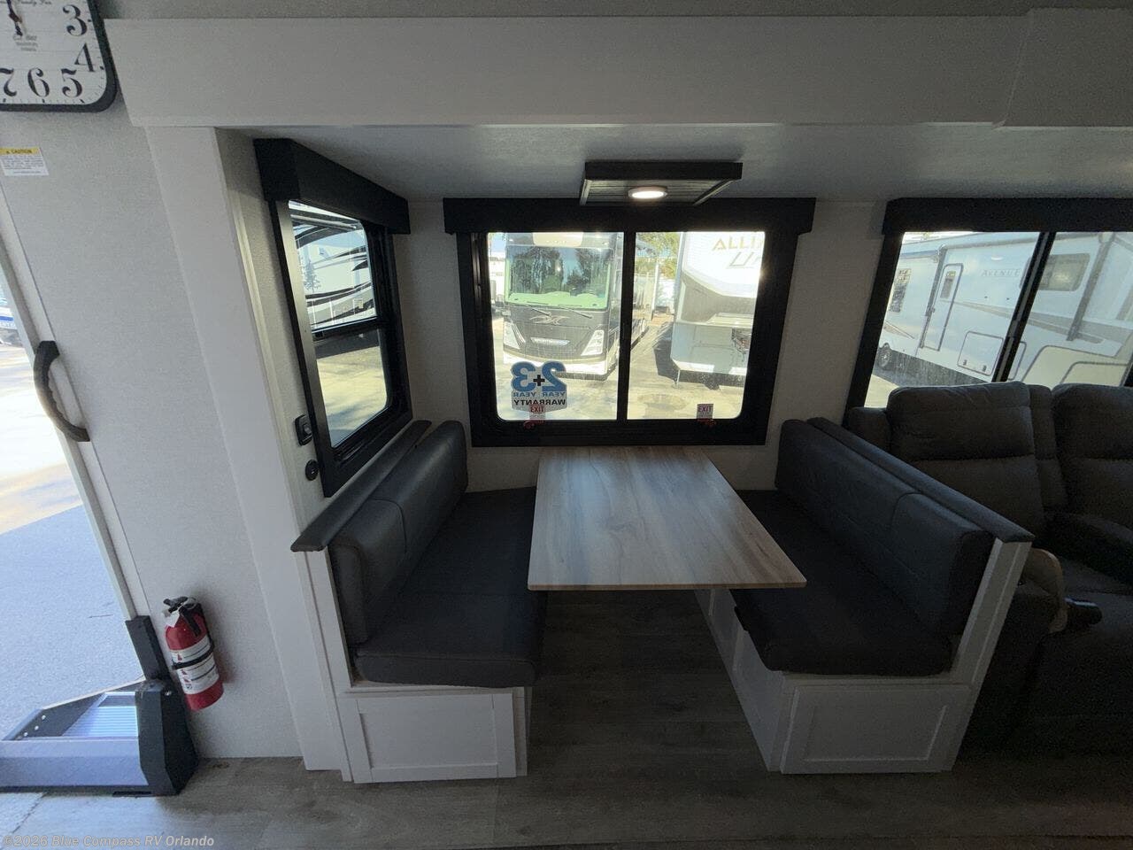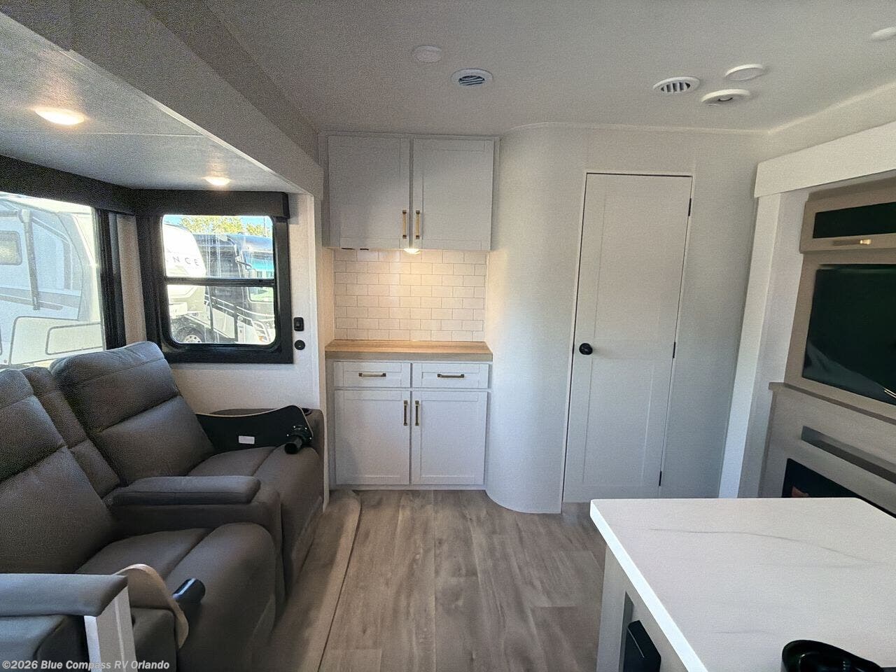 This travel trailer is perfect for your larger group or family! There is a rear private bunkhouse with two bunks, a tri-fold sofa, plus a slide out for more space. You will have the front private bedroom all to yourselves with a queen bed, and any other guests can sleep on the tri-fold sofa and booth dinette! There is also a wardrobe/linen closet with washer and dryer prep if you plan to add a washer and dyer for convenience. The chef can prepare their best meals with the kitchen island and will enjoy having two hutches to store the essentials. They could even cook at the outside kitchen to breathe in some fresh air and enjoy the beautiful scenery!