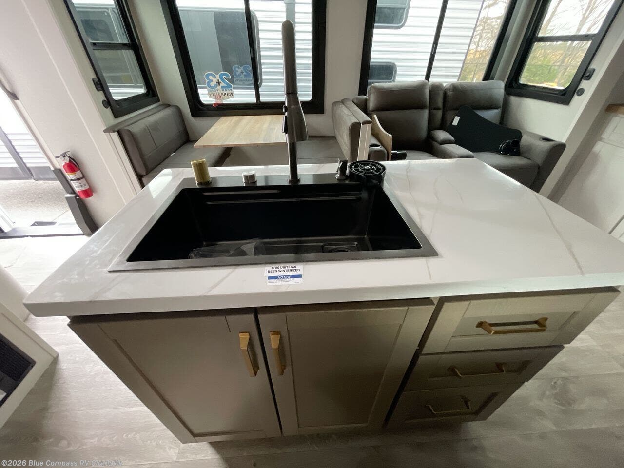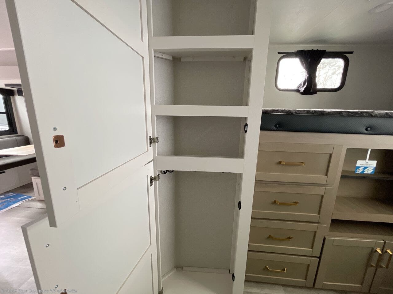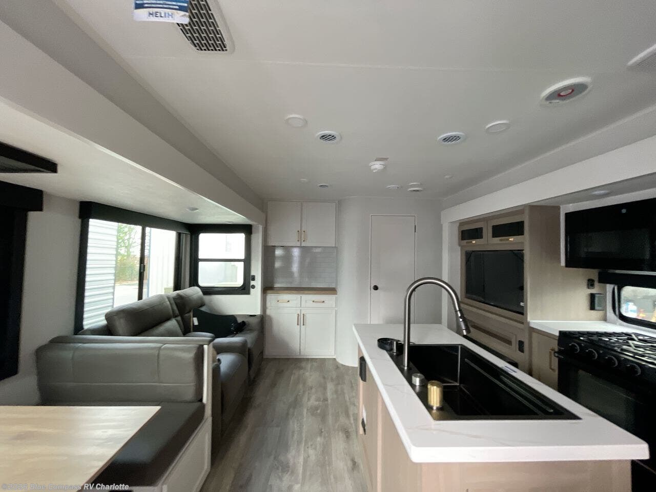 This travel trailer is perfect for your larger group or family! There is a rear private bunkhouse with two bunks, a tri-fold sofa, plus a slide out for more space. You will have the front private bedroom all to yourselves with a queen bed, and any other guests can sleep on the tri-fold sofa and booth dinette! There is also a wardrobe/linen closet with washer and dryer prep if you plan to add a washer and dyer for convenience. The chef can prepare their best meals with the kitchen island and will enjoy having two hutches to store the essentials. They could even cook at the outside kitchen to breathe in some fresh air and enjoy the beautiful scenery!