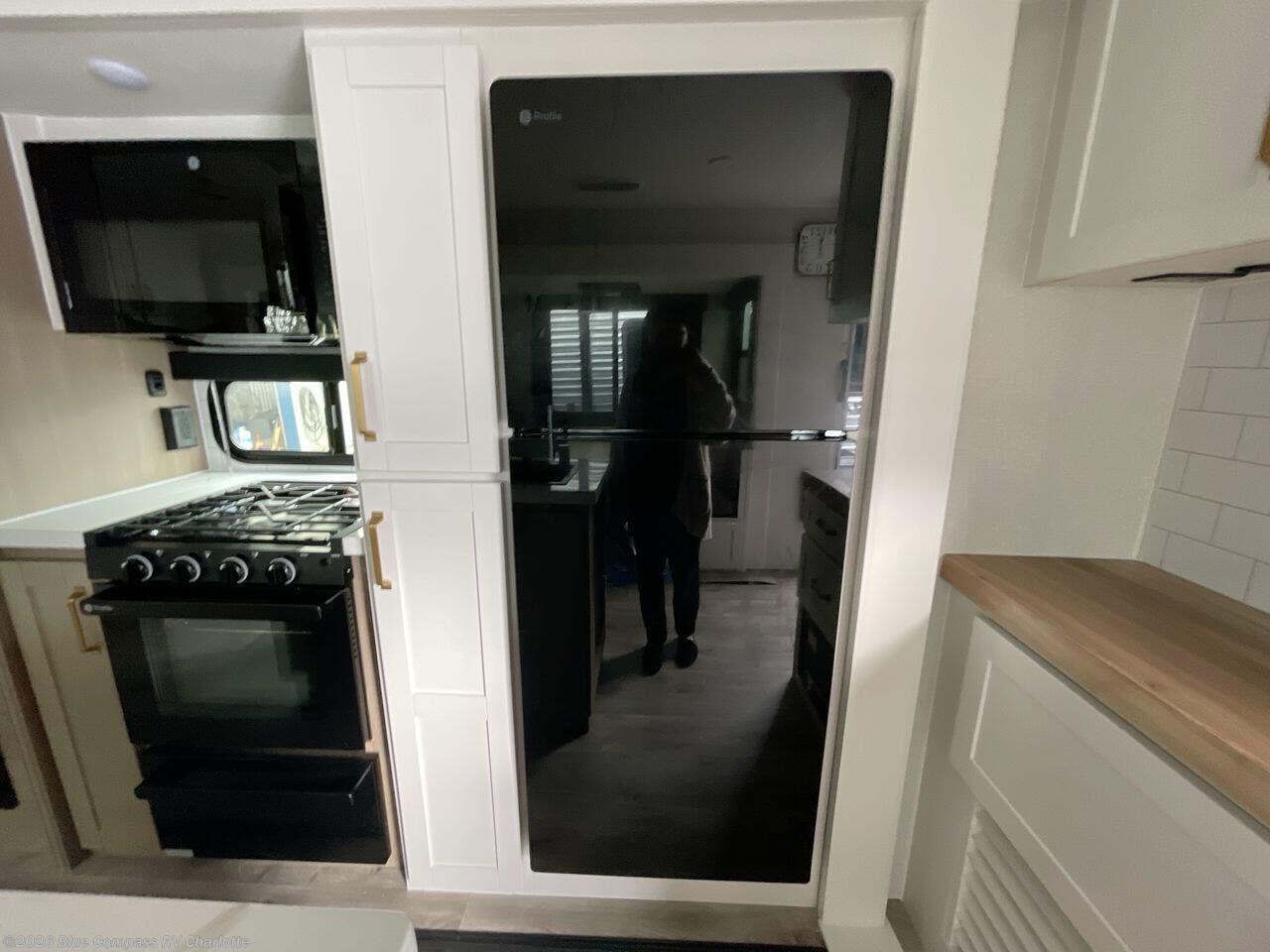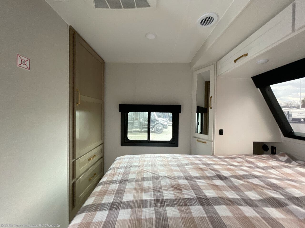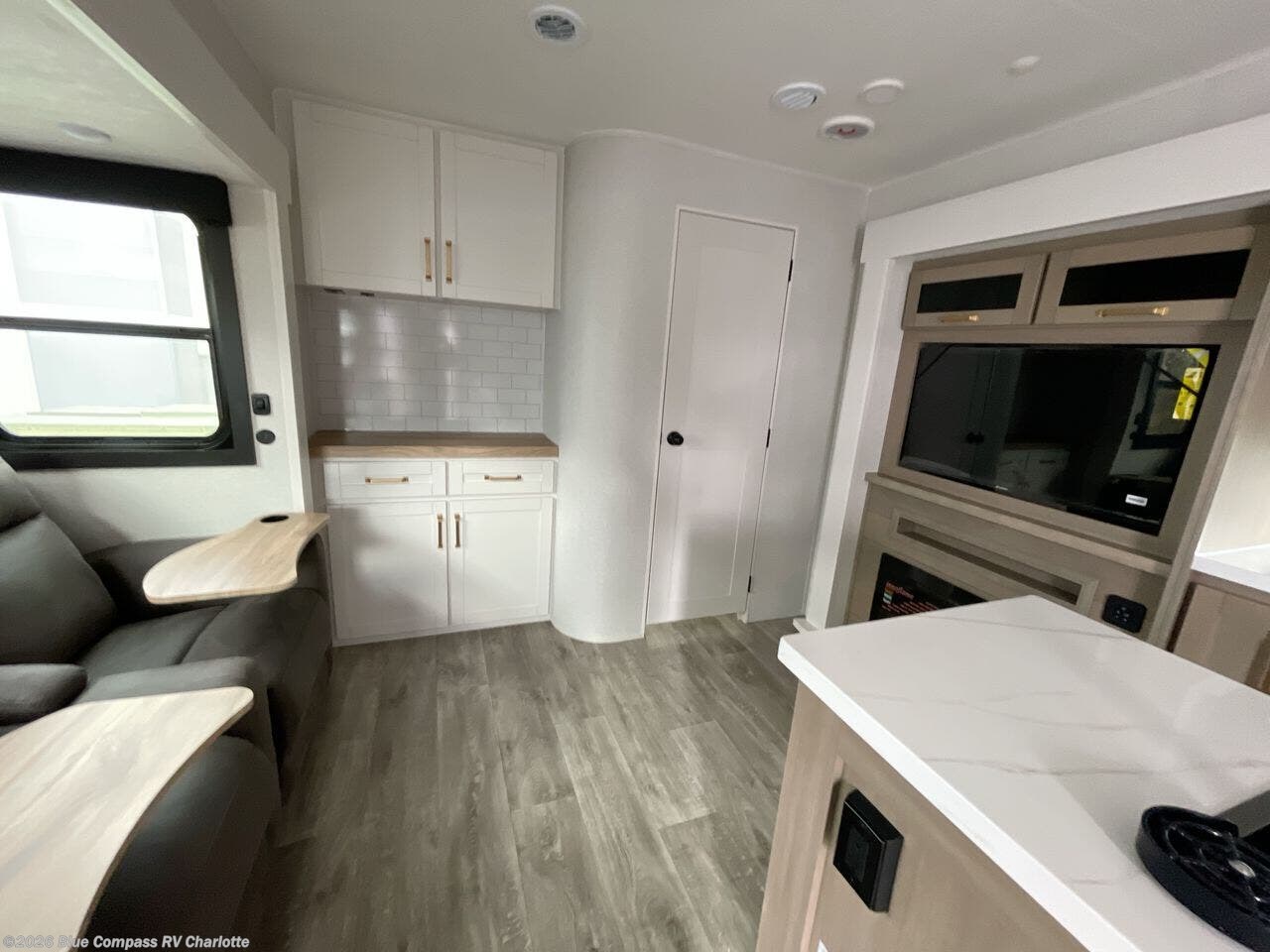 This travel trailer is perfect for your larger group or family! There is a rear private bunkhouse with two bunks, a tri-fold sofa, plus a slide out for more space. You will have the front private bedroom all to yourselves with a queen bed, and any other guests can sleep on the tri-fold sofa and booth dinette! There is also a wardrobe/linen closet with washer and dryer prep if you plan to add a washer and dyer for convenience. The chef can prepare their best meals with the kitchen island and will enjoy having two hutches to store the essentials. They could even cook at the outside kitchen to breathe in some fresh air and enjoy the beautiful scenery!