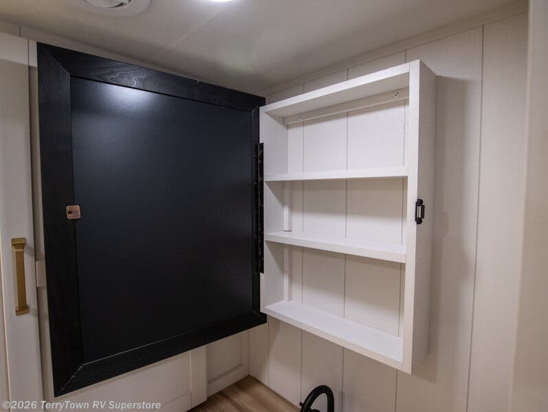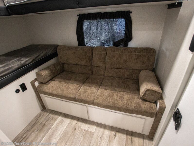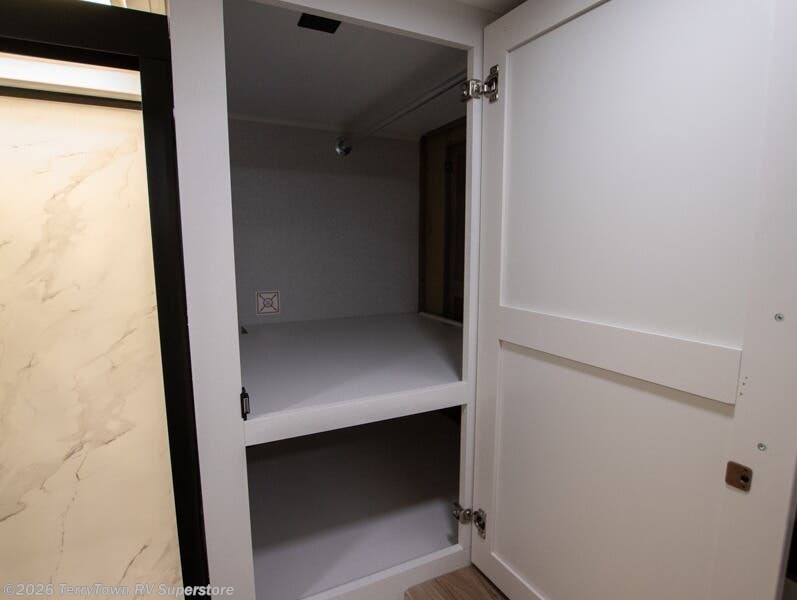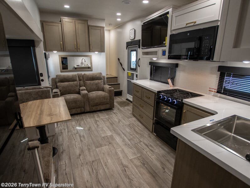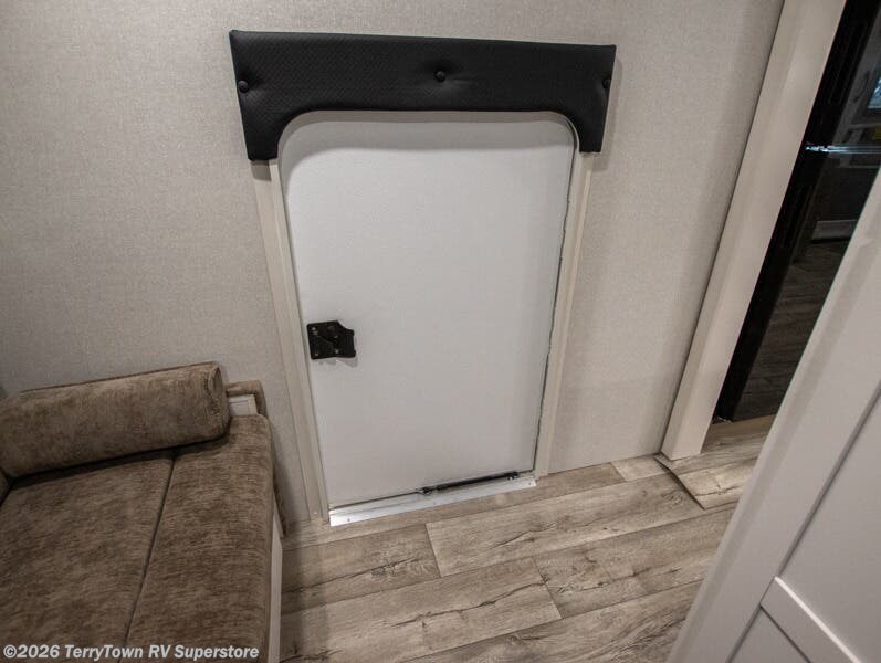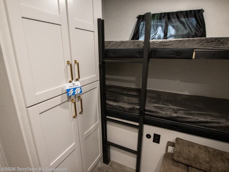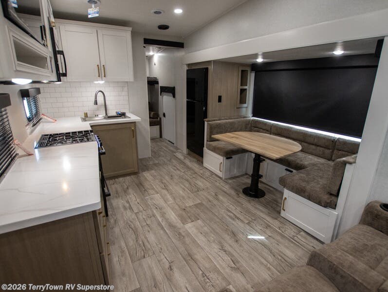 This fifth wheel is not only packed with amenities, but it can sleep up to eight people each night for fun camping trips! The rear private bunkhouse includes bunk beds plus a third bunk above a jack-knife sofa, and there is a bike storage door here so you can easily pack in gear. You can claim the front private bedroom all to yourselves with an Olympic bed, a wardrobe slide plus a second wardrobe with washer and dryer prep. Everyone can come together in the combined kitchen and living room that features a U-shaped dinette across from the TV and a theater seat for added comfort!