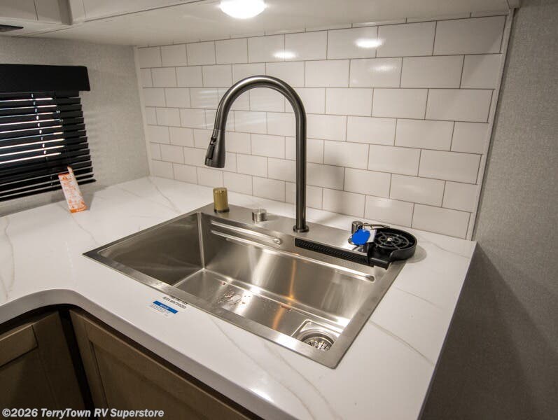 With any Eagle HT fifth wheel or travel trailer by Jayco you will enjoy a smooth drive thanks to the 4 Star Handling Package, Goodyear Endurance tires, and MORryde CRE-3000 rubberized suspension. The Customer Value Package includes amenities that are sure to make camping easier than ever, like the 60K on-demand water heater, Keyed-Alike lock system, 15,000 BTU "Whisper Quiet" A/C, and more. Handcrafted and glazed door/drawer fronts will make your space feel more like home, along with residential vinyl flooring throughout, GE appliances, and blackout roller shades with reflective side throughout to keep the sun out when you want to sleep in. Each model also includes a NuVo H2O water treatment system with filters included, interior and exterior "Blue Sync" audio connect with MB Quart Sound for your TV and phone, and 100% no floor vents for added comfort and convenience!