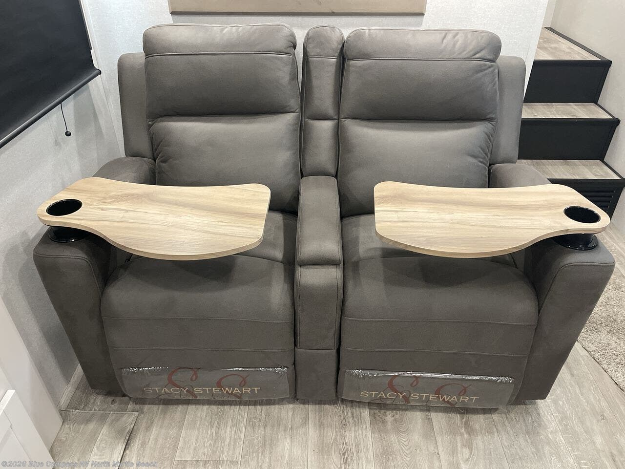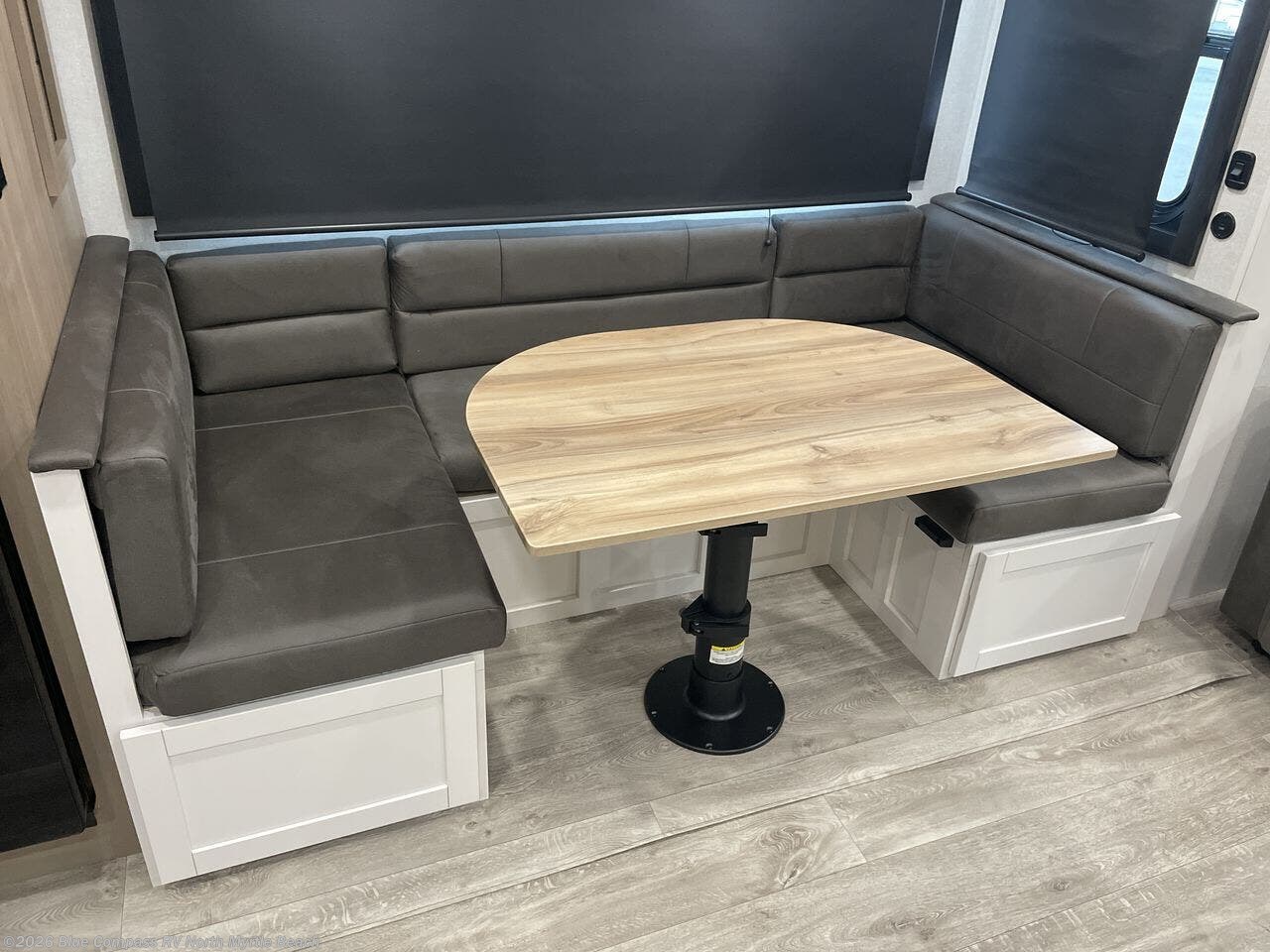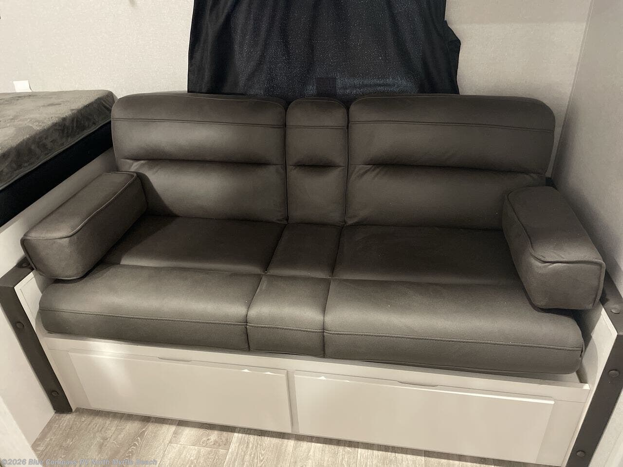 This fifth wheel is not only packed with amenities, but it can sleep up to eight people each night for fun camping trips! The rear private bunkhouse includes bunk beds plus a third bunk above a jack-knife sofa, and there is a bike storage door here so you can easily pack in gear. You can claim the front private bedroom all to yourselves with an Olympic bed, a wardrobe slide plus a second wardrobe with washer and dryer prep. Everyone can come together in the combined kitchen and living room that features a U-shaped dinette across from the TV and a theater seat for added comfort!