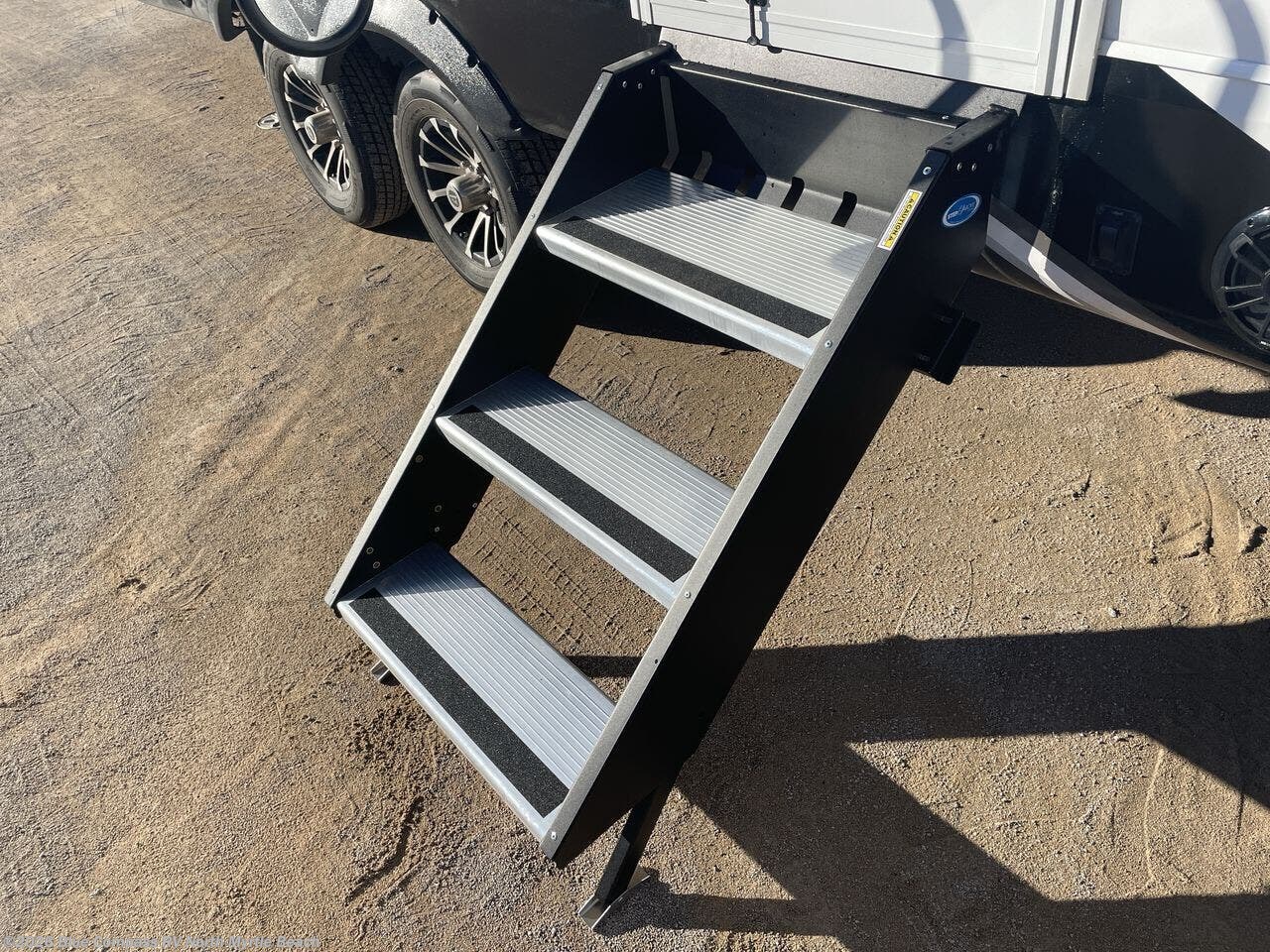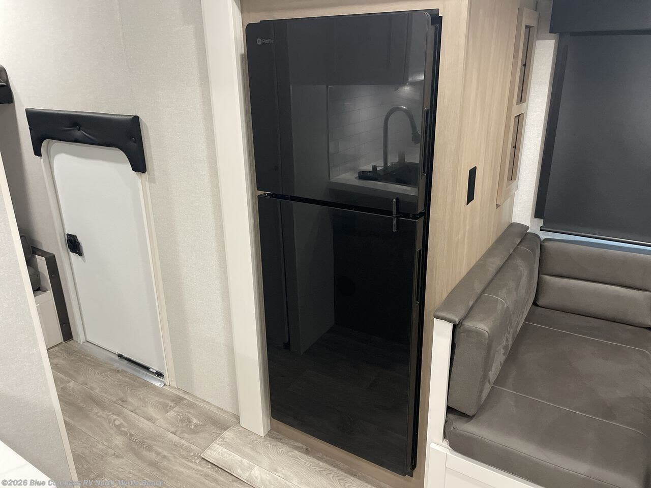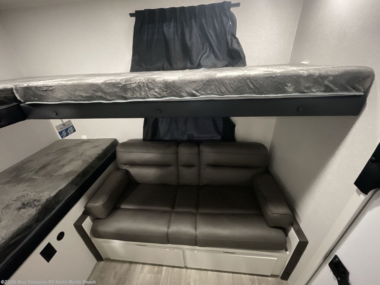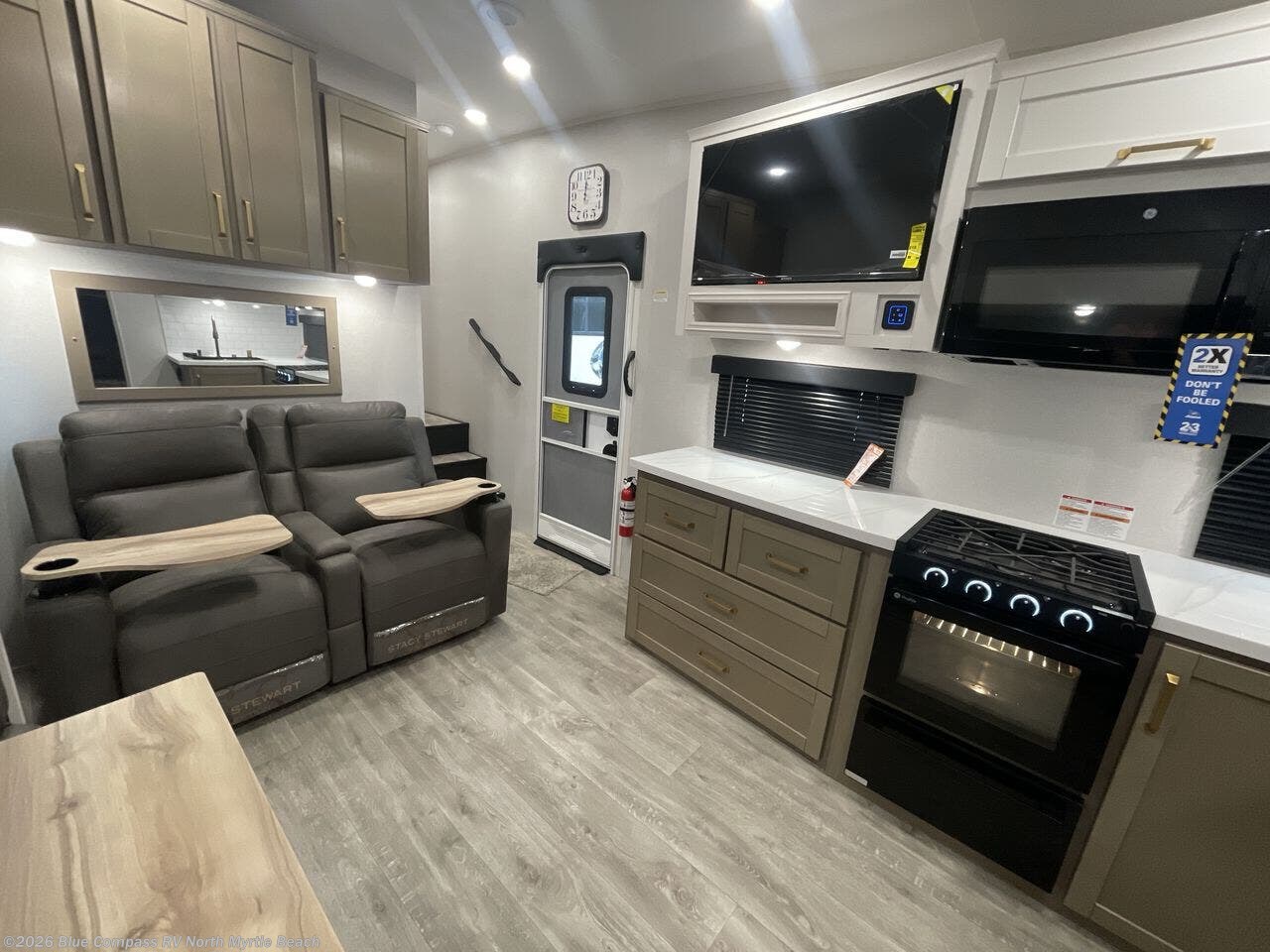 This fifth wheel is not only packed with amenities, but it can sleep up to eight people each night for fun camping trips! The rear private bunkhouse includes bunk beds plus a third bunk above a jack-knife sofa, and there is a bike storage door here so you can easily pack in gear. You can claim the front private bedroom all to yourselves with an Olympic bed, a wardrobe slide plus a second wardrobe with washer and dryer prep. Everyone can come together in the combined kitchen and living room that features a U-shaped dinette across from the TV and a theater seat for added comfort!
