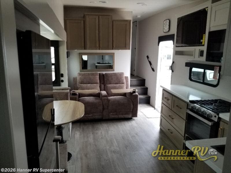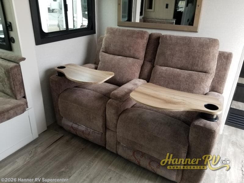 This fifth wheel is not only packed with amenities, but it can sleep up to eight people each night for fun camping trips! The rear private bunkhouse includes bunk beds plus a third bunk above a jack-knife sofa, and there is a bike storage door here so you can easily pack in gear. You can claim the front private bedroom all to yourselves with an Olympic bed, a wardrobe slide plus a second wardrobe with washer and dryer prep. Everyone can come together in the combined kitchen and living room that features a U-shaped dinette across from the TV and a theater seat for added comfort!