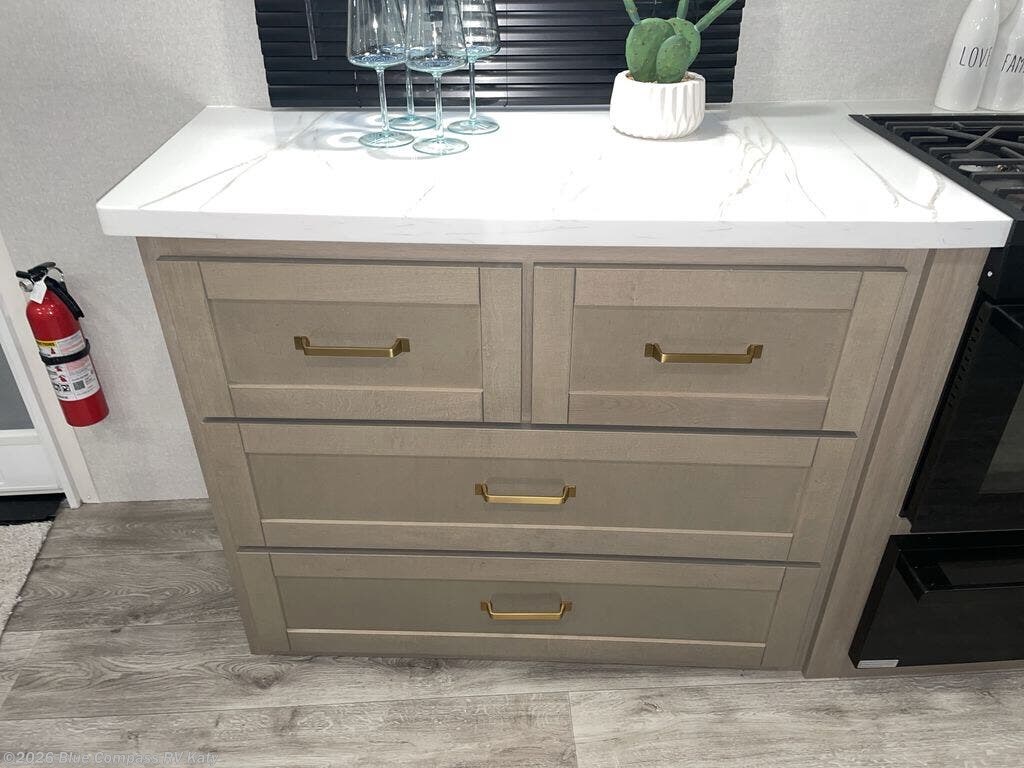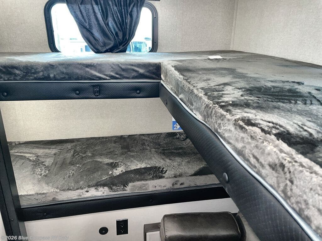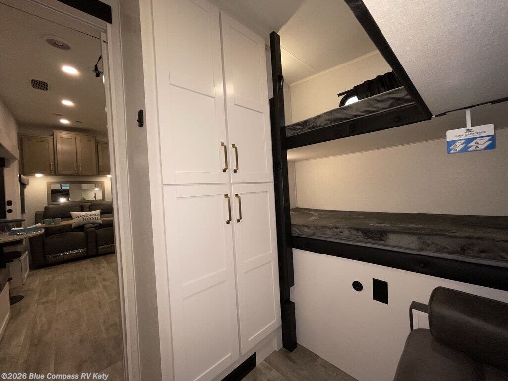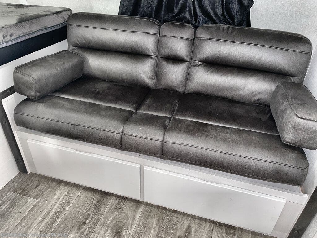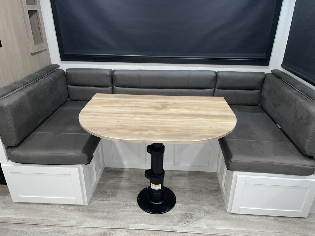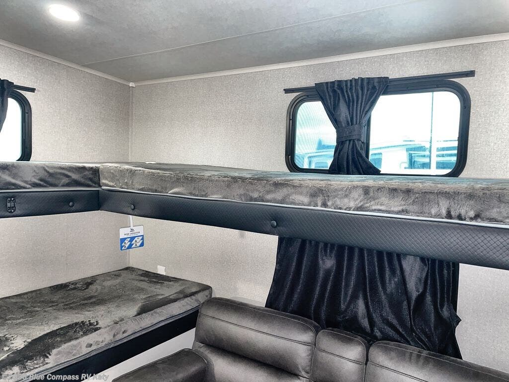 This fifth wheel is not only packed with amenities, but it can sleep up to eight people each night for fun camping trips! The rear private bunkhouse includes bunk beds plus a third bunk above a jack-knife sofa, and there is a bike storage door here so you can easily pack in gear. You can claim the front private bedroom all to yourselves with an Olympic bed, a wardrobe slide plus a second wardrobe with washer and dryer prep. Everyone can come together in the combined kitchen and living room that features a U-shaped dinette across from the TV and a theater seat for added comfort!