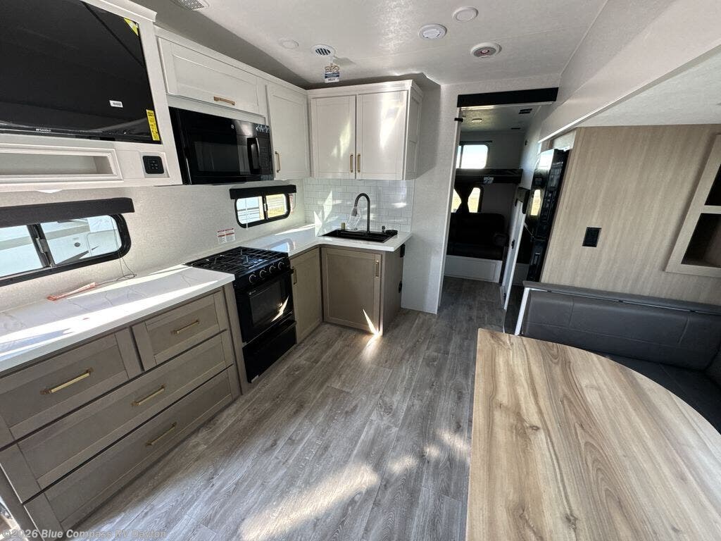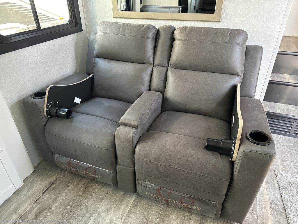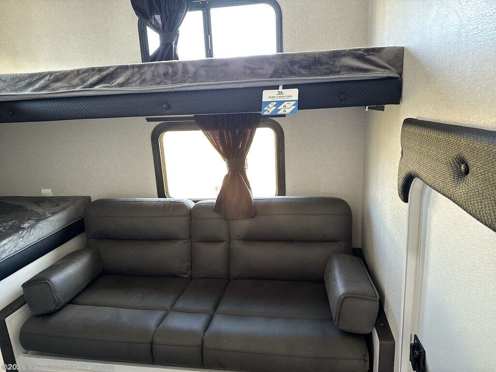 This fifth wheel is not only packed with amenities, but it can sleep up to eight people each night for fun camping trips! The rear private bunkhouse includes bunk beds plus a third bunk above a jack-knife sofa, and there is a bike storage door here so you can easily pack in gear. You can claim the front private bedroom all to yourselves with an Olympic bed, a wardrobe slide plus a second wardrobe with washer and dryer prep. Everyone can come together in the combined kitchen and living room that features a U-shaped dinette across from the TV and a theater seat for added comfort!