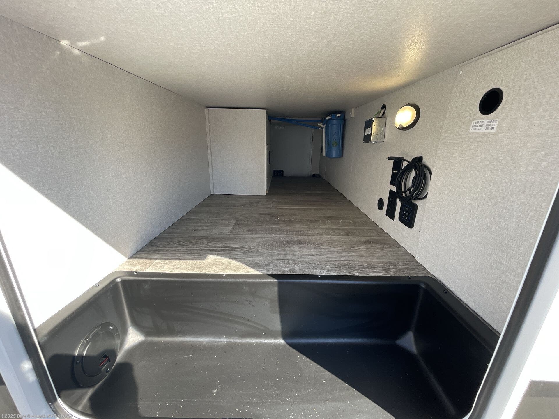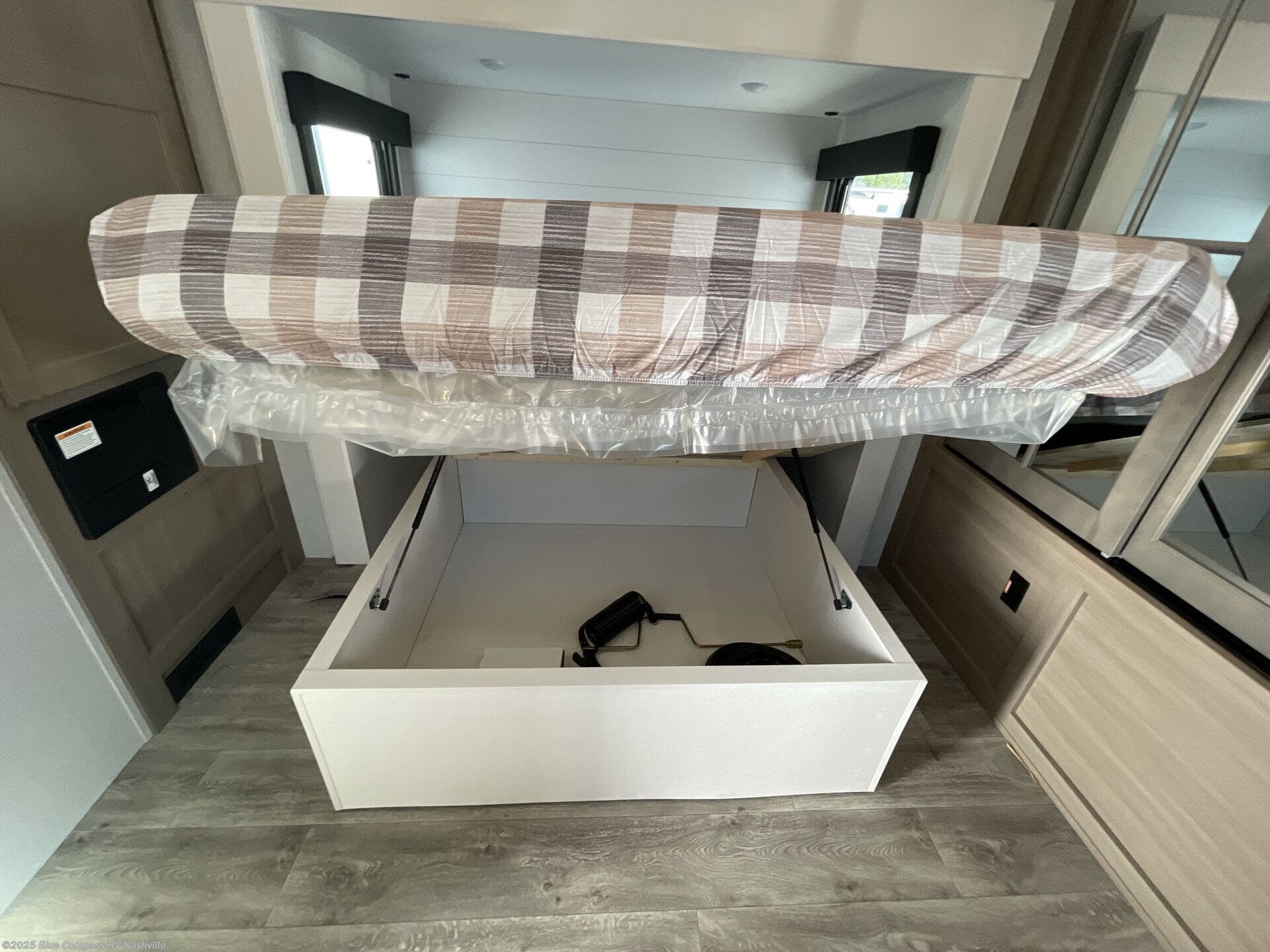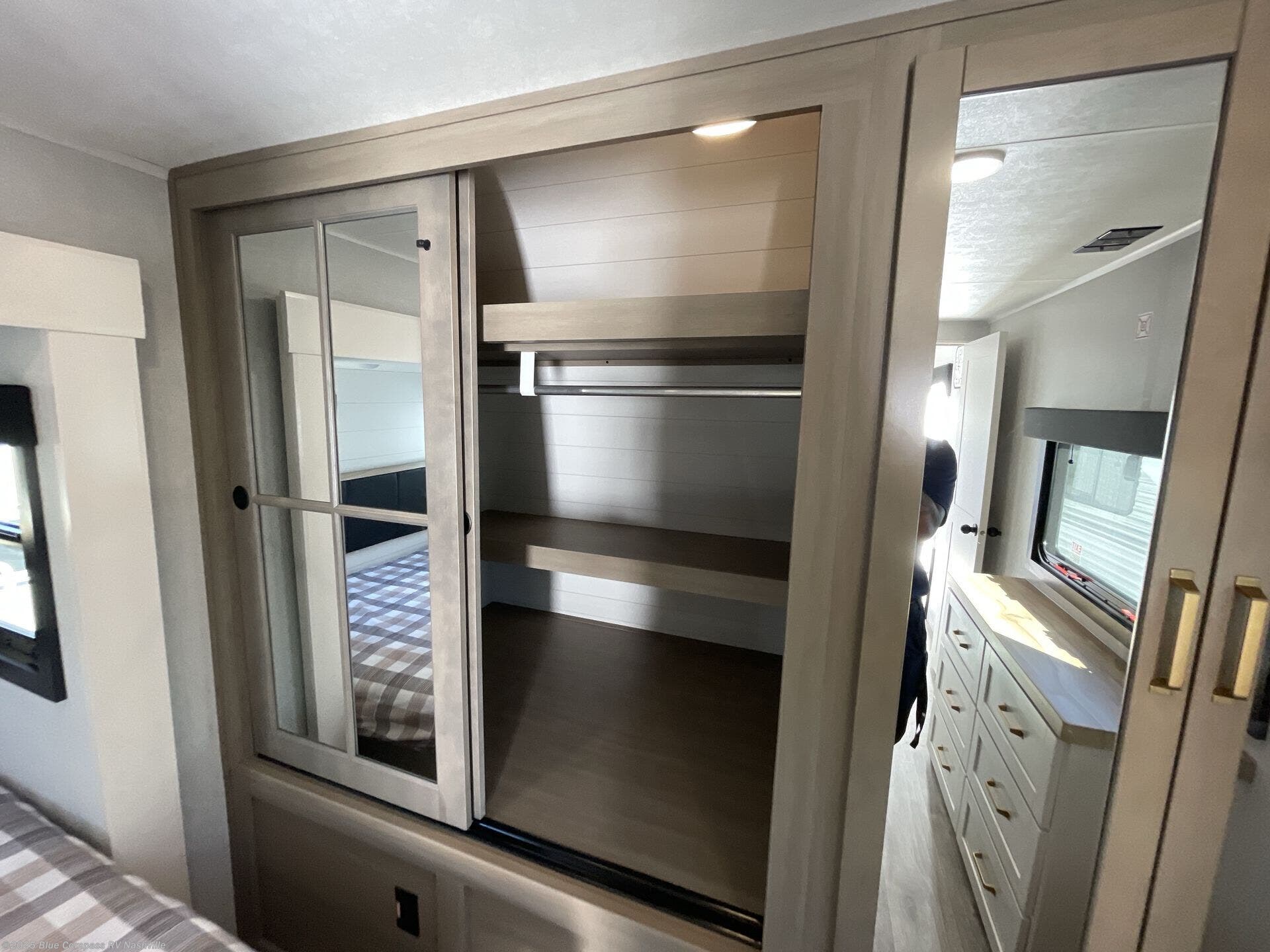 You will feel right at home camping in this travel trailer! It features a front private bedroom with an Olympic queen bed slide for more interior space, a dresser, a front wardrobe to hang your clothes, and a wardrobe with washer and dryer prep. Start each morning getting squeaky clean in the full bathroom with the shower, then head to the kitchen to fry up some eggs on the stainless steel range. The kitchen island provides more counter space to prep meals, and there are two pantries for dry goods and snacks. There is also a table and chairs with a bench seat plus a tri-fold sofa within the large slide out. And a desk with a bench seat lets you get some work done!