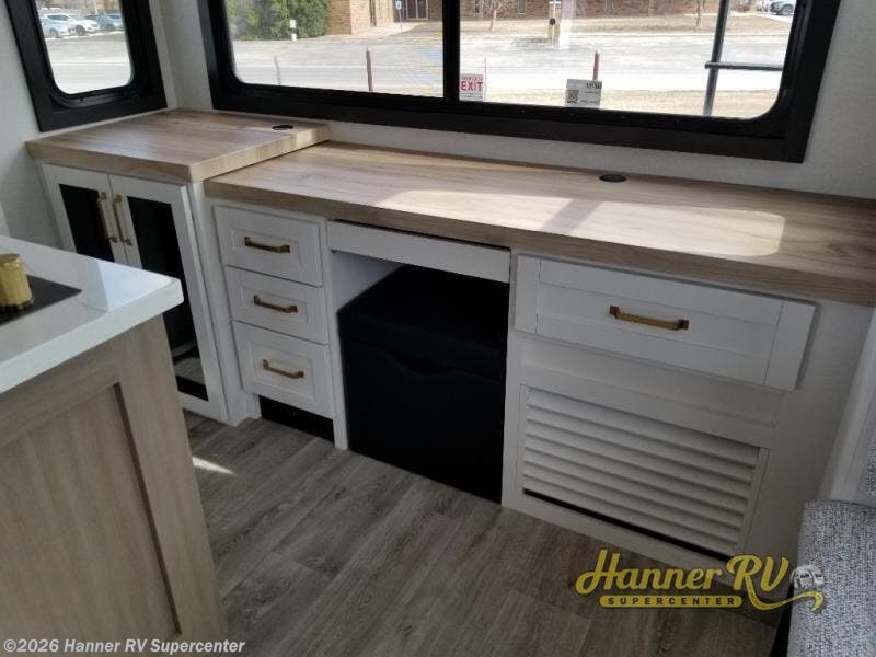 You will feel right at home camping in this travel trailer! It features a front private bedroom with an Olympic queen bed slide for more interior space, a dresser, a front wardrobe to hang your clothes, and a wardrobe with washer and dryer prep. Start each morning getting squeaky clean in the full bathroom with the shower, then head to the kitchen to fry up some eggs on the stainless steel range. The kitchen island provides more counter space to prep meals, and there are two pantries for dry goods and snacks. There is also a table and chairs with a bench seat plus a tri-fold sofa within the large slide out. And a desk with a bench seat lets you get some work done!