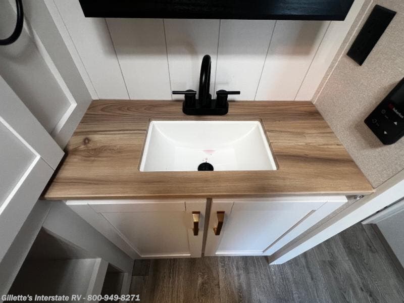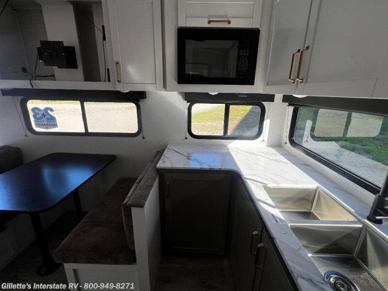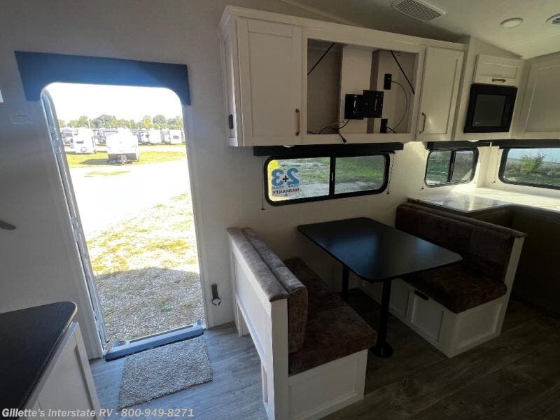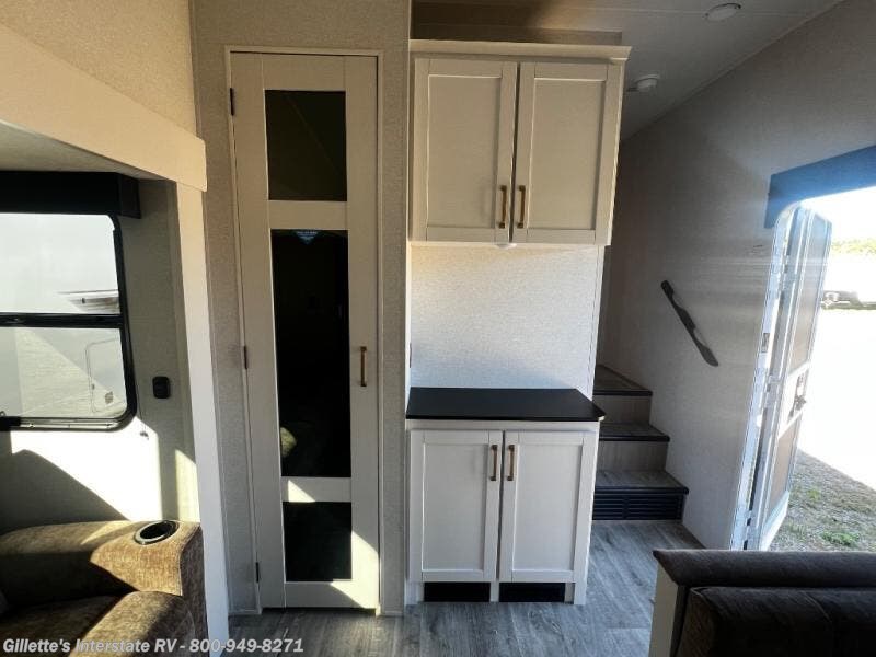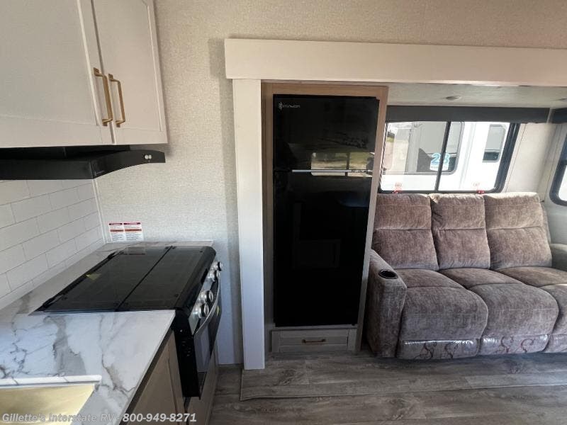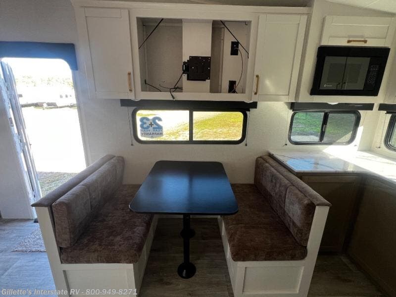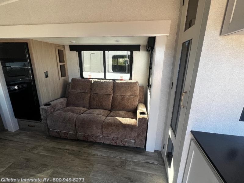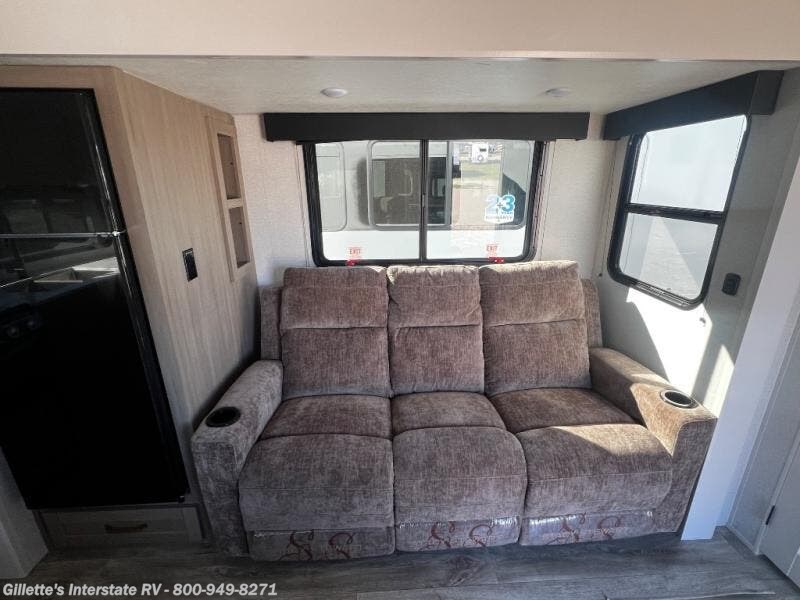 Camping just got a whole lot sweeter in this fifth wheel with double slides, a rear kitchen, and sleeping space for five to six. You'll love waking up each morning in the front private bedroom that includes a queen bed, dual nightstands and overhead cabinets, plus a wardrobe and dresser slide. Your guests who slept on the tri-fold sofa and booth dinette can convert these back to seating space in the morning, and breakfast can be made in the rear kitchen. Here, you'll find ample counter space, a microwave and range, plus a pantry and 12V refrigerator for food storage. Outside, gear can be stored in the pass-thru storage area, and you're sure to enjoy the 16' power awning with LED Lights!