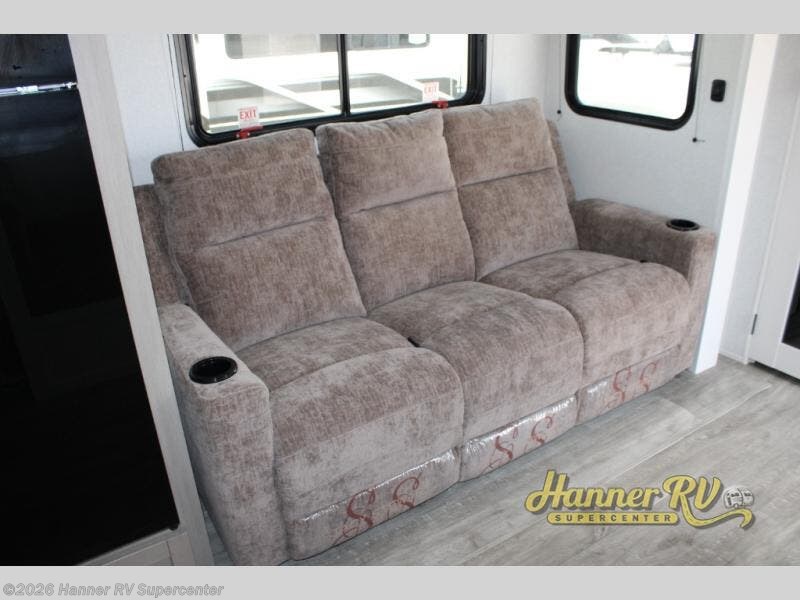 Camping just got a whole lot sweeter in this fifth wheel with double slides, a rear kitchen, and sleeping space for five to six. You'll love waking up each morning in the front private bedroom that includes a queen bed, dual nightstands and overhead cabinets, plus a wardrobe and dresser slide. Your guests who slept on the tri-fold sofa and booth dinette can convert these back to seating space in the morning, and breakfast can be made in the rear kitchen. Here, you'll find ample counter space, a microwave and range, plus a pantry and 12V refrigerator for food storage. Outside, gear can be stored in the pass-thru storage area, and you're sure to enjoy the 16' power awning with LED Lights!
