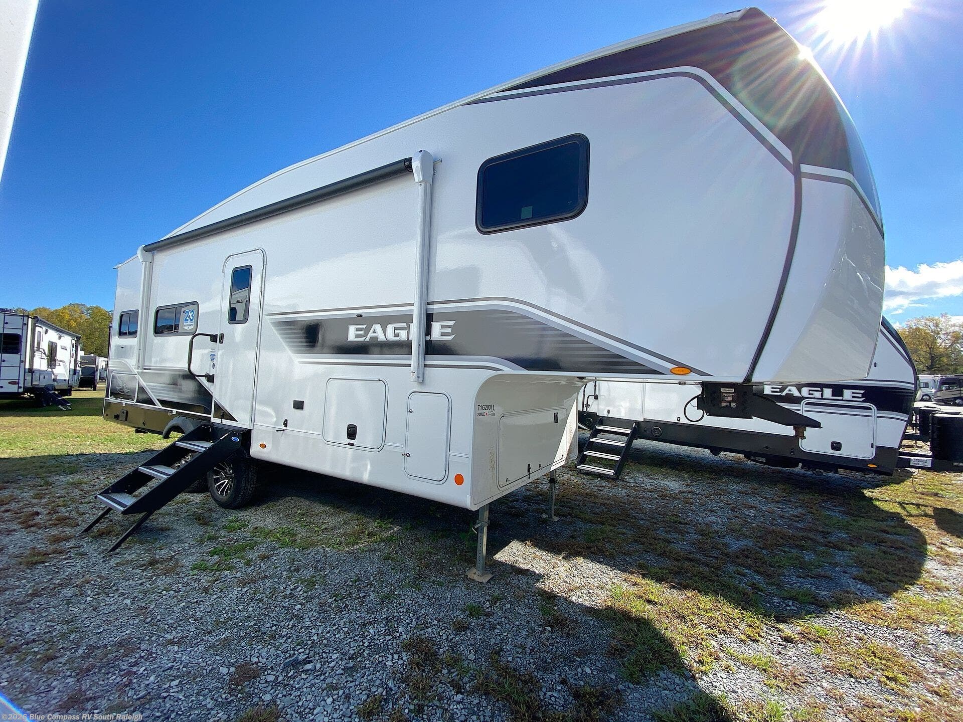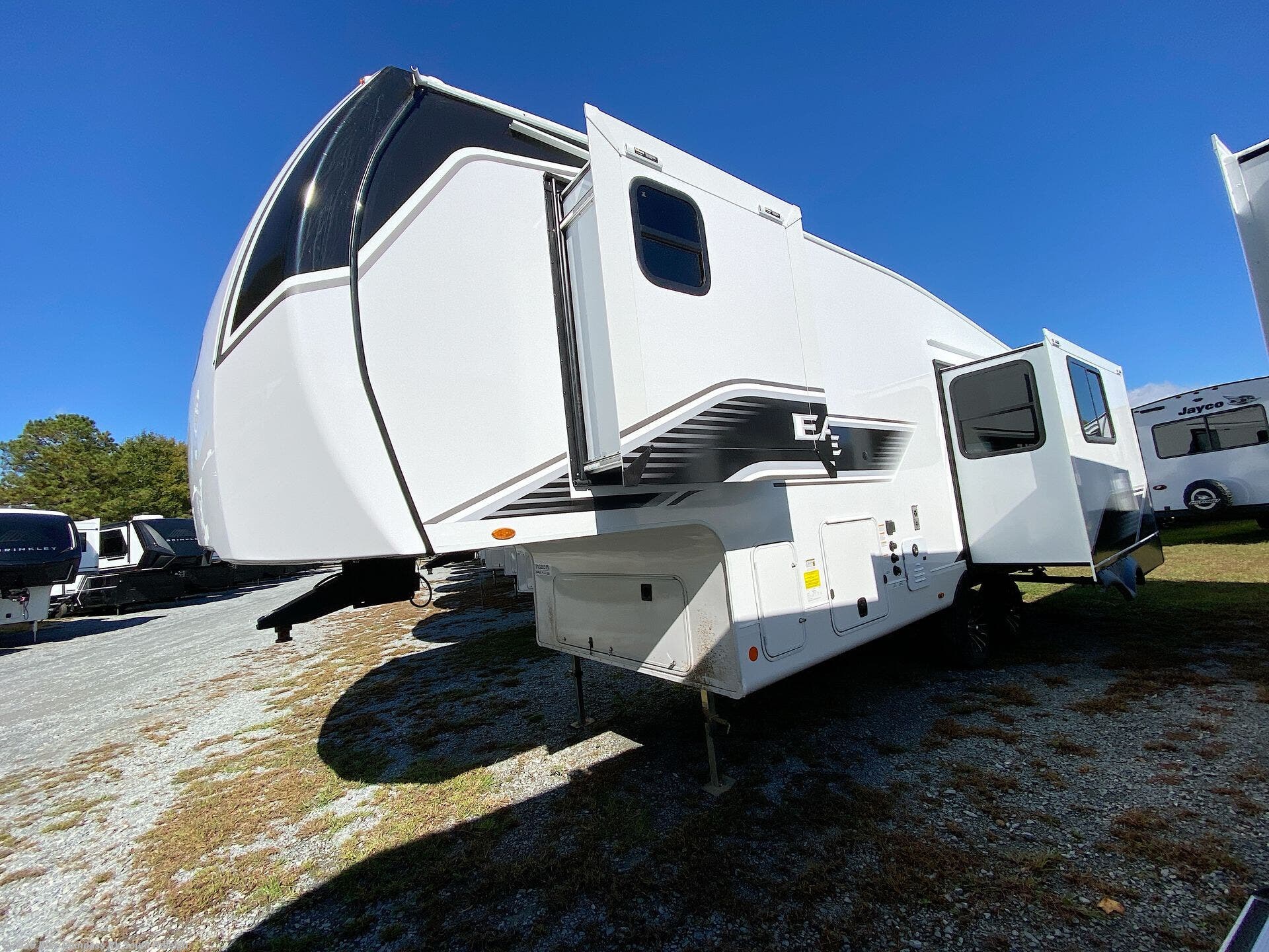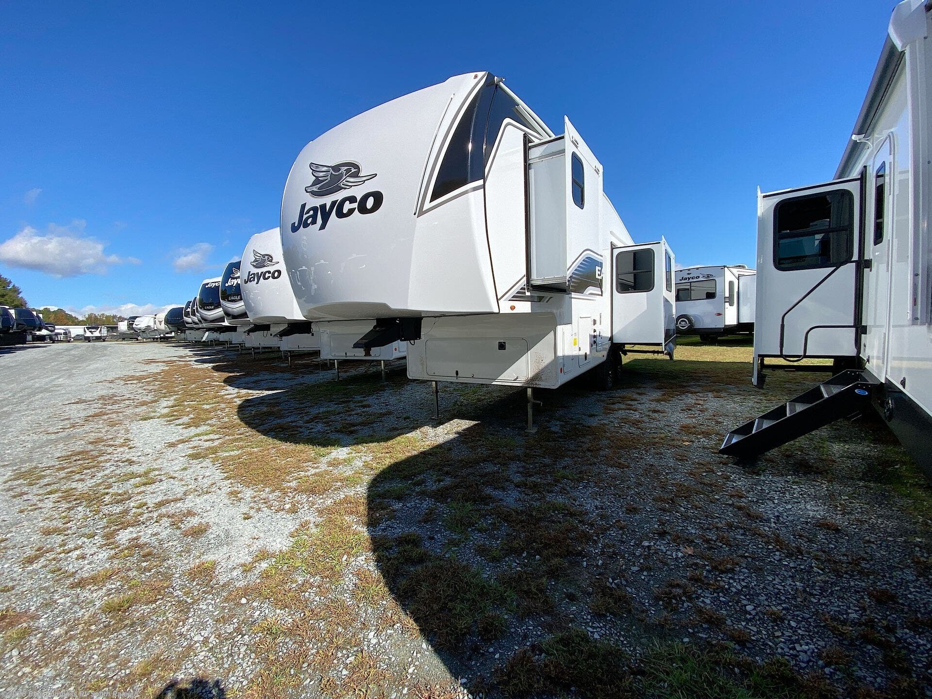 With any Eagle SLE fifth wheel by Jayco, you will enjoy a lighter tow weight, high-end finishes, and the same quality construction you've come to expect from Jayco! There is an Alpha Ply TPO roof membrane, a fully enclosed and heated underbelly, plus Stronghold VBL walls for added durability. There is also a rear 2" towing receiver outside, along with metal slam latch baggage doors, MORryde Step Above entry steps, and a Winegard Air 360 antenna with router prep if you want to stay connected as you camp. Once inside you'll enjoy the handcrafted and glazed door/drawer fronts, blackout pleated shades throughout, and residential vinyl flooring throughout with no carpet for an easier clean. The on-demand water heater, 30K BTU furnace, and 15K BTU "Whisper Quiet" A/C will ensure your comfort year around, and the optional Overland 1 Solar Package can be added if you need off-grid capabilities!