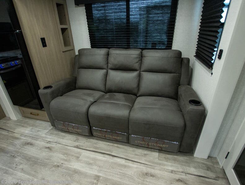 Camping just got a whole lot sweeter in this fifth wheel with double slides, a rear kitchen, and sleeping space for five to six. You'll love waking up each morning in the front private bedroom that includes a queen bed, dual nightstands and overhead cabinets, plus a wardrobe and dresser slide. Your guests who slept on the tri-fold sofa and booth dinette can convert these back to seating space in the morning, and breakfast can be made in the rear kitchen. Here, you'll find ample counter space, a microwave and range, plus a pantry and 12V refrigerator for food storage. Outside, gear can be stored in the pass-thru storage area, and you're sure to enjoy the 16' power awning with LED Lights!