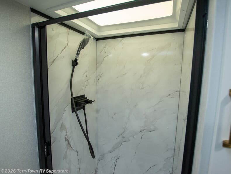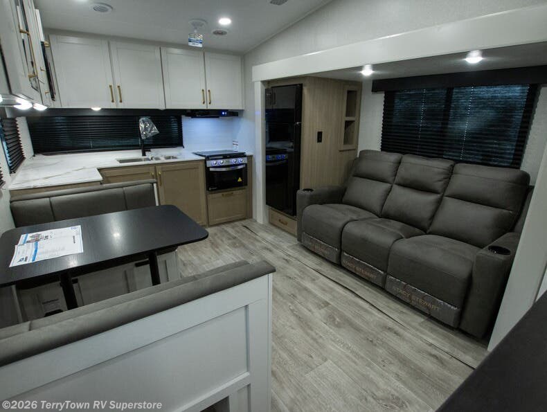 With any Eagle SLE fifth wheel by Jayco, you will enjoy a lighter tow weight, high-end finishes, and the same quality construction you've come to expect from Jayco! There is an Alpha Ply TPO roof membrane, a fully enclosed and heated underbelly, plus Stronghold VBL walls for added durability. There is also a rear 2" towing receiver outside, along with metal slam latch baggage doors, MORryde Step Above entry steps, and a Winegard Air 360 antenna with router prep if you want to stay connected as you camp. Once inside you'll enjoy the handcrafted door/drawer fronts, shower skylight, and residential vinyl flooring throughout with no carpet for an easier clean. The on-demand water heater, 30K BTU furnace, and 15K BTU "Whisper Quiet" A/C will ensure your comfort, and the Overland 1 Solar Package will provide off-grid capabilities!