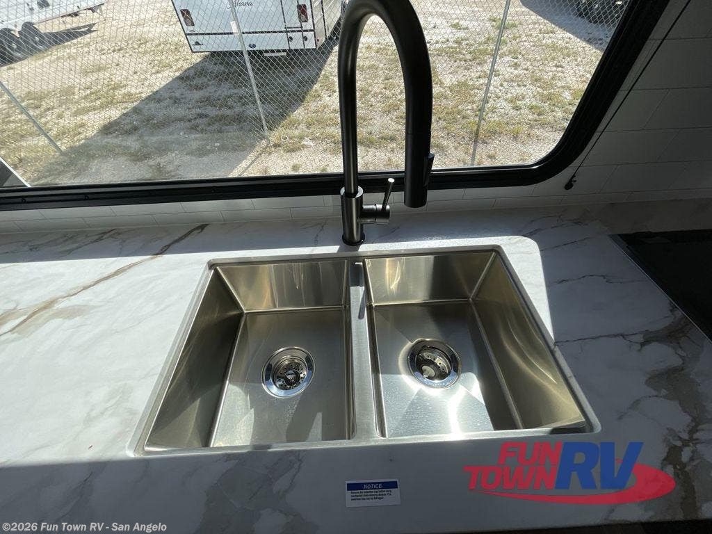 Camping just got a whole lot sweeter in this fifth wheel with double slides, a rear kitchen, and sleeping space for five to six. You'll love waking up each morning in the front private bedroom that includes a queen bed, dual nightstands and overhead cabinets, plus a wardrobe and dresser slide. Your guests who slept on the tri-fold sofa and booth dinette can convert these back to seating space in the morning, and breakfast can be made in the rear kitchen. Here, you'll find ample counter space, a microwave and range, plus a pantry and 12V refrigerator for food storage. Outside, gear can be stored in the pass-thru storage area, and you're sure to enjoy the 16' power awning with LED Lights!
