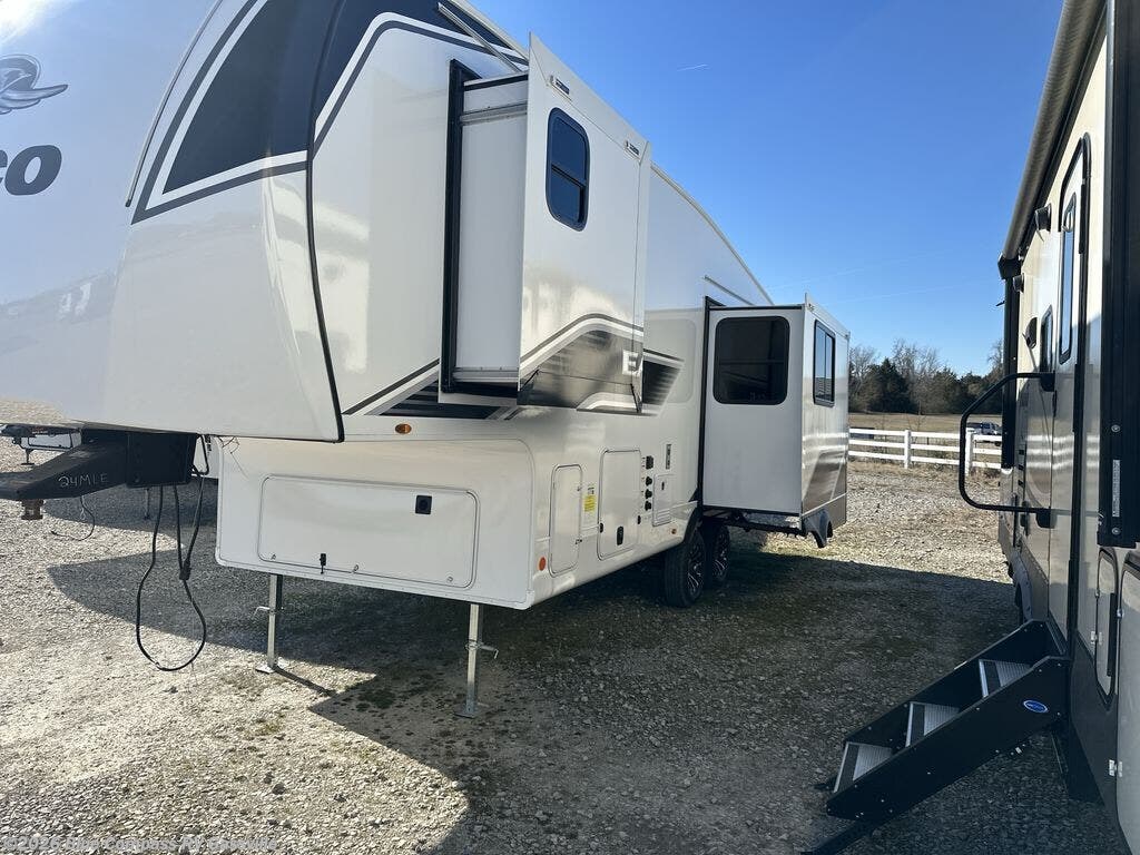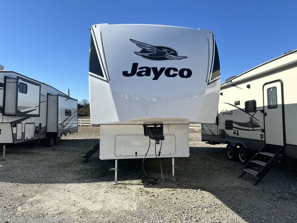 With any Eagle SLE fifth wheel by Jayco, you will enjoy a lighter tow weight, high-end finishes, and the same quality construction you've come to expect from Jayco! There is an Alpha Ply TPO roof membrane, a fully enclosed and heated underbelly, plus Stronghold VBL walls for added durability. There is also a rear 2" towing receiver outside, along with metal slam latch baggage doors, MORryde Step Above entry steps, and a Winegard Air 360 antenna with router prep if you want to stay connected as you camp. Once inside you'll enjoy the handcrafted door/drawer fronts, shower skylight, and residential vinyl flooring throughout with no carpet for an easier clean. The on-demand water heater, 30K BTU furnace, and 15K BTU "Whisper Quiet" A/C will ensure your comfort, and the Overland 1 Solar Package will provide off-grid capabilities!