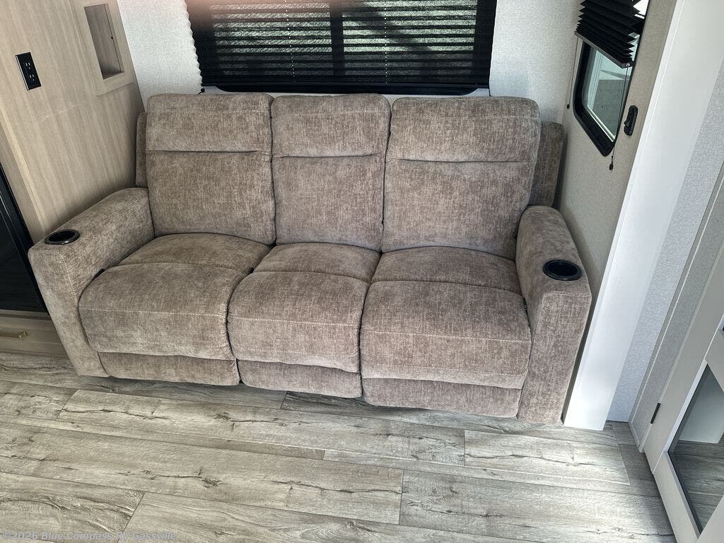 Camping just got a whole lot sweeter in this fifth wheel with double slides, a rear kitchen, and sleeping space for five to six. You'll love waking up each morning in the front private bedroom that includes a queen bed, dual nightstands and overhead cabinets, plus a wardrobe and dresser slide. Your guests who slept on the tri-fold sofa and booth dinette can convert these back to seating space in the morning, and breakfast can be made in the rear kitchen. Here, you'll find ample counter space, a microwave and range, plus a pantry and 12V refrigerator for food storage. Outside, gear can be stored in the pass-thru storage area, and you're sure to enjoy the 16' power awning with LED Lights!