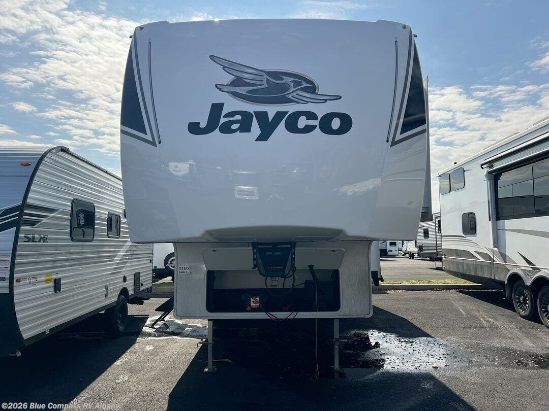 With any Eagle SLE fifth wheel by Jayco, you will enjoy a lighter tow weight, high-end finishes, and the same quality construction you've come to expect from Jayco! There is an Alpha Ply TPO roof membrane, a fully enclosed and heated underbelly, plus Stronghold VBL walls for added durability. There is also a rear 2" towing receiver outside, along with metal slam latch baggage doors, MORryde Step Above entry steps, and a Winegard Air 360 antenna with router prep if you want to stay connected as you camp. Once inside you'll enjoy the handcrafted door/drawer fronts, shower skylight, and residential vinyl flooring throughout with no carpet for an easier clean. The on-demand water heater, 30K BTU furnace, and 15K BTU "Whisper Quiet" A/C will ensure your comfort, and the Overland 1 Solar Package will provide off-grid capabilities!