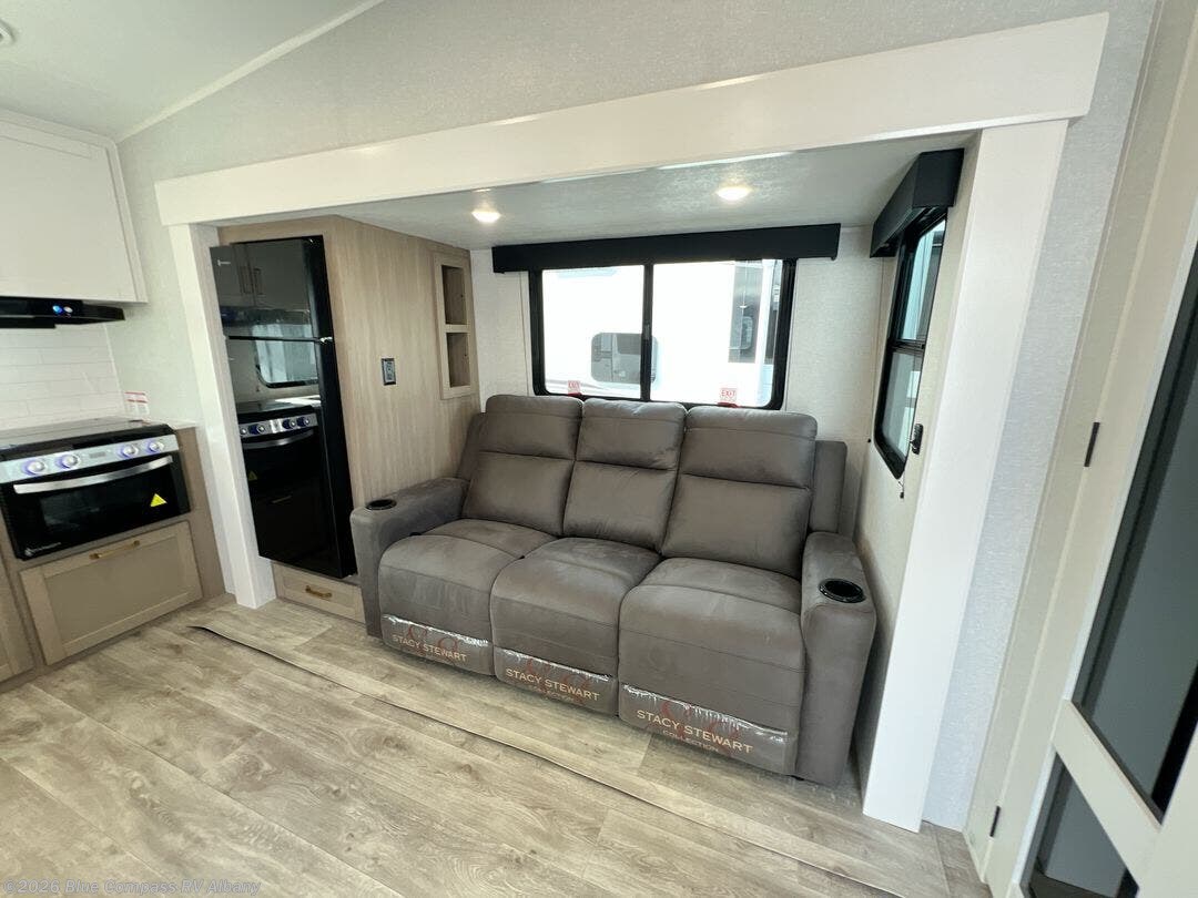Camping just got a whole lot sweeter in this fifth wheel with double slides, a rear kitchen, and sleeping space for five to six. You'll love waking up each morning in the front private bedroom that includes a queen bed, dual nightstands and overhead cabinets, plus a wardrobe and dresser slide. Your guests who slept on the tri-fold sofa and booth dinette can convert these back to seating space in the morning, and breakfast can be made in the rear kitchen. Here, you'll find ample counter space, a microwave and range, plus a pantry and 12V refrigerator for food storage. Outside, gear can be stored in the pass-thru storage area, and you're sure to enjoy the 16' power awning with LED Lights!