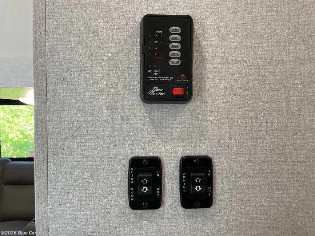 Camping just got a whole lot sweeter in this fifth wheel with double slides, a rear kitchen, and sleeping space for five to six. You'll love waking up each morning in the front private bedroom that includes a queen bed, dual nightstands and overhead cabinets, plus a wardrobe and dresser slide. Your guests who slept on the tri-fold sofa and booth dinette can convert these back to seating space in the morning, and breakfast can be made in the rear kitchen. Here, you'll find ample counter space, a microwave and range, plus a pantry and 12V refrigerator for food storage. Outside, gear can be stored in the pass-thru storage area, and you're sure to enjoy the 16' power awning with LED Lights!