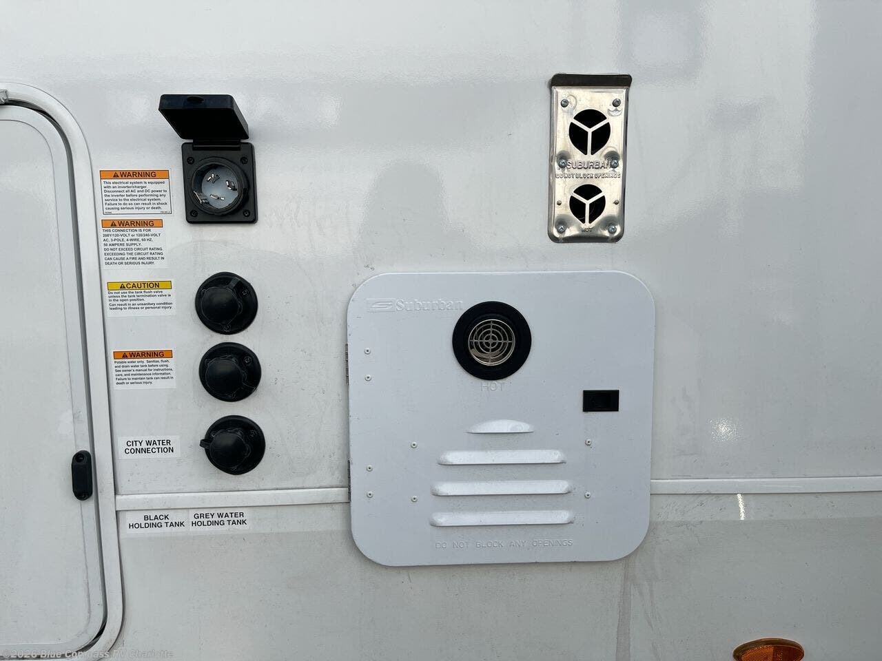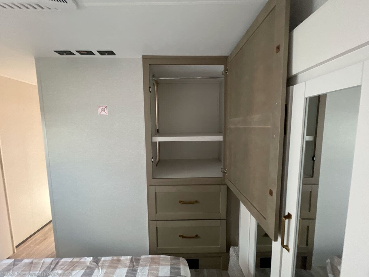 Camping just got a whole lot sweeter in this fifth wheel with double slides, a rear kitchen, and sleeping space for five to six. You'll love waking up each morning in the front private bedroom that includes a queen bed, dual nightstands and overhead cabinets, plus a wardrobe and dresser slide. Your guests who slept on the tri-fold sofa and booth dinette can convert these back to seating space in the morning, and breakfast can be made in the rear kitchen. Here, you'll find ample counter space, a microwave and range, plus a pantry and 12V refrigerator for food storage. Outside, gear can be stored in the pass-thru storage area, and you're sure to enjoy the 16' power awning with LED Lights!