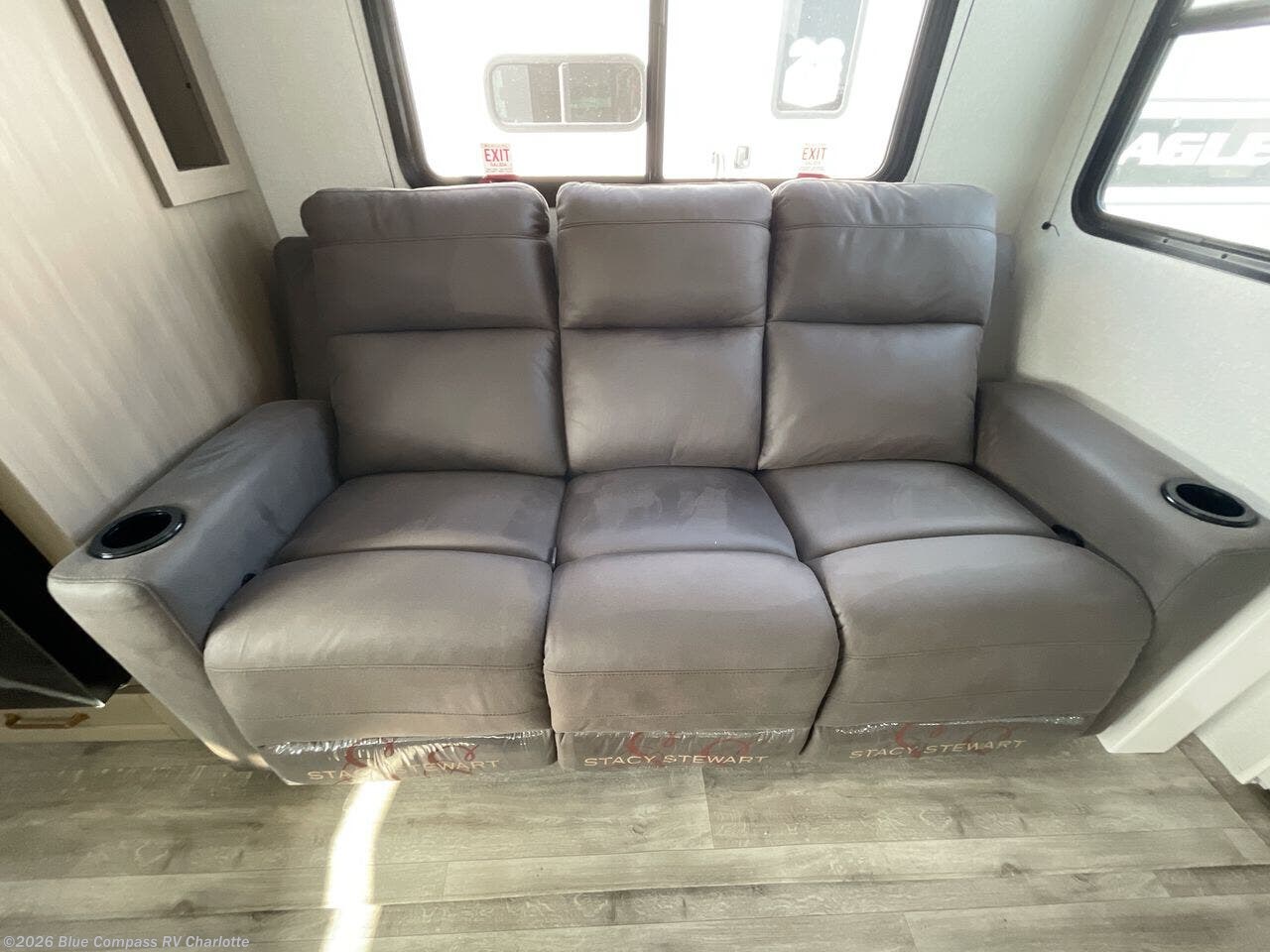 With any Eagle SLE fifth wheel by Jayco, you will enjoy a lighter tow weight, high-end finishes, and the same quality construction you've come to expect from Jayco! There is an Alpha Ply TPO roof membrane, a fully enclosed and heated underbelly, plus Stronghold VBL walls for added durability. There is also a rear 2" towing receiver outside, along with metal slam latch baggage doors, MORryde Step Above entry steps, and a Winegard Air 360 antenna with router prep if you want to stay connected as you camp. Once inside you'll enjoy the handcrafted door/drawer fronts, shower skylight, and residential vinyl flooring throughout with no carpet for an easier clean. The on-demand water heater, 30K BTU furnace, and 15K BTU "Whisper Quiet" A/C will ensure your comfort, and the Overland 1 Solar Package will provide off-grid capabilities!