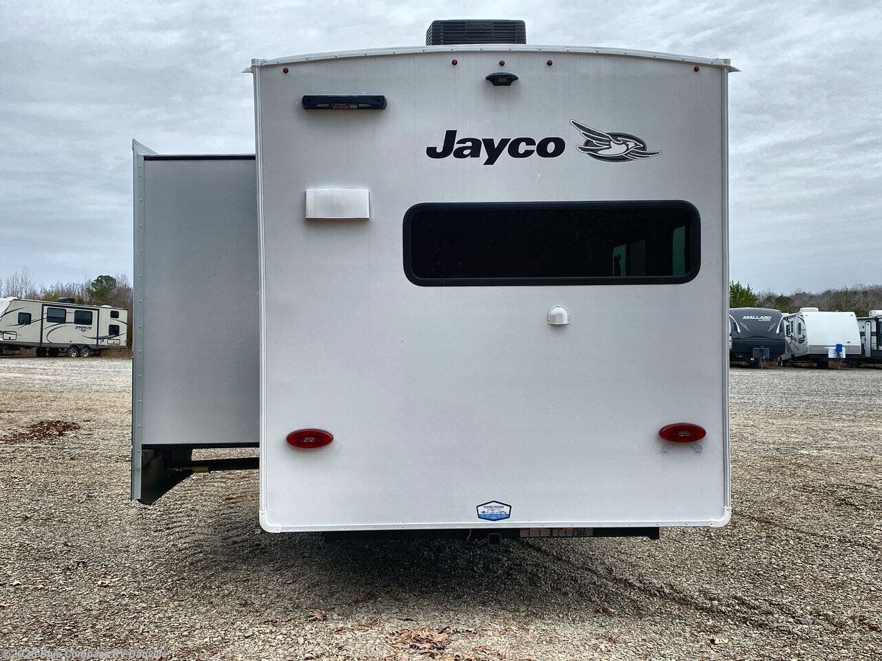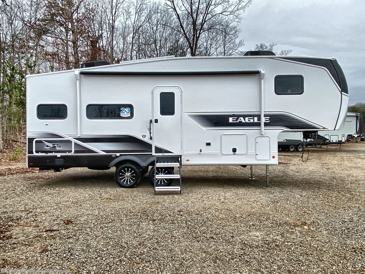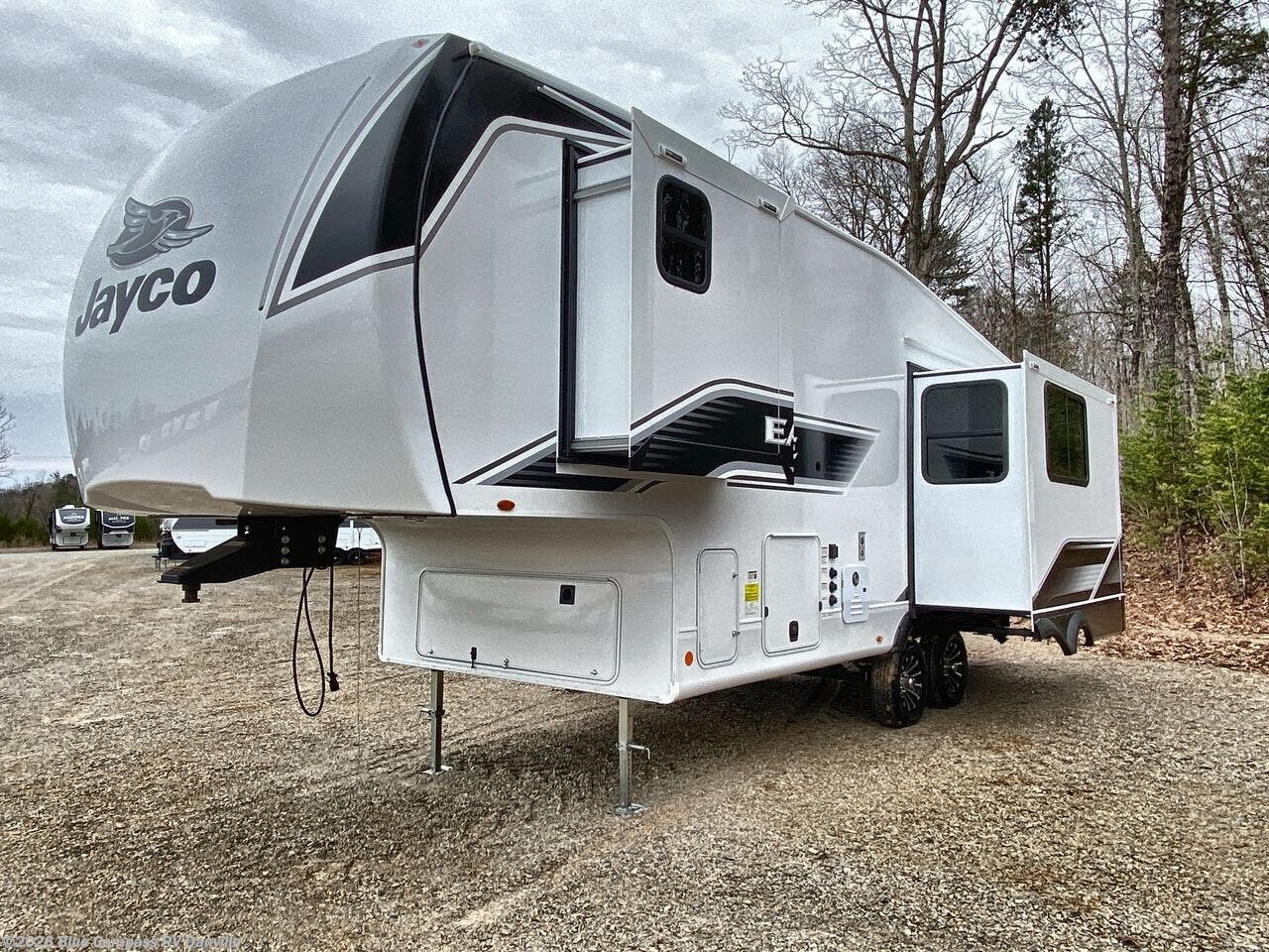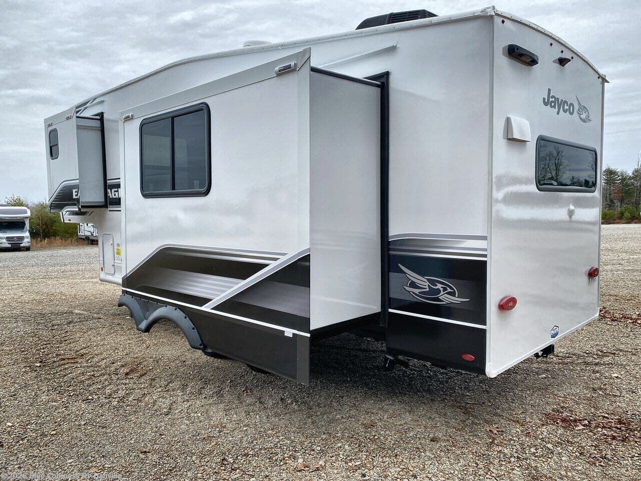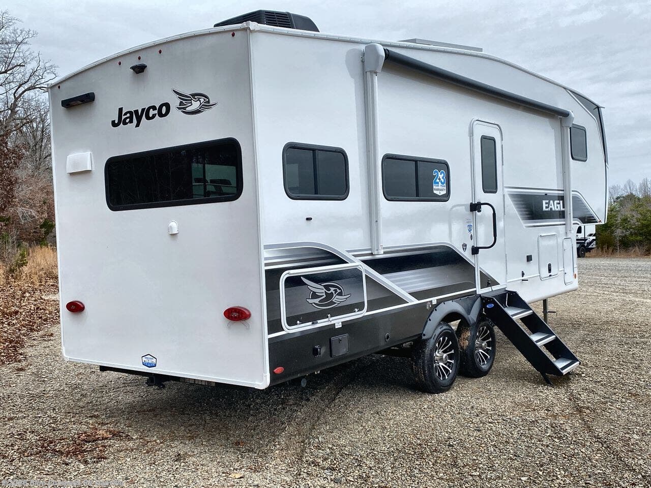 With any Eagle SLE fifth wheel by Jayco, you will enjoy a lighter tow weight, high-end finishes, and the same quality construction you've come to expect from Jayco! There is an Alpha Ply TPO roof membrane, a fully enclosed and heated underbelly, plus Stronghold VBL walls for added durability. There is also a rear 2" towing receiver outside, along with metal slam latch baggage doors, MORryde Step Above entry steps, and a Winegard Air 360 antenna with router prep if you want to stay connected as you camp. Once inside you'll enjoy the handcrafted door/drawer fronts, shower skylight, and residential vinyl flooring throughout with no carpet for an easier clean. The on-demand water heater, 30K BTU furnace, and 15K BTU "Whisper Quiet" A/C will ensure your comfort, and the Overland 1 Solar Package will provide off-grid capabilities!