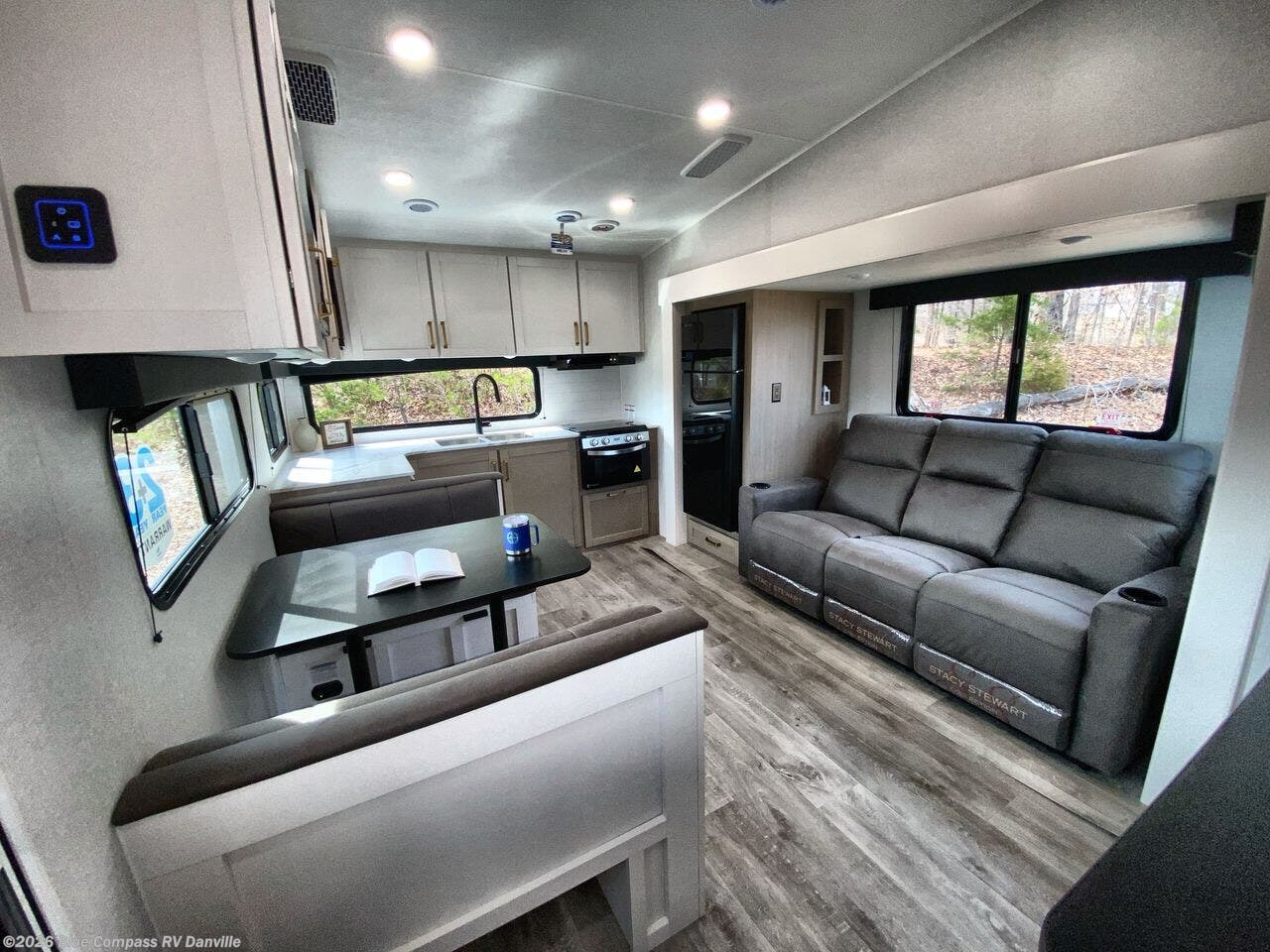 Camping just got a whole lot sweeter in this fifth wheel with double slides, a rear kitchen, and sleeping space for five to six. You'll love waking up each morning in the front private bedroom that includes a queen bed, dual nightstands and overhead cabinets, plus a wardrobe and dresser slide. Your guests who slept on the tri-fold sofa and booth dinette can convert these back to seating space in the morning, and breakfast can be made in the rear kitchen. Here, you'll find ample counter space, a microwave and range, plus a pantry and 12V refrigerator for food storage. Outside, gear can be stored in the pass-thru storage area, and you're sure to enjoy the 16' power awning with LED Lights!