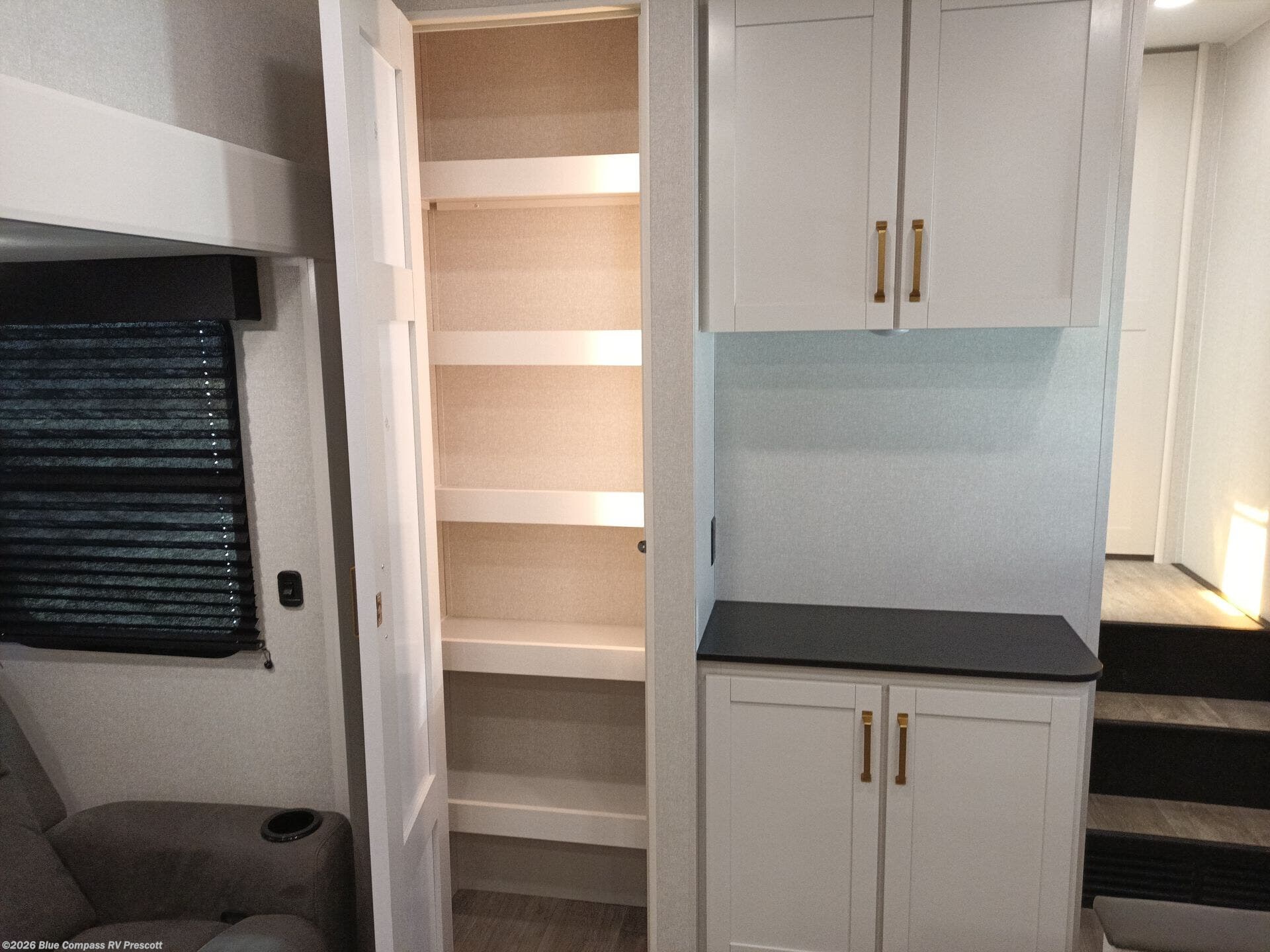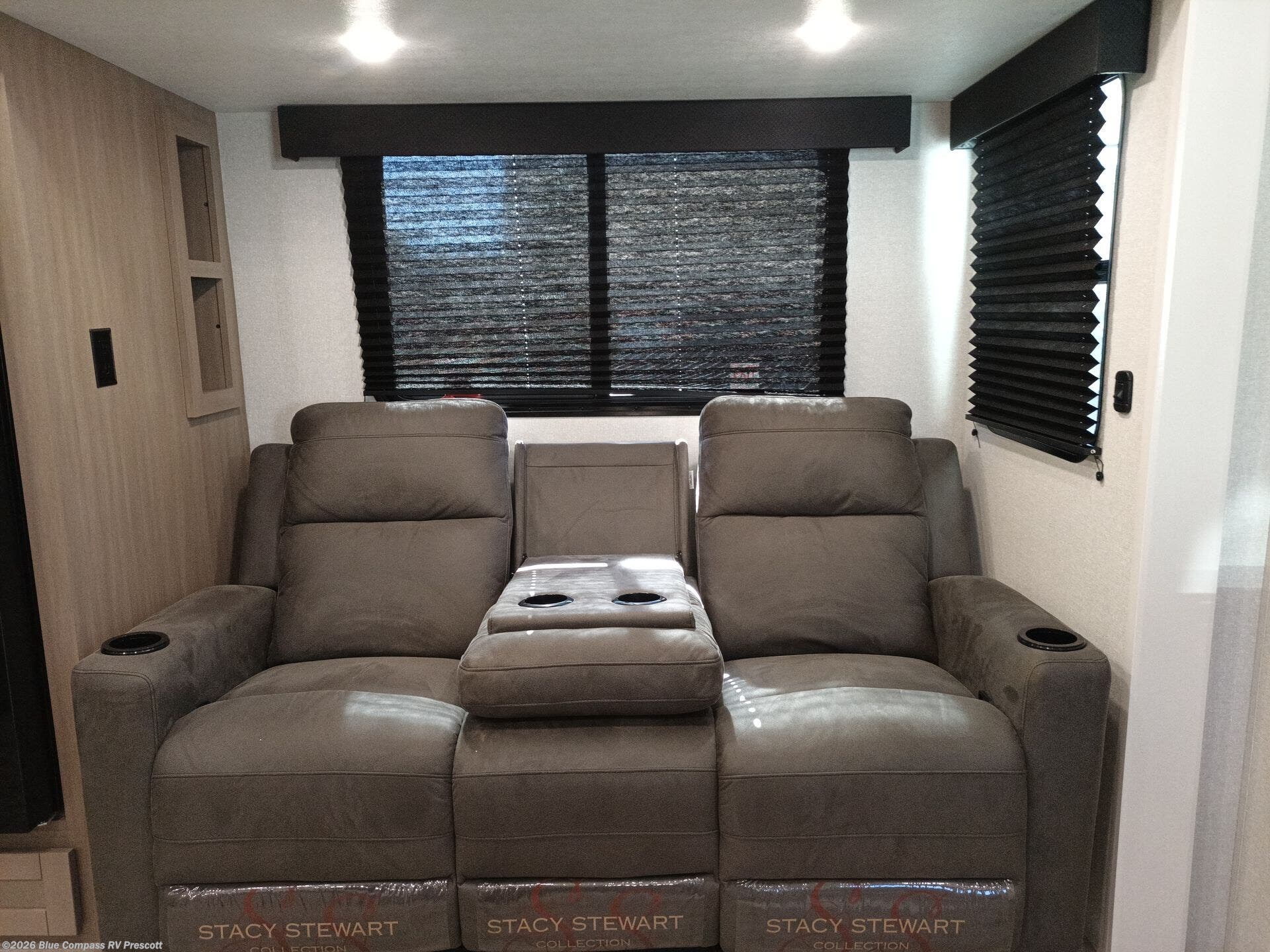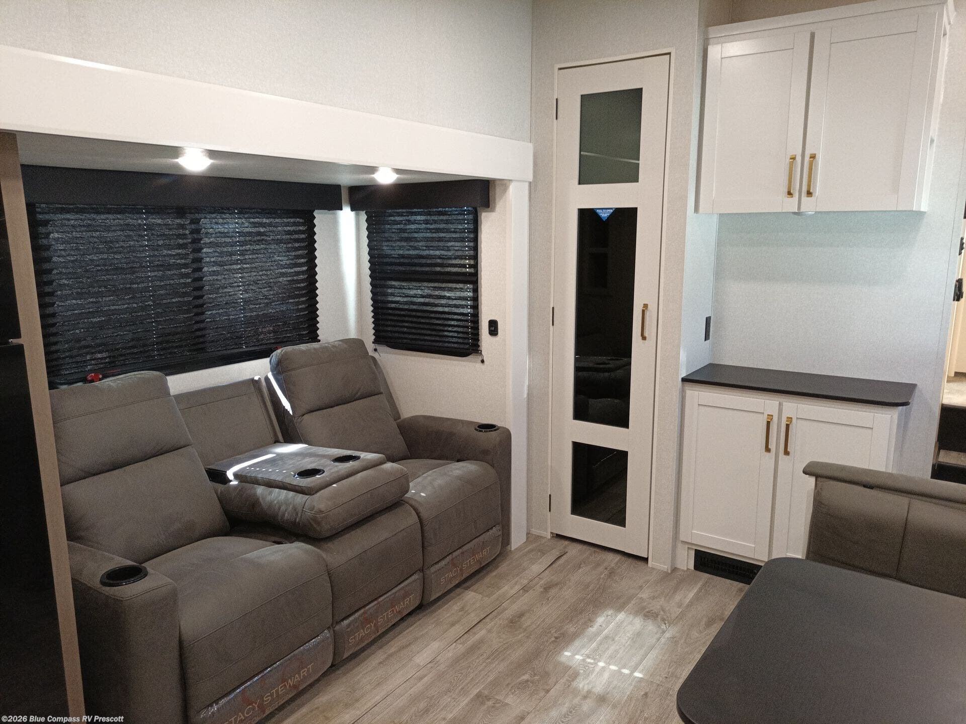 Camping just got a whole lot sweeter in this fifth wheel with double slides, a rear kitchen, and sleeping space for five to six. You'll love waking up each morning in the front private bedroom that includes a queen bed, dual nightstands and overhead cabinets, plus a wardrobe and dresser slide. Your guests who slept on the tri-fold sofa and booth dinette can convert these back to seating space in the morning, and breakfast can be made in the rear kitchen. Here, you'll find ample counter space, a microwave and range, plus a pantry and 12V refrigerator for food storage. Outside, gear can be stored in the pass-thru storage area, and you're sure to enjoy the 16' power awning with LED Lights!