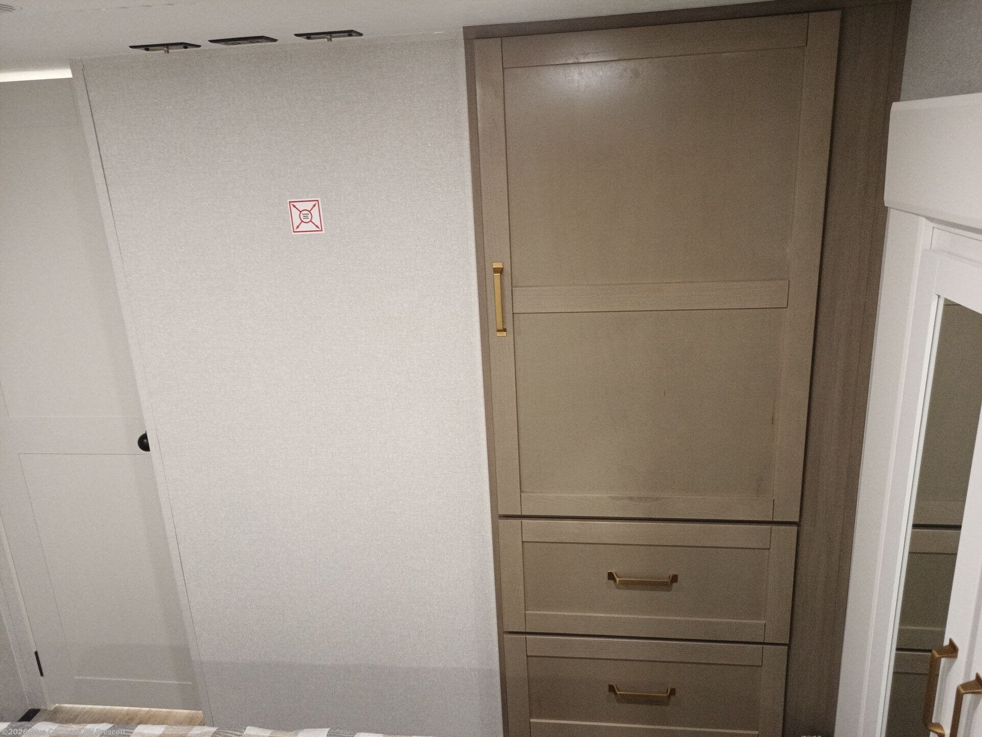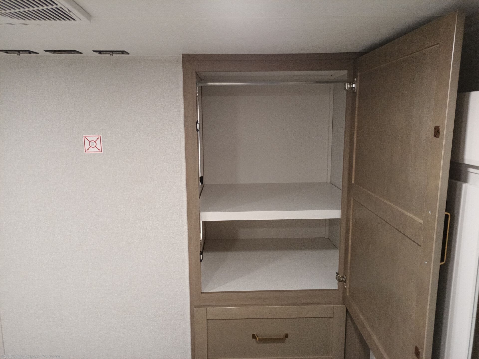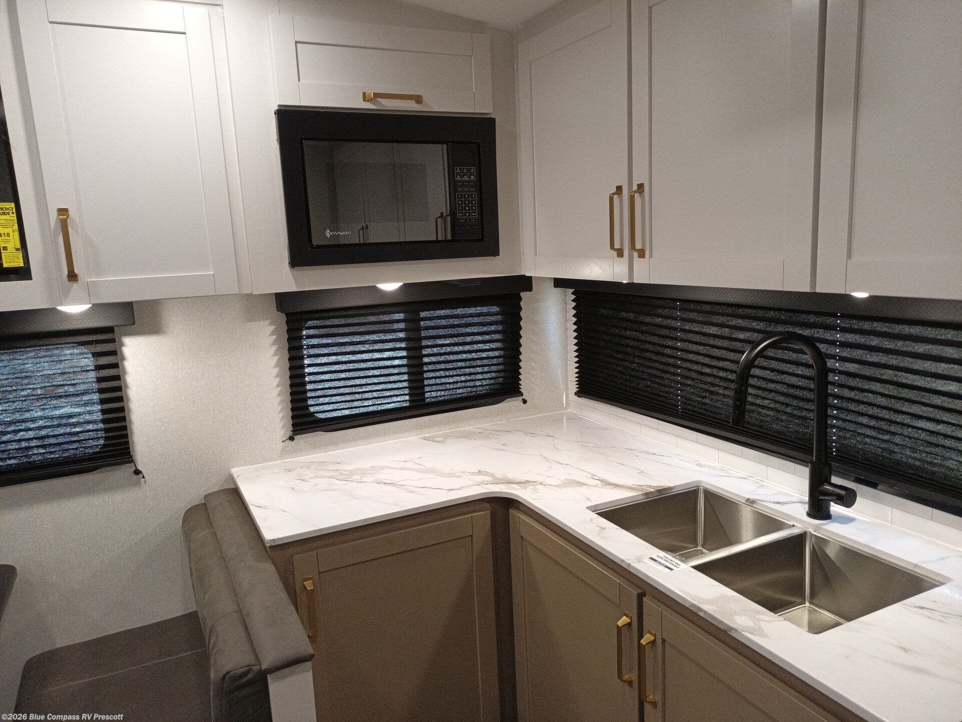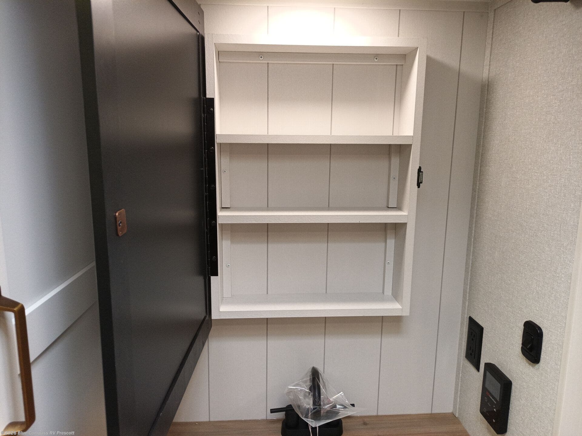 Camping just got a whole lot sweeter in this fifth wheel with double slides, a rear kitchen, and sleeping space for five to six. You'll love waking up each morning in the front private bedroom that includes a queen bed, dual nightstands and overhead cabinets, plus a wardrobe and dresser slide. Your guests who slept on the tri-fold sofa and booth dinette can convert these back to seating space in the morning, and breakfast can be made in the rear kitchen. Here, you'll find ample counter space, a microwave and range, plus a pantry and 12V refrigerator for food storage. Outside, gear can be stored in the pass-thru storage area, and you're sure to enjoy the 16' power awning with LED Lights!